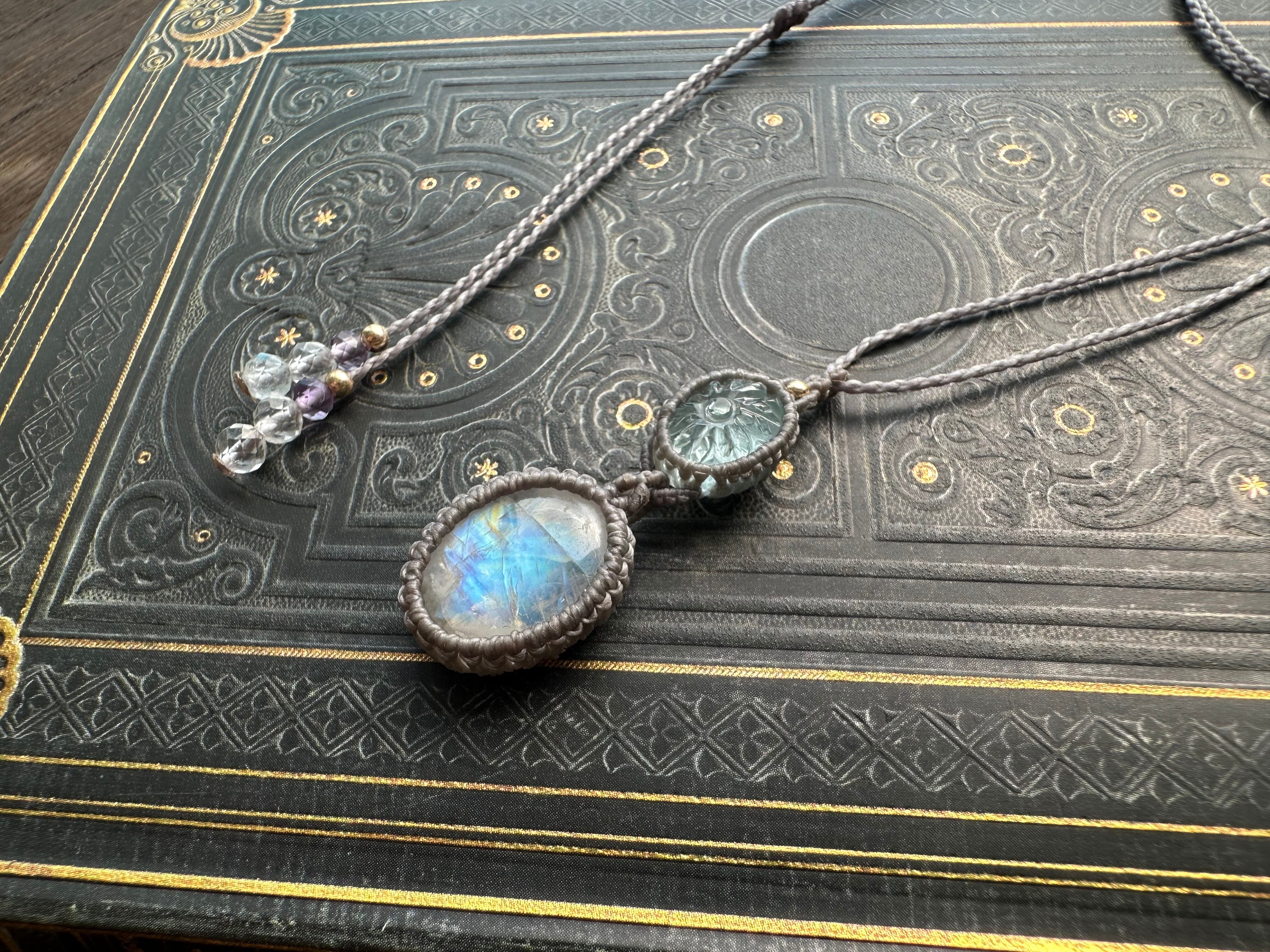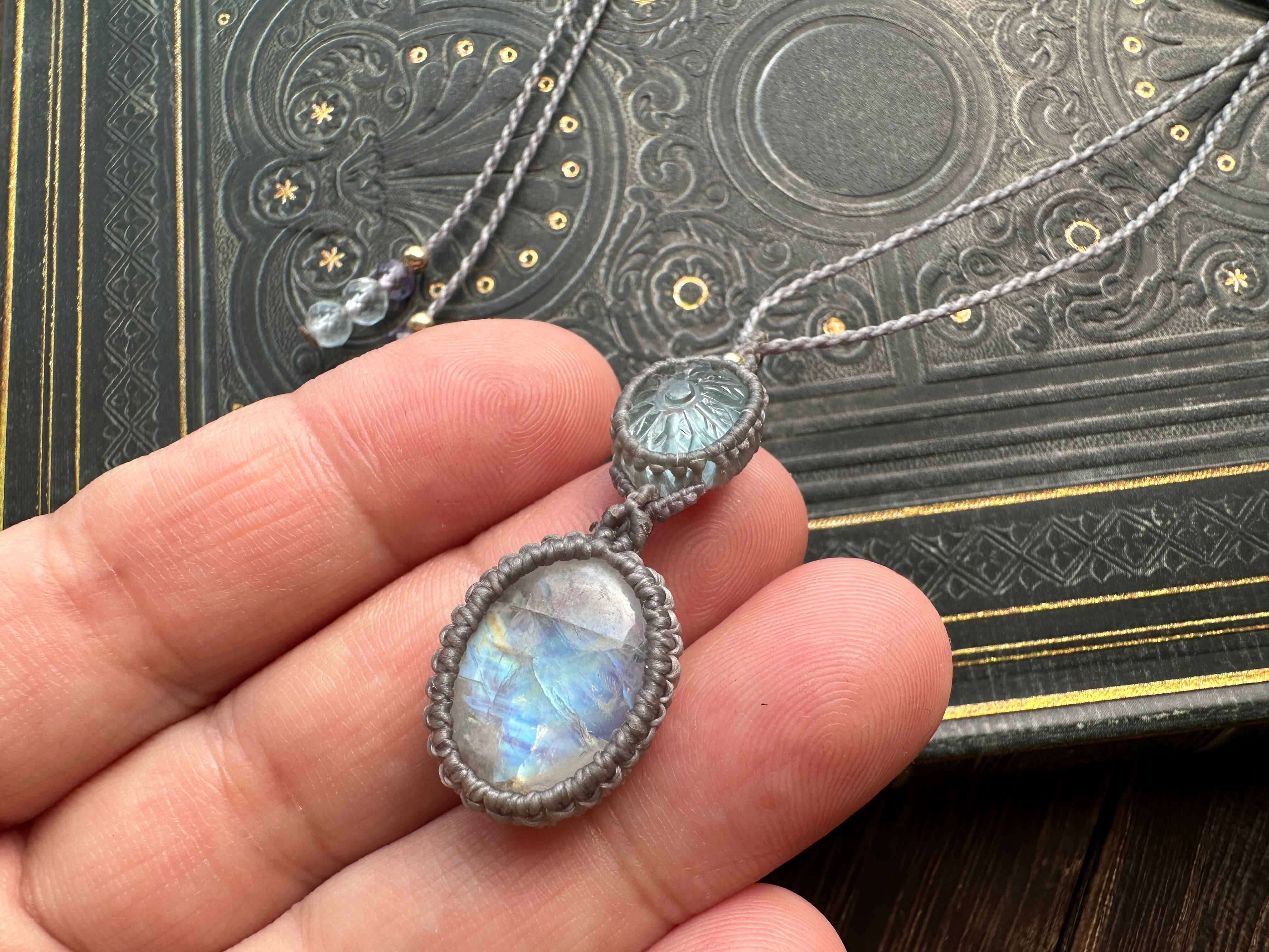 お花模様のアクアマリンとレインボームーンストーンのゆらゆらペンダント