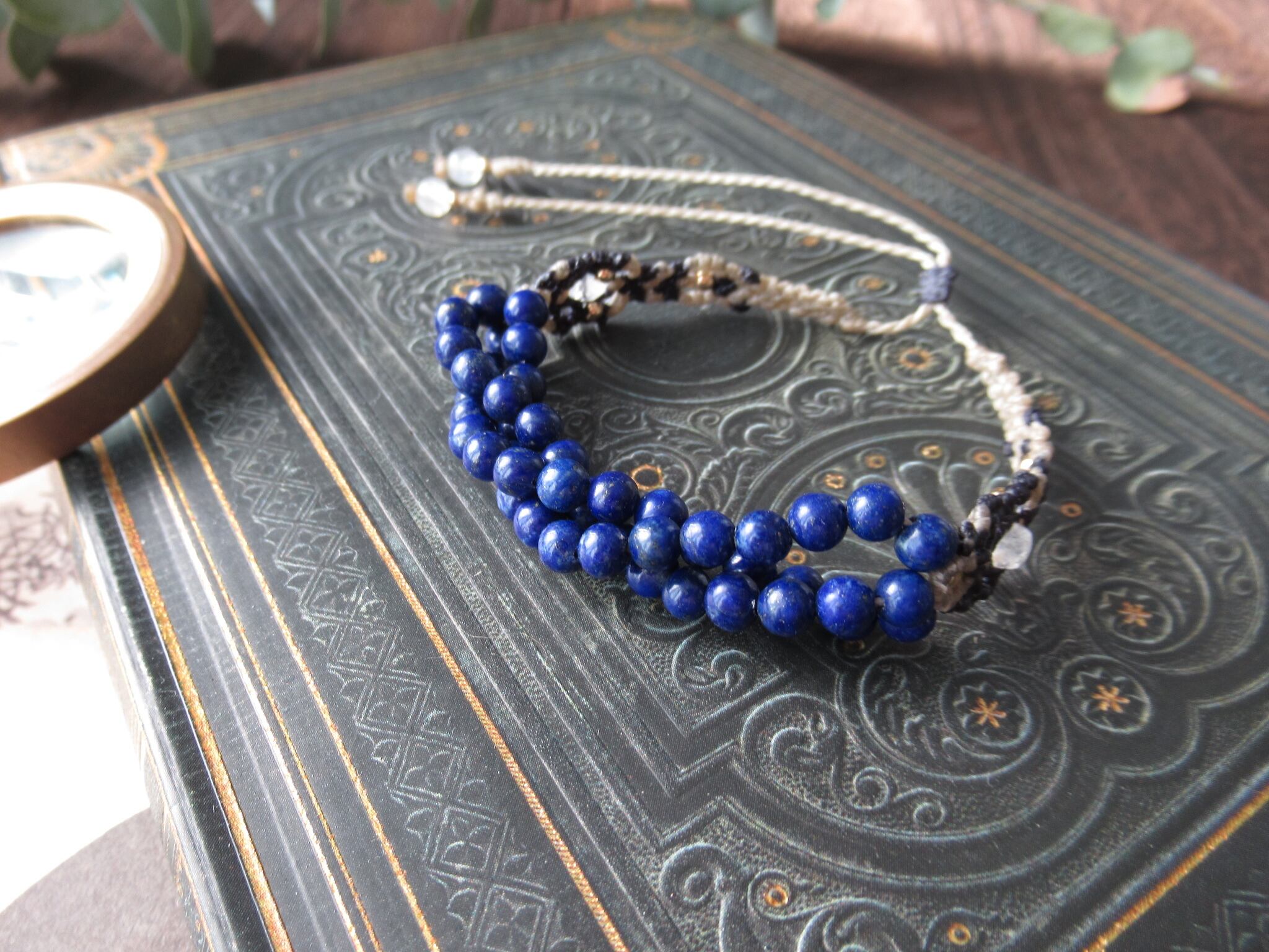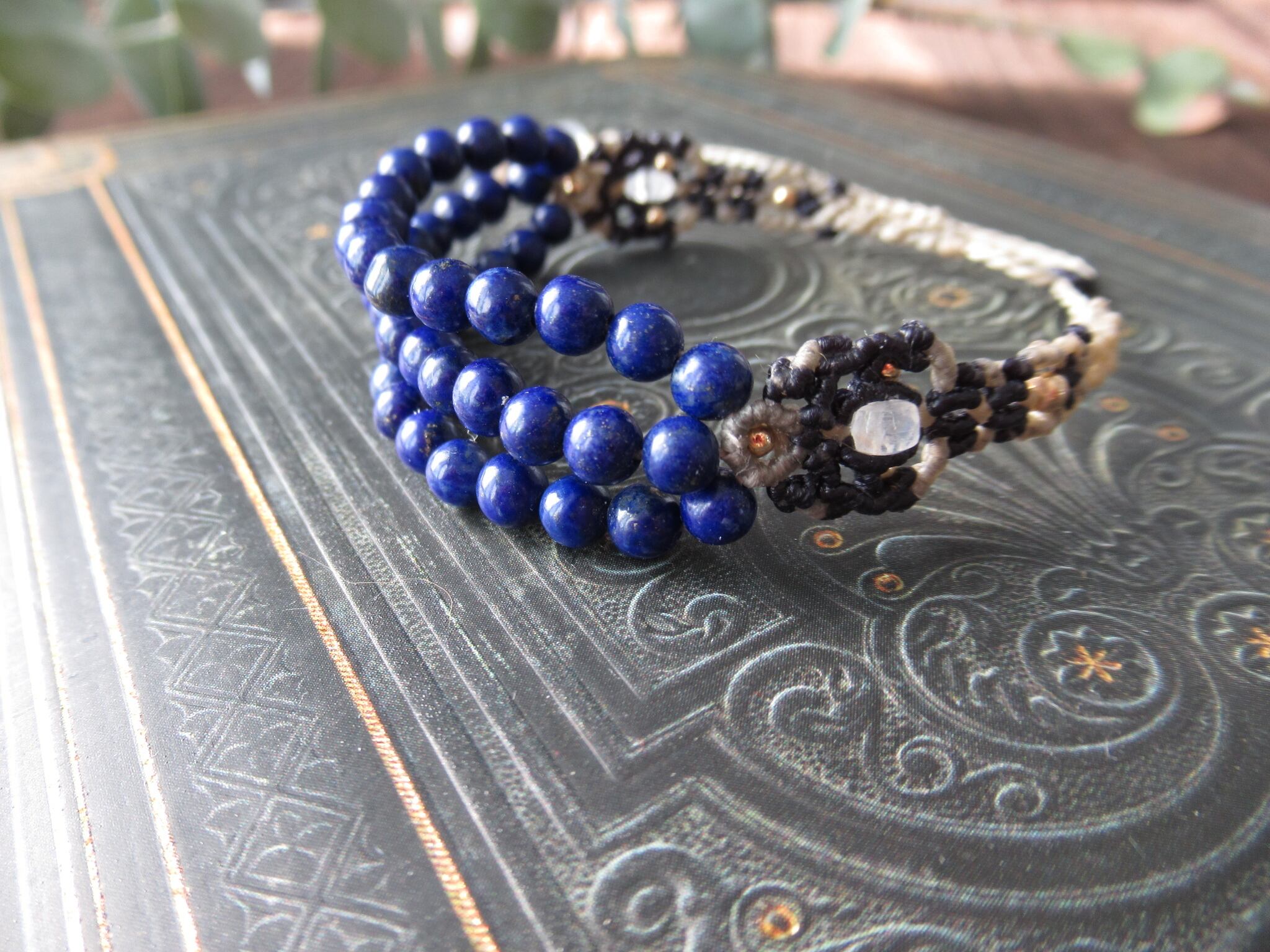 中央の三連のラピスラズリの両サイドにマクラメらしい編み込みを施し、天然石を埋め込むように編み込んでいます。編み込みの天然石は宝石質のレインボームーンストーンです。
