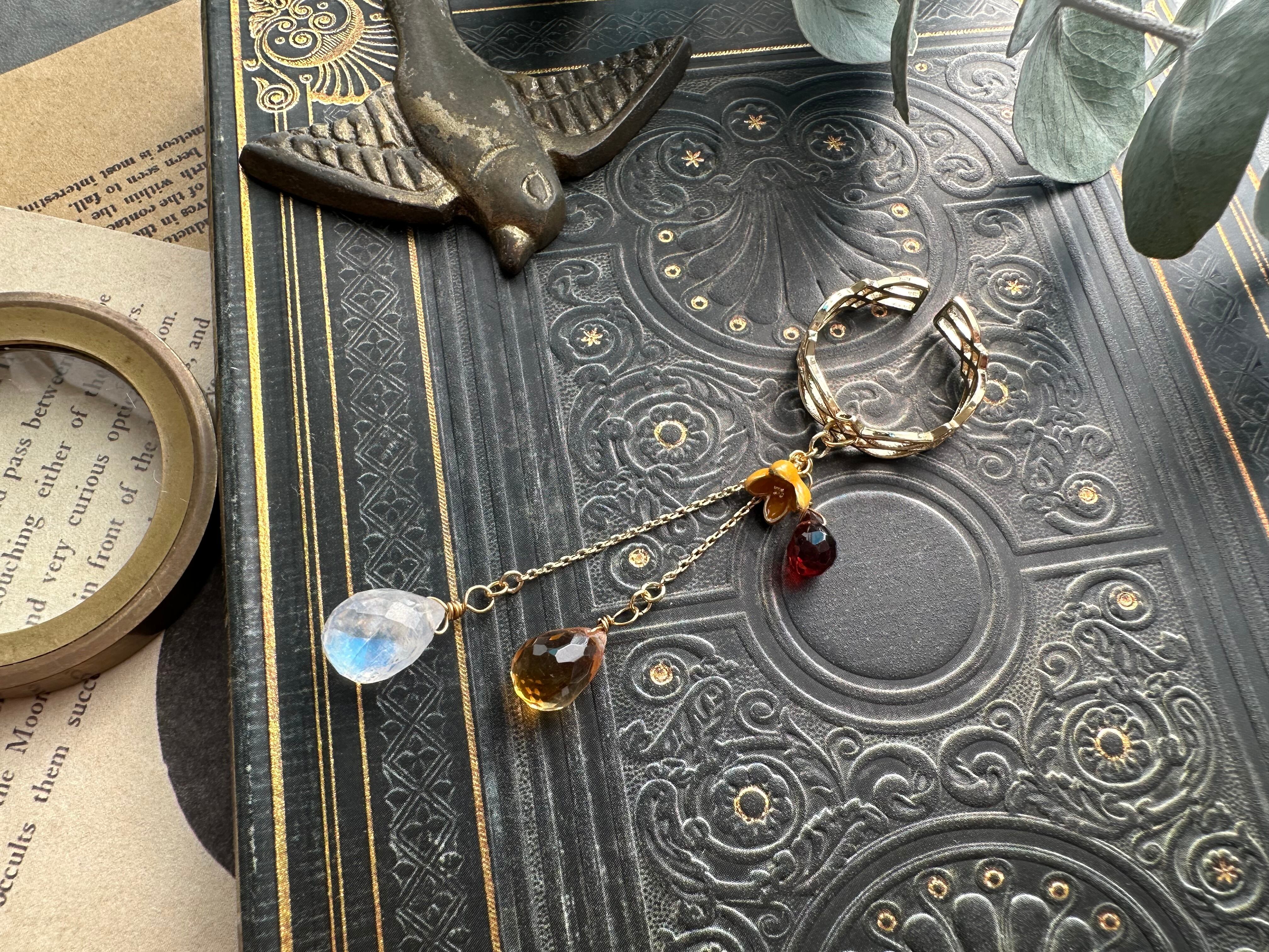 ≪片耳用≫ 蝋梅と揺れる天然石の雫のイヤーカフ / レインボームーンストーン×ガーネット×シトリン