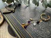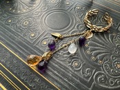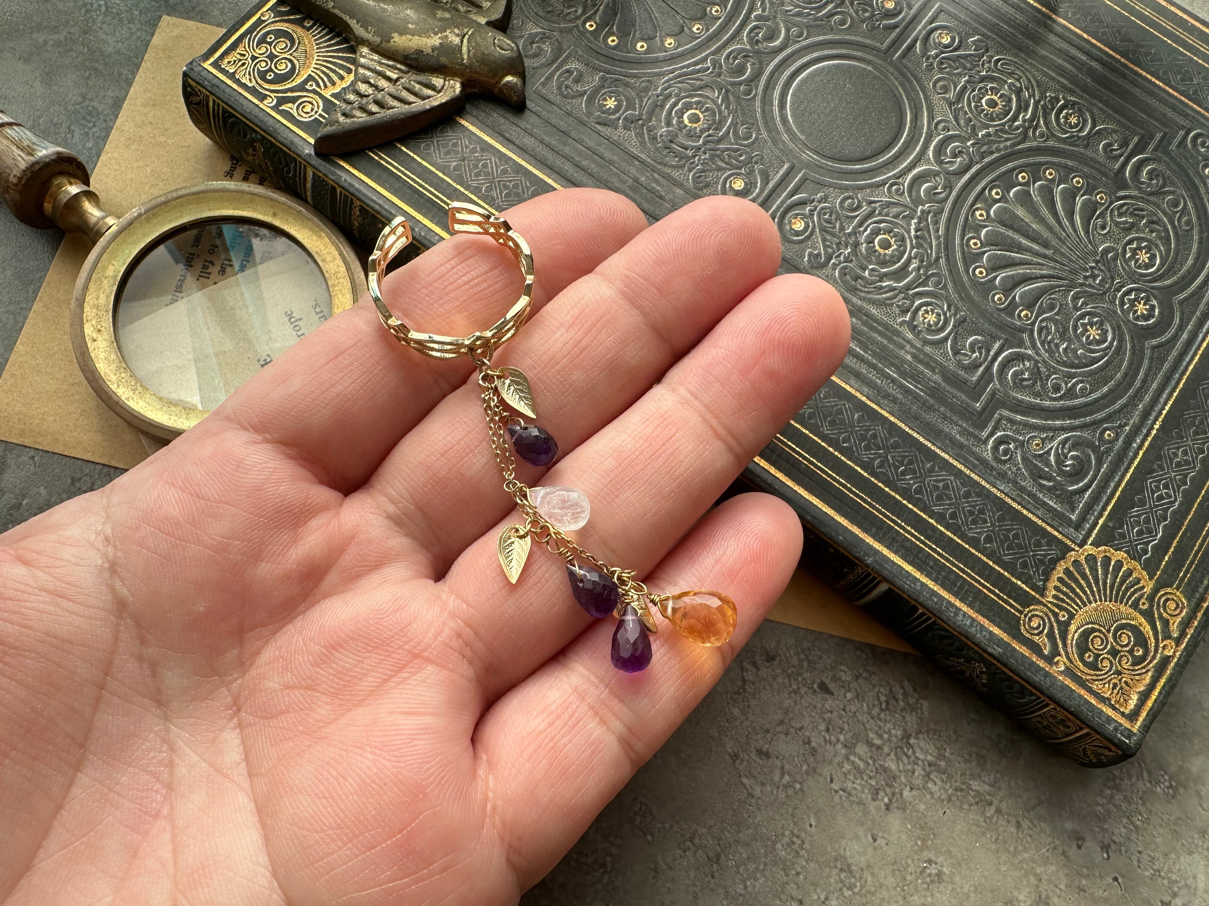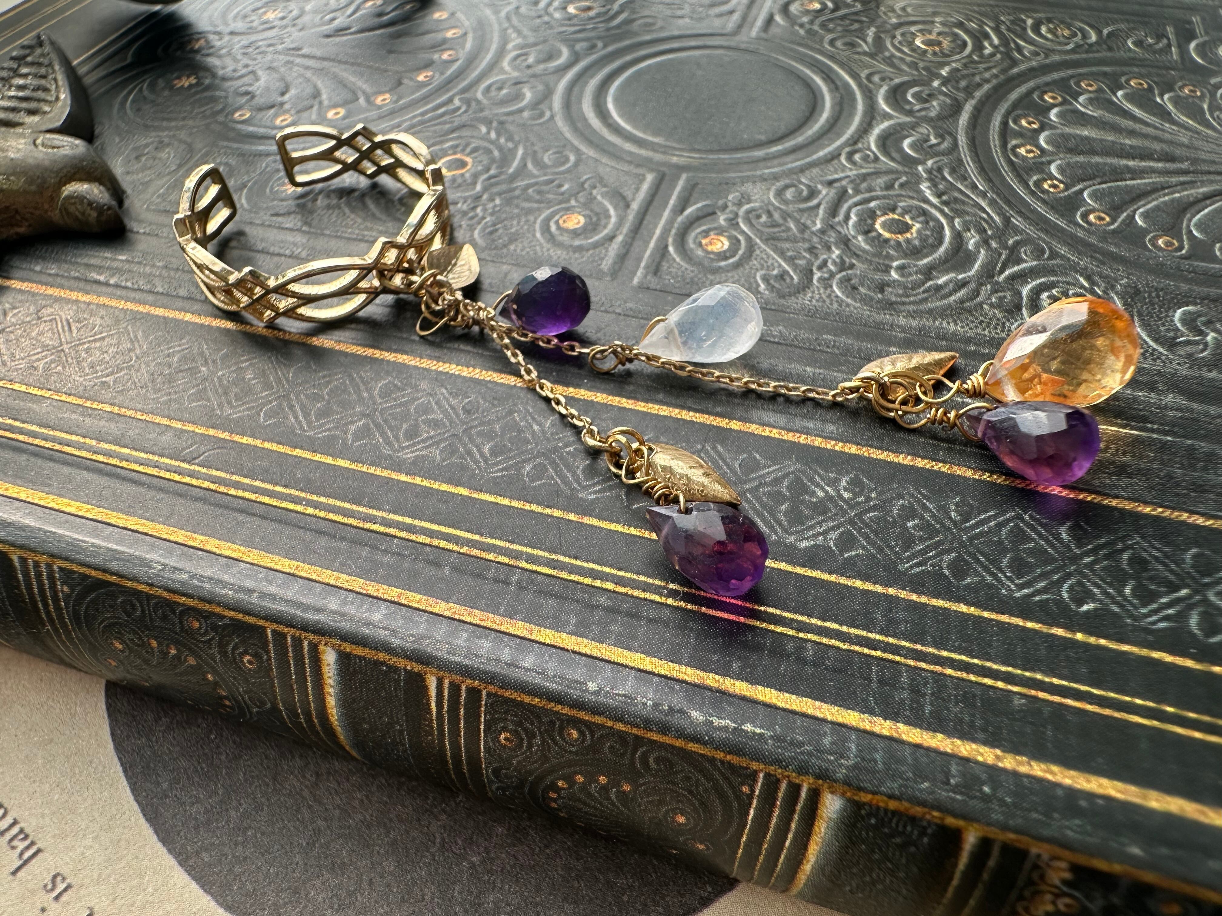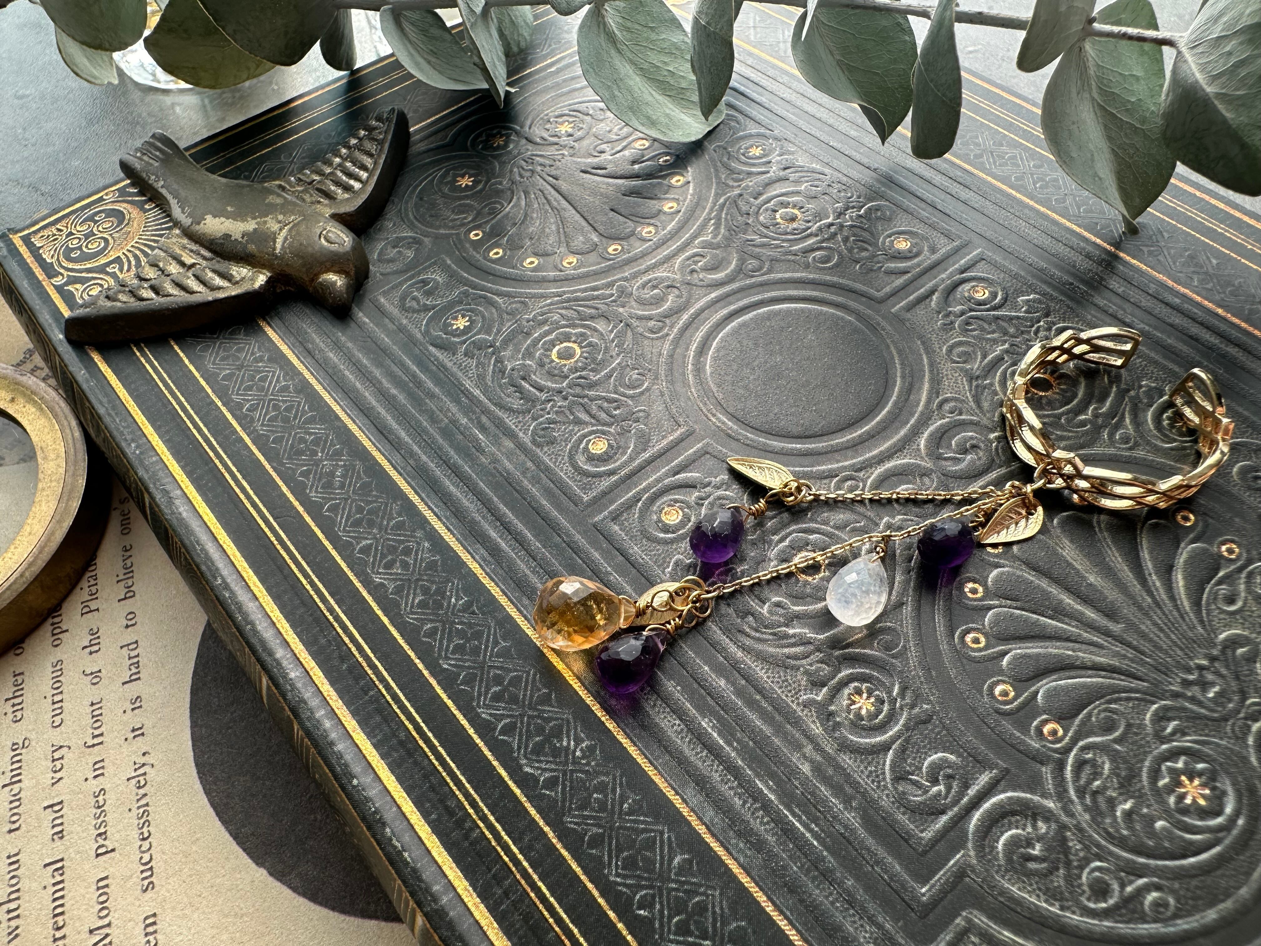 ≪片耳用≫ 黄金の葉と揺れる天然石の雫のイヤーカフ / レインボームーンストーン×アメジスト×シトリン