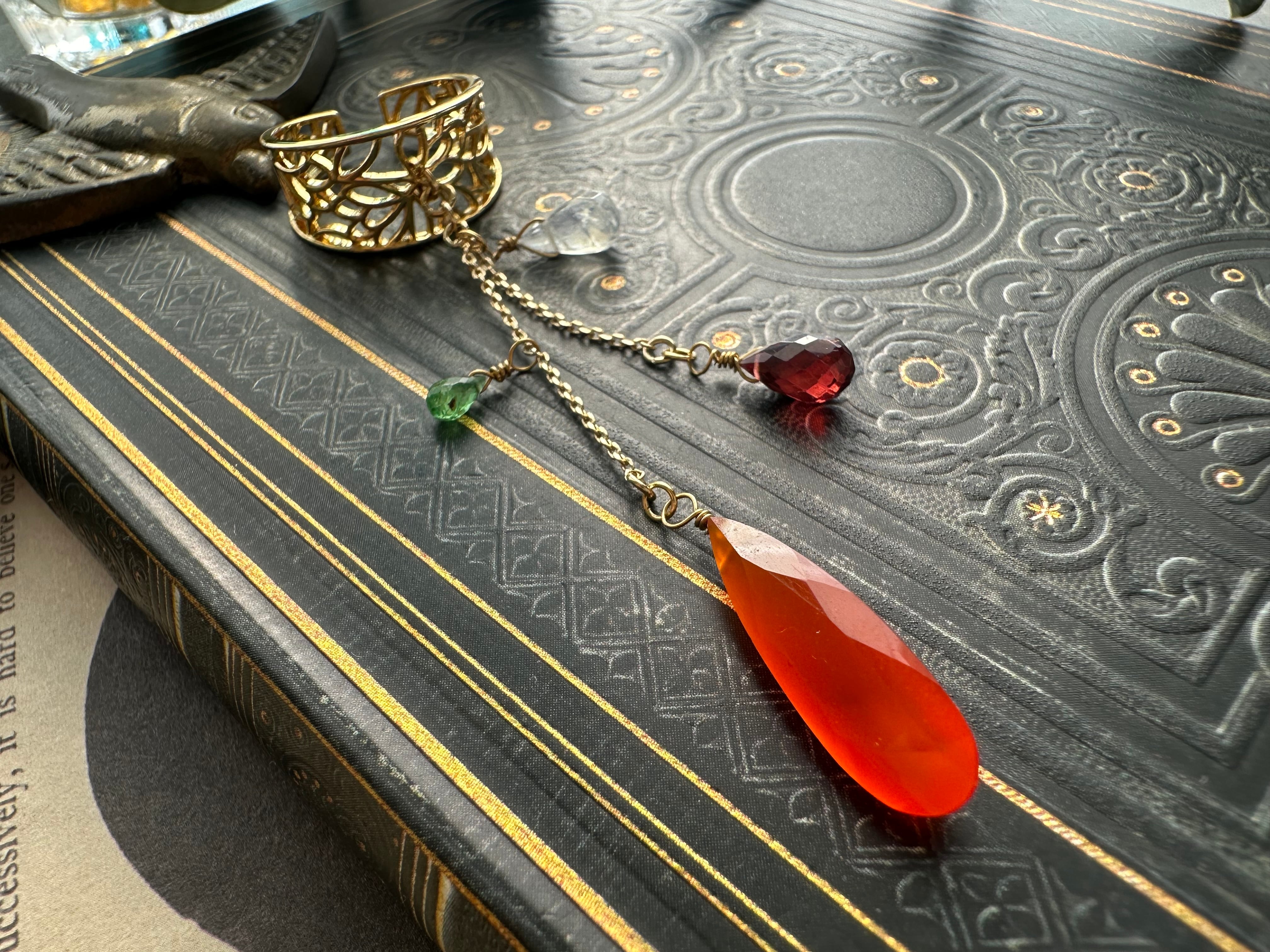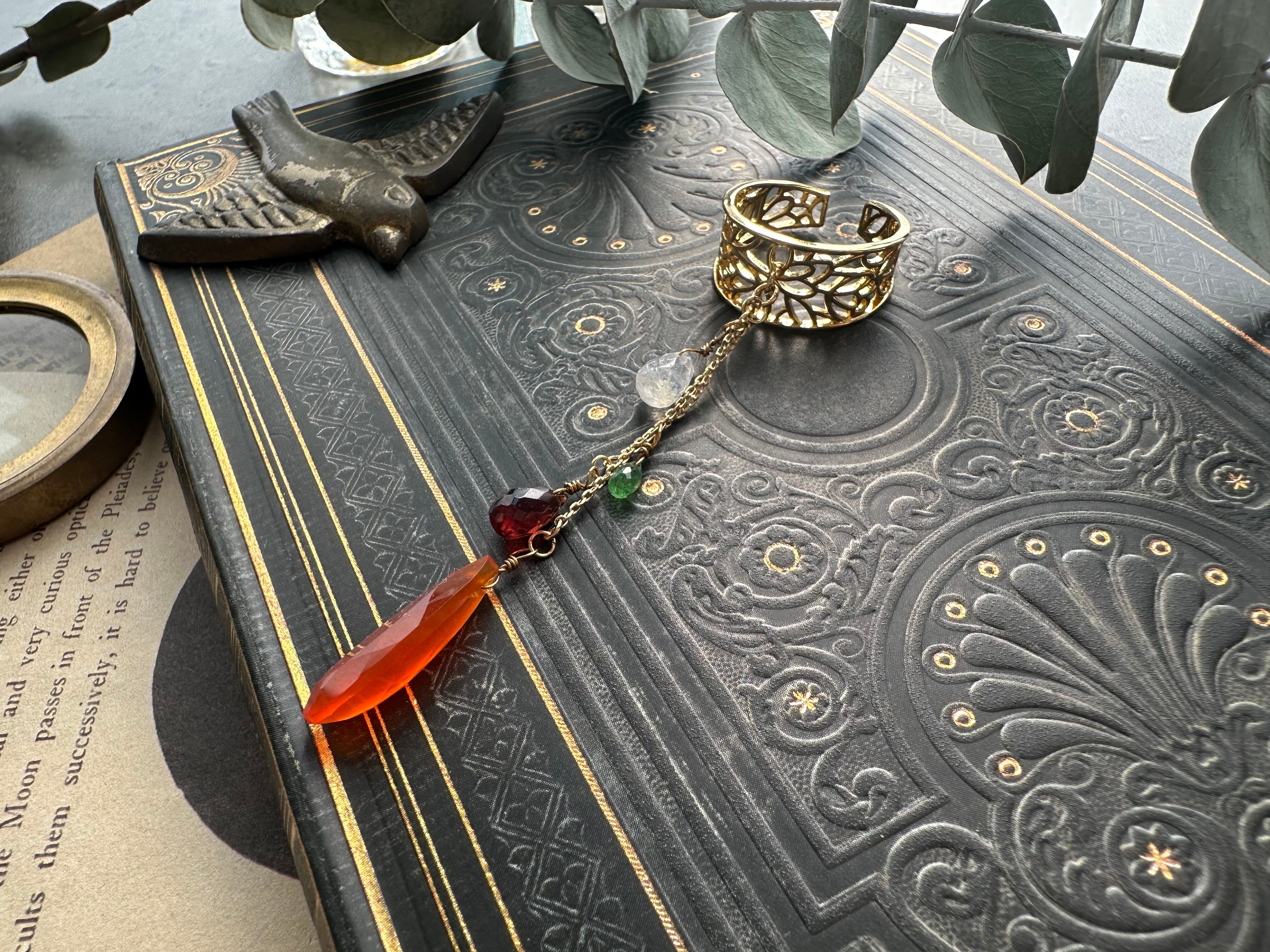 ≪片耳用≫ 揺れる天然石の雫のイヤーカフ(幅広) / カーネリアン×ツァボライトガーネット×ガーネット×レインボームーンストーン