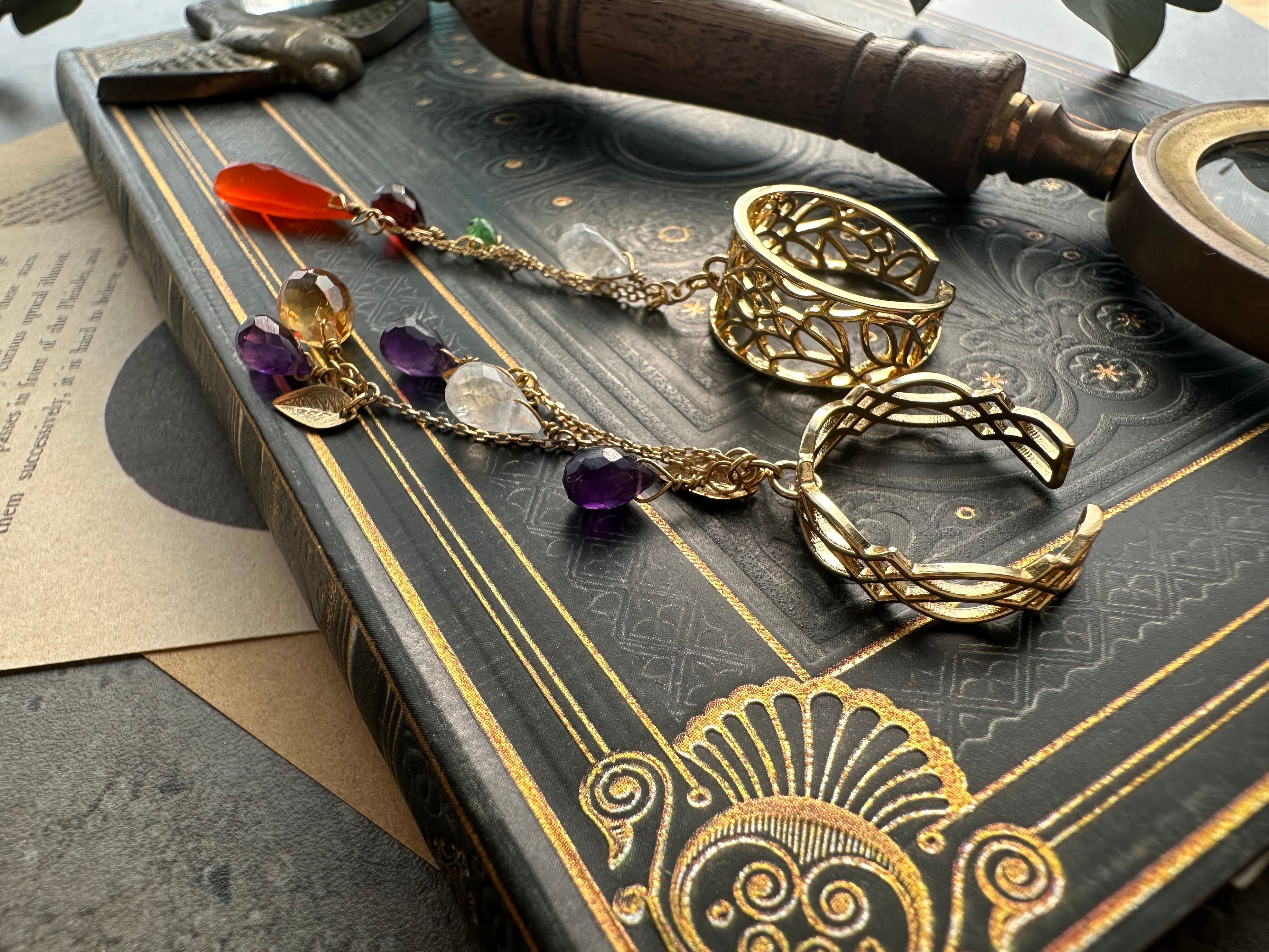 美しく細やかな模様が美しいイヤーカフに、粒感が美しい天然石ビーズをあしらいました。
