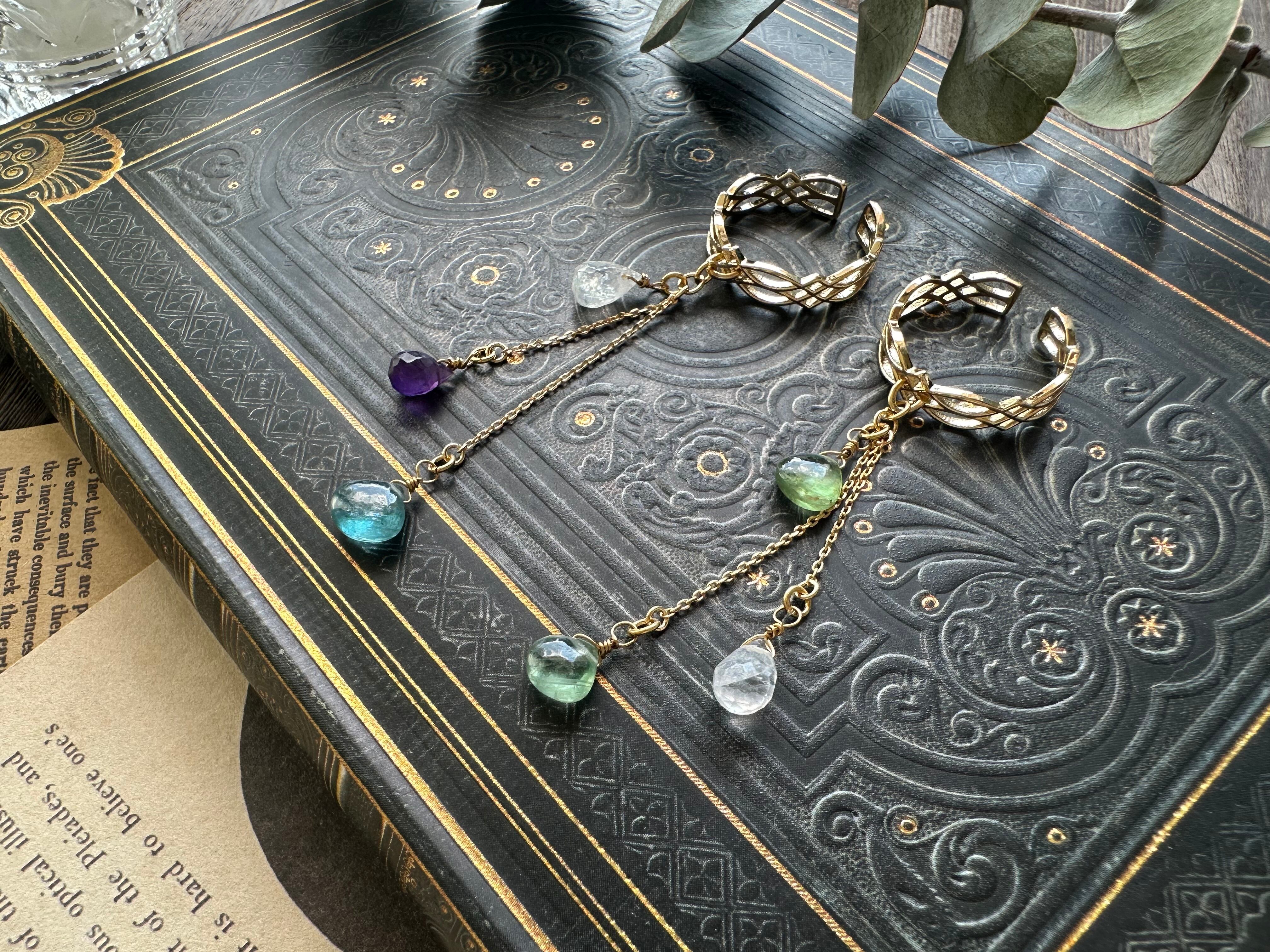 ≪片耳用≫ 揺れる天然石の雫のイヤーカフ / 宝石質ブルーグリーンカイヤナイト×ホワイトラブラドライト×ブラジル産アメジスト