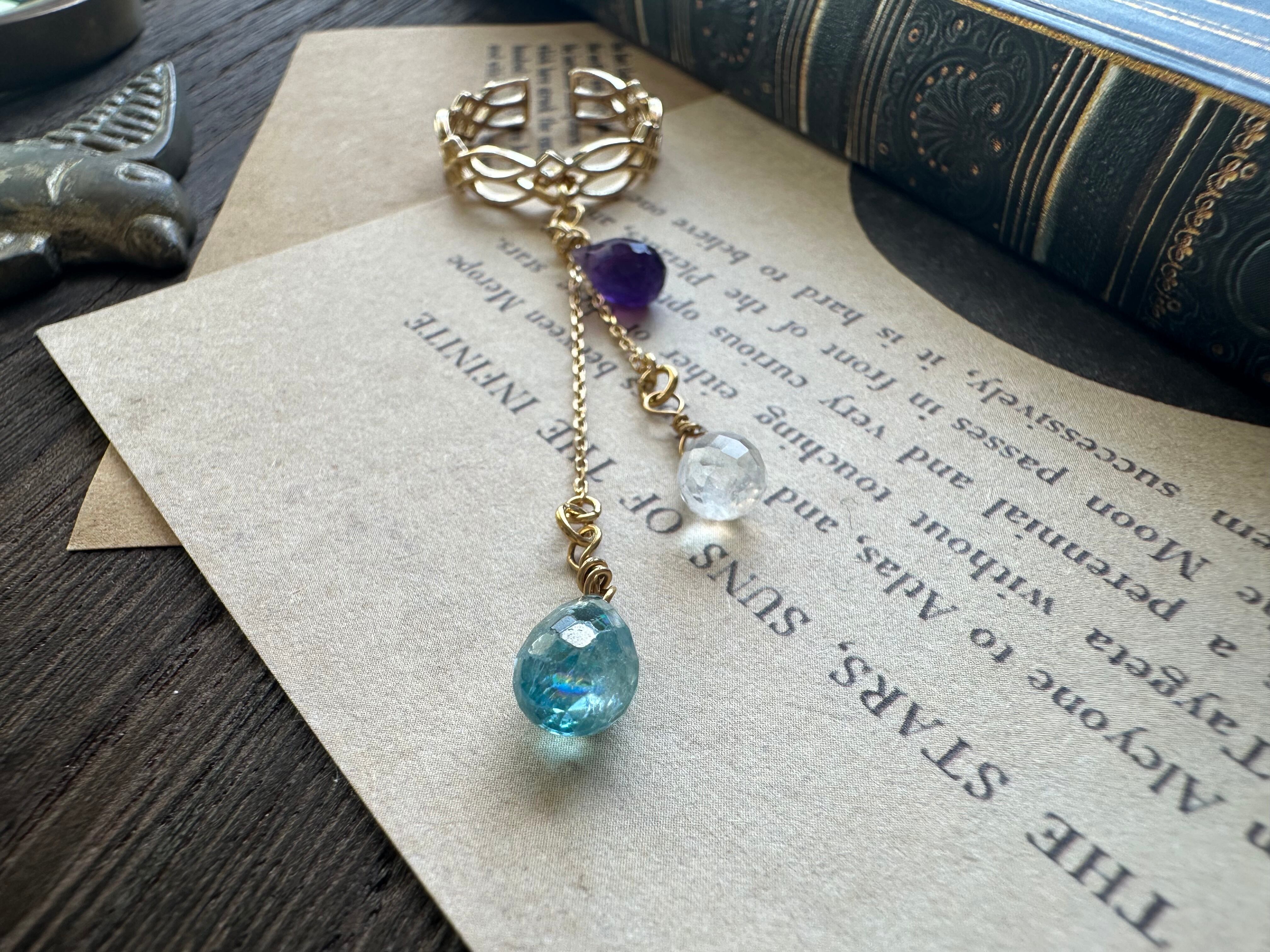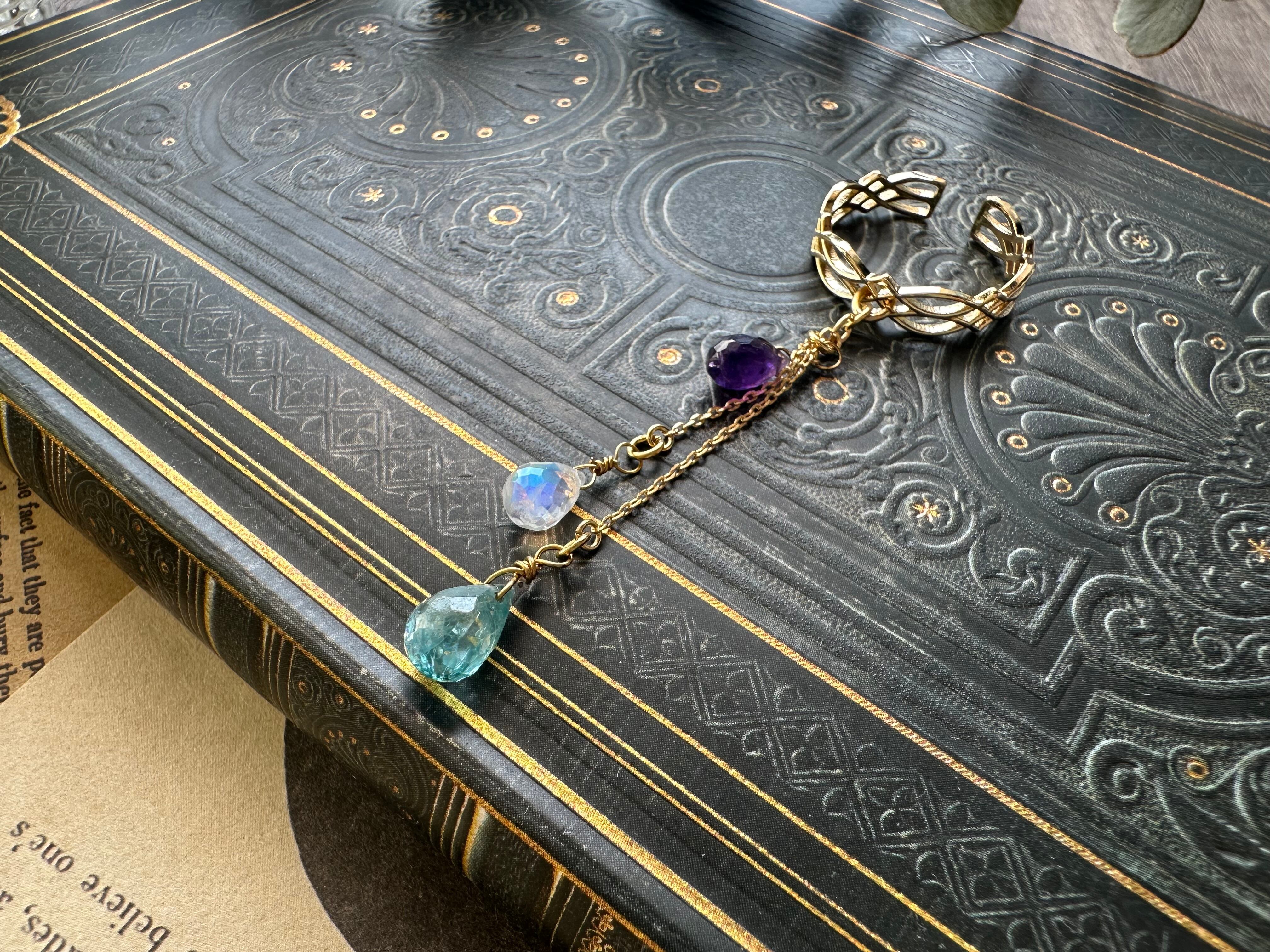 ≪片耳用≫ 揺れる天然石の雫のイヤーカフ / 宝石質ブルージルコン×ホワイトラブラドライト×ブラジル産アメジスト
