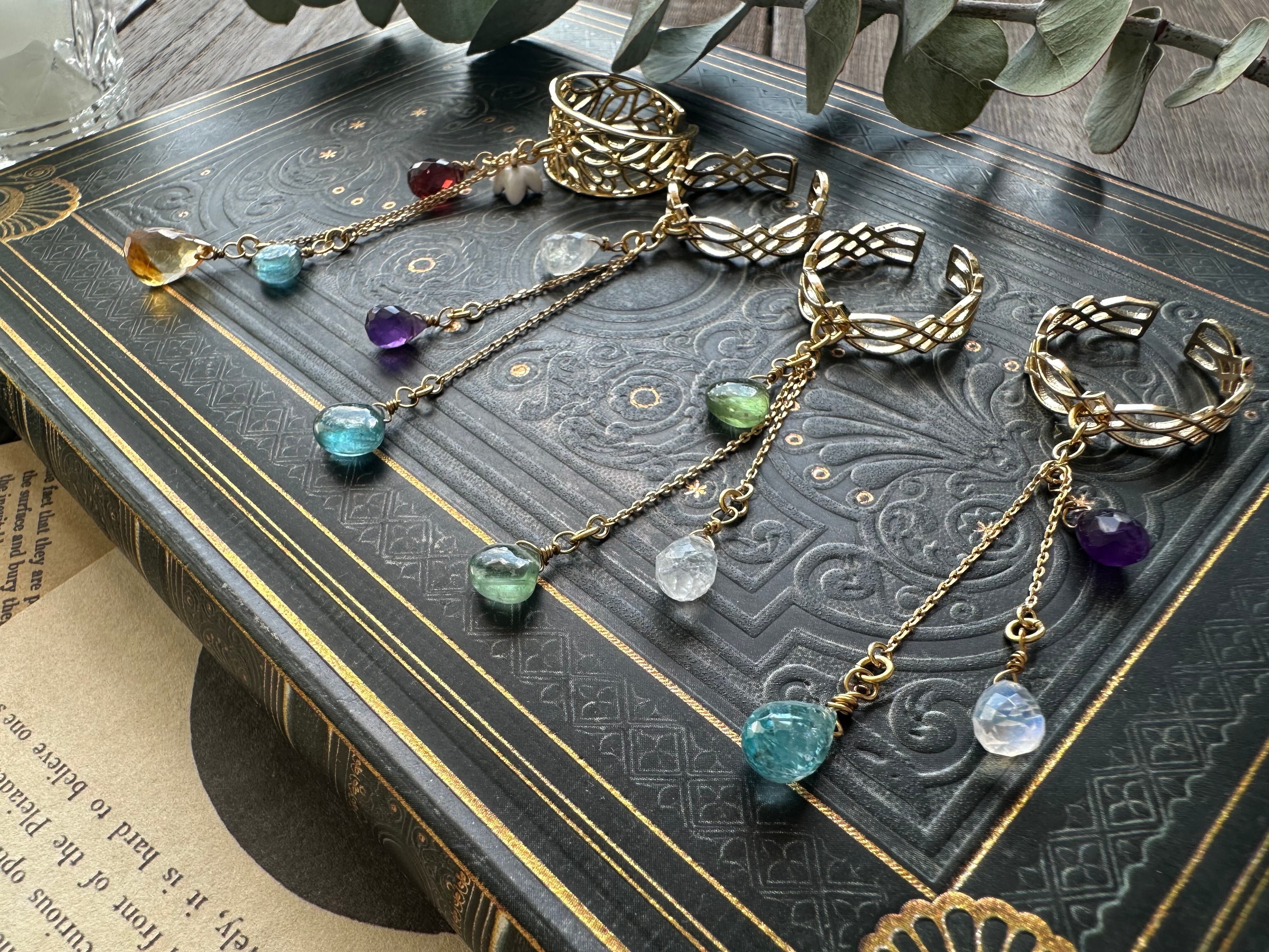 ≪片耳用≫ 白梅と揺れる天然石の雫のイヤーカフ(幅広) / 宝石質モザンビーク産ガーネット、グリーンブルーカイヤナイト×シトリン