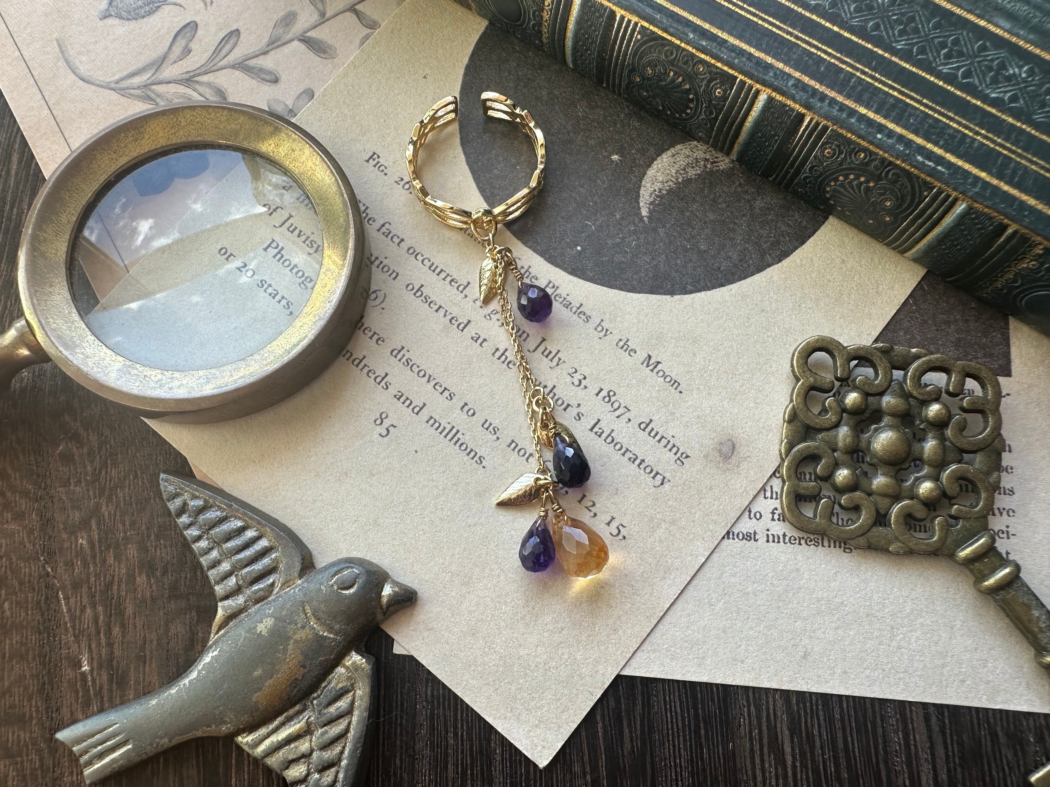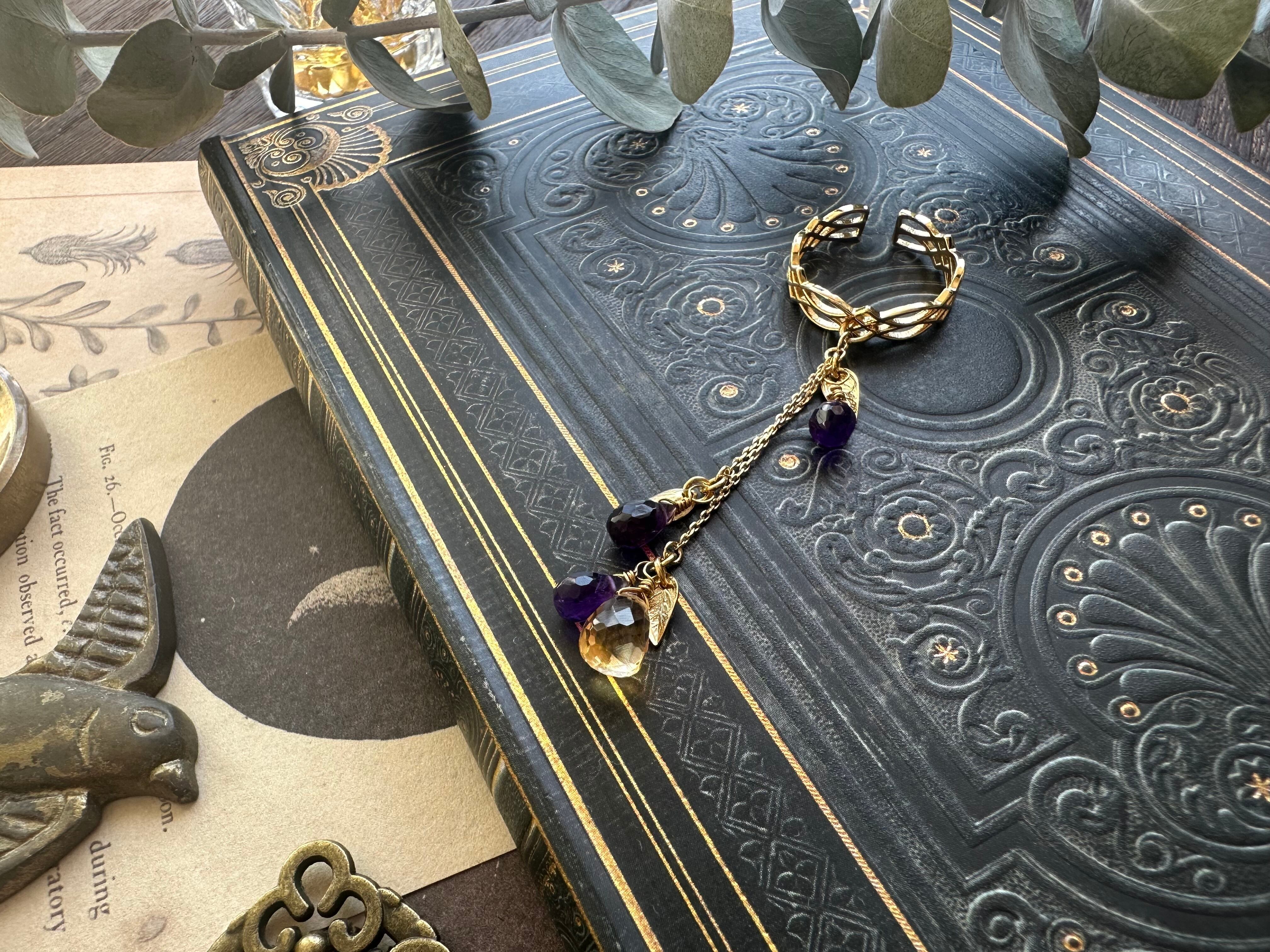 ≪片耳用≫ 黄金の葉と揺れる天然石の雫のイヤーカフ /アメジスト×シトリン