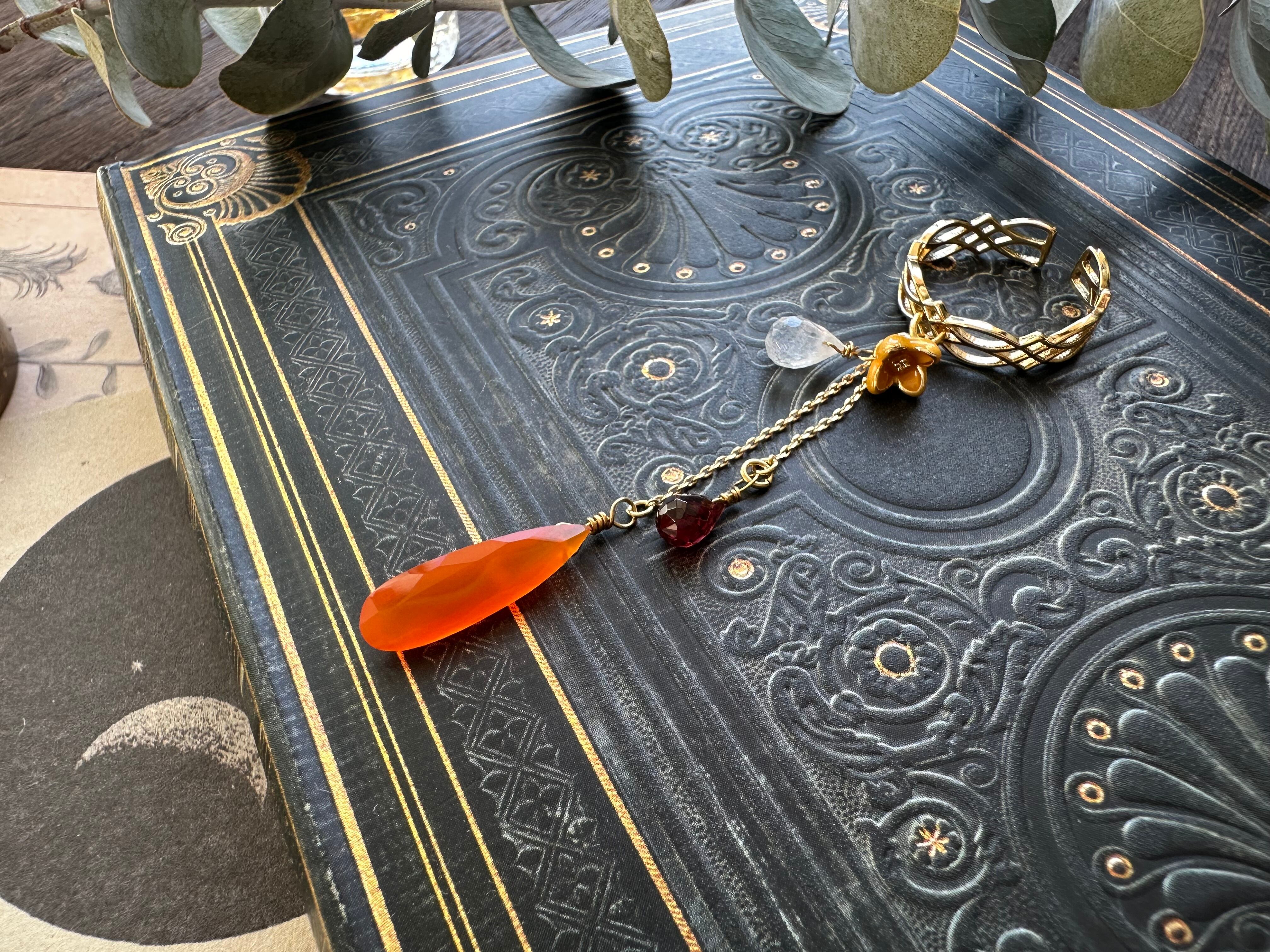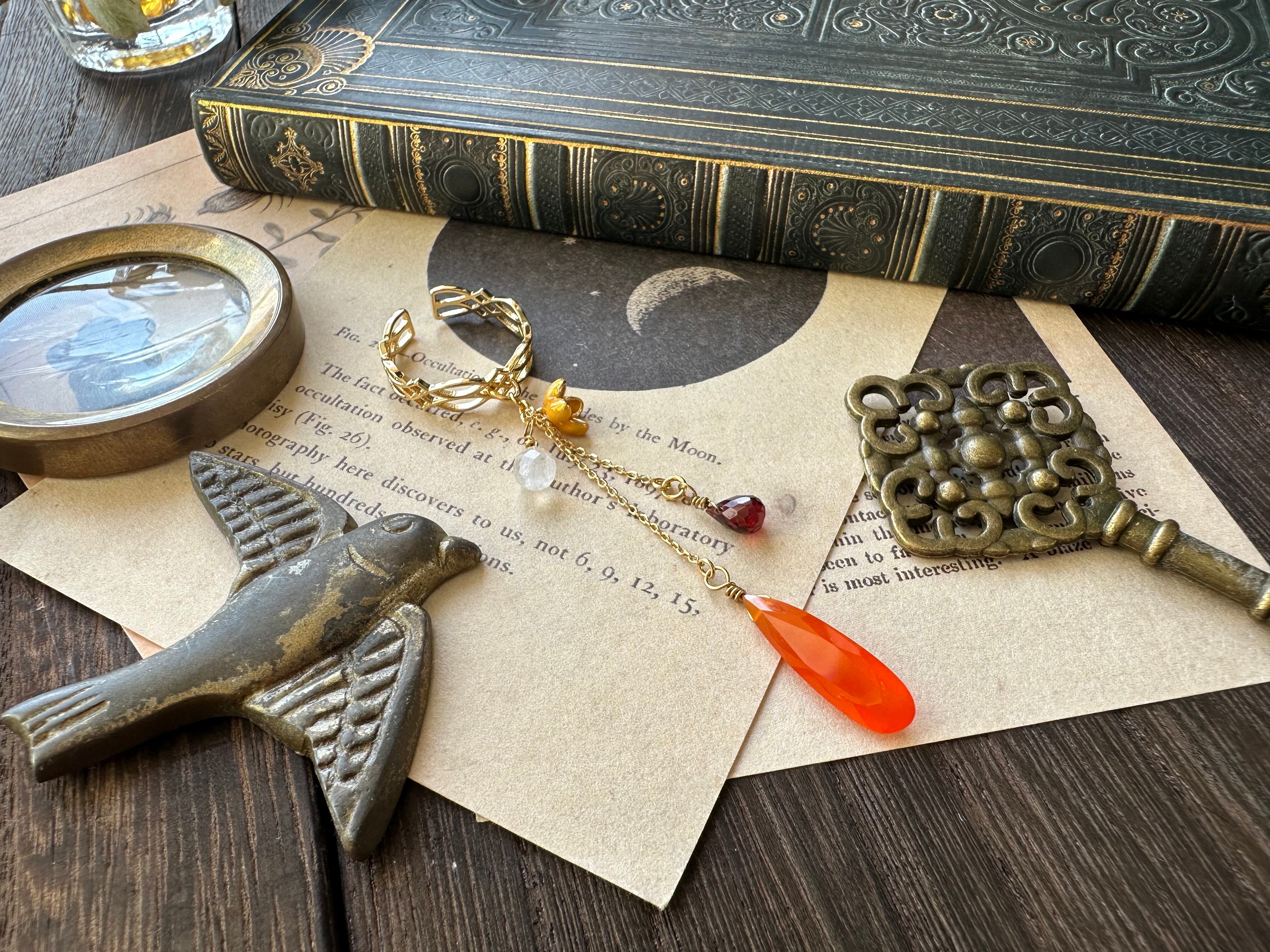 ≪片耳用≫ 蝋梅と揺れる天然石の雫のイヤーカフ / カーネリアン×レインボームーンストーン×ガーネット