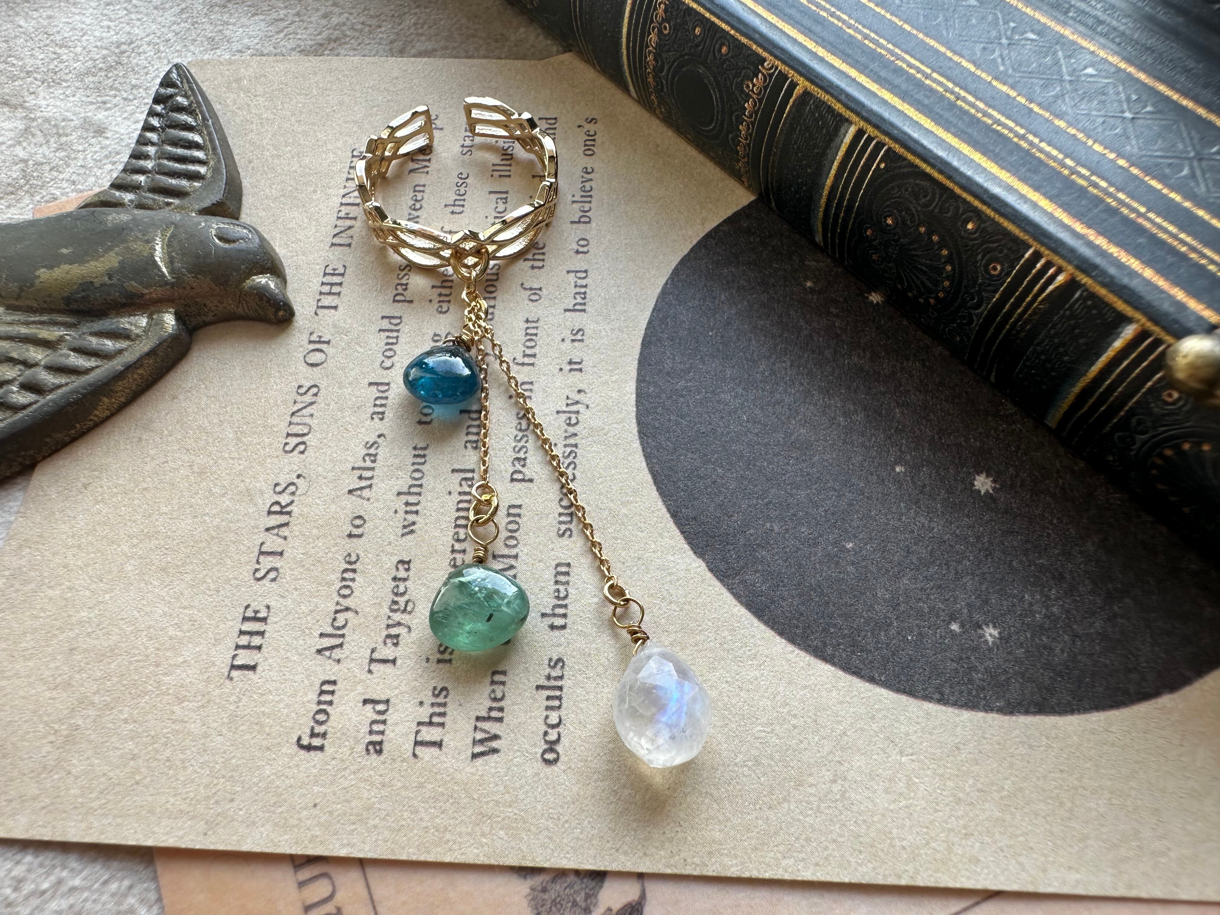 ≪片耳用≫ 揺れる天然石の雫のイヤーカフ / 宝石質グリーンカイヤナイト×レインボームーンストーン