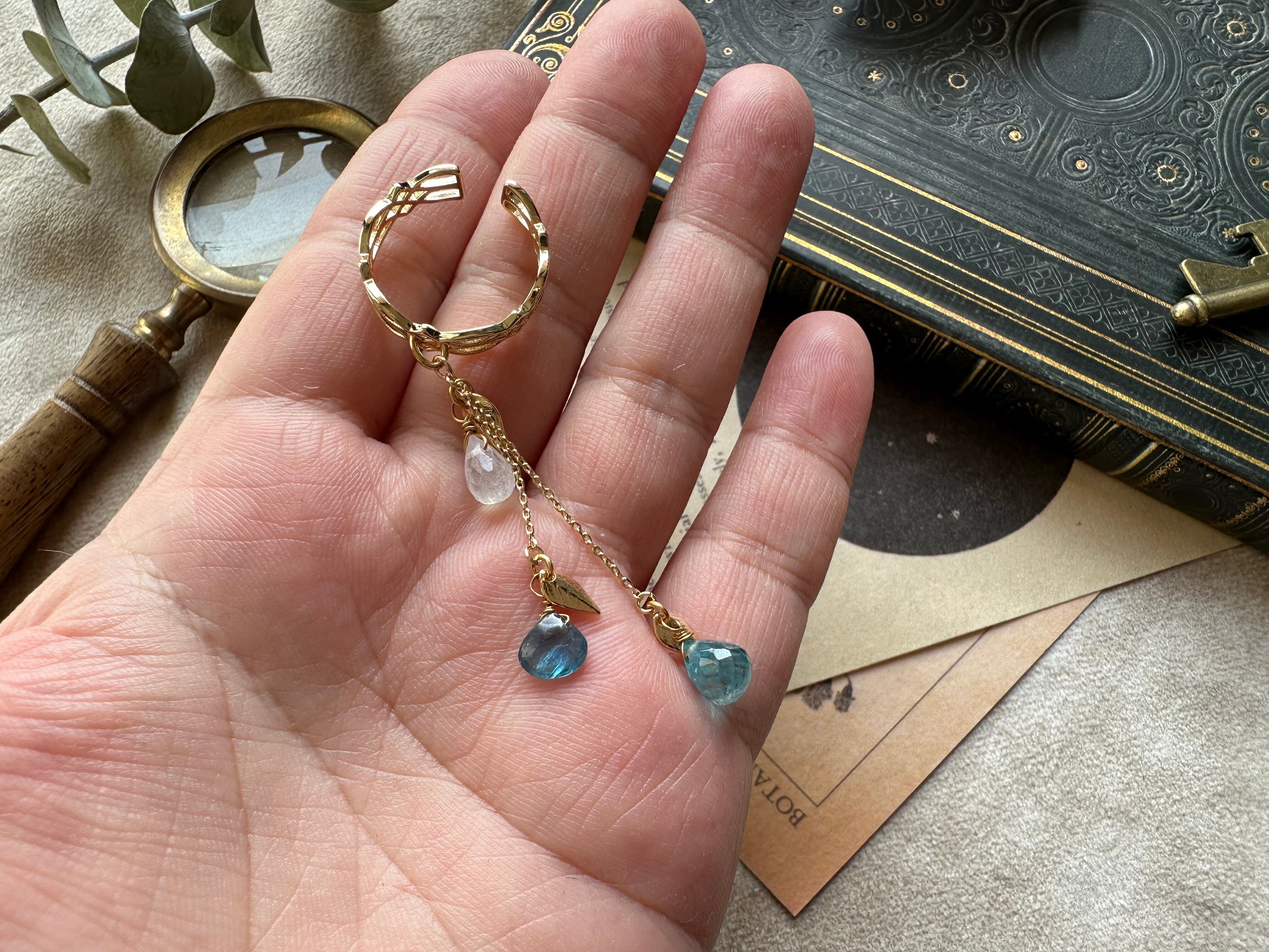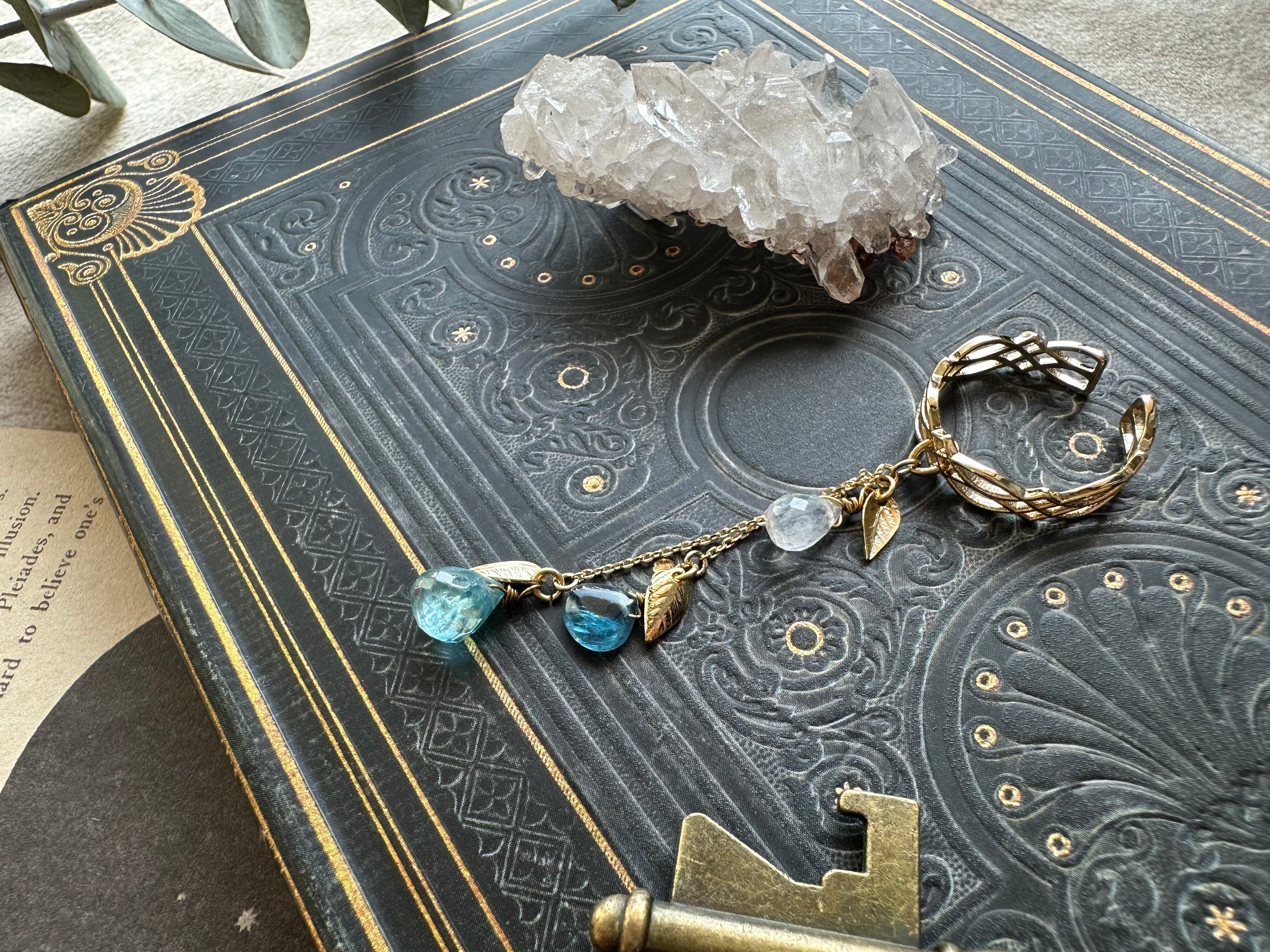 ≪片耳用≫ 黄金の葉と揺れる天然石の雫のイヤーカフ / 宝石質ブルージルコン×ホワイトラブラドライト×グリーンブルーカイヤナイト