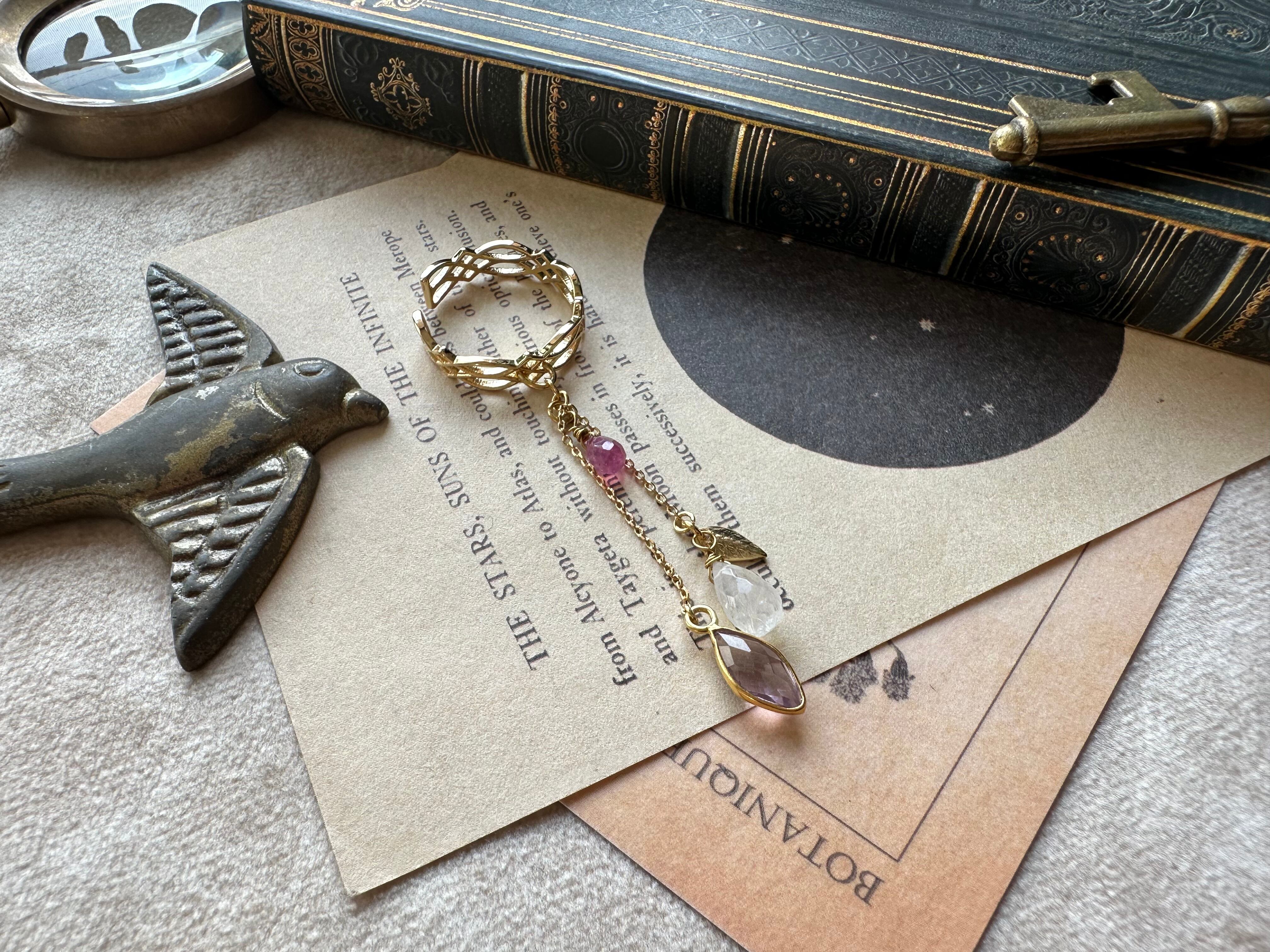 ≪片耳用≫ 黄金の葉と揺れる天然石の雫のイヤーカフ / 宝石質レインボームーンストーン×ピンクサファイア×ブラジル産アメジスト