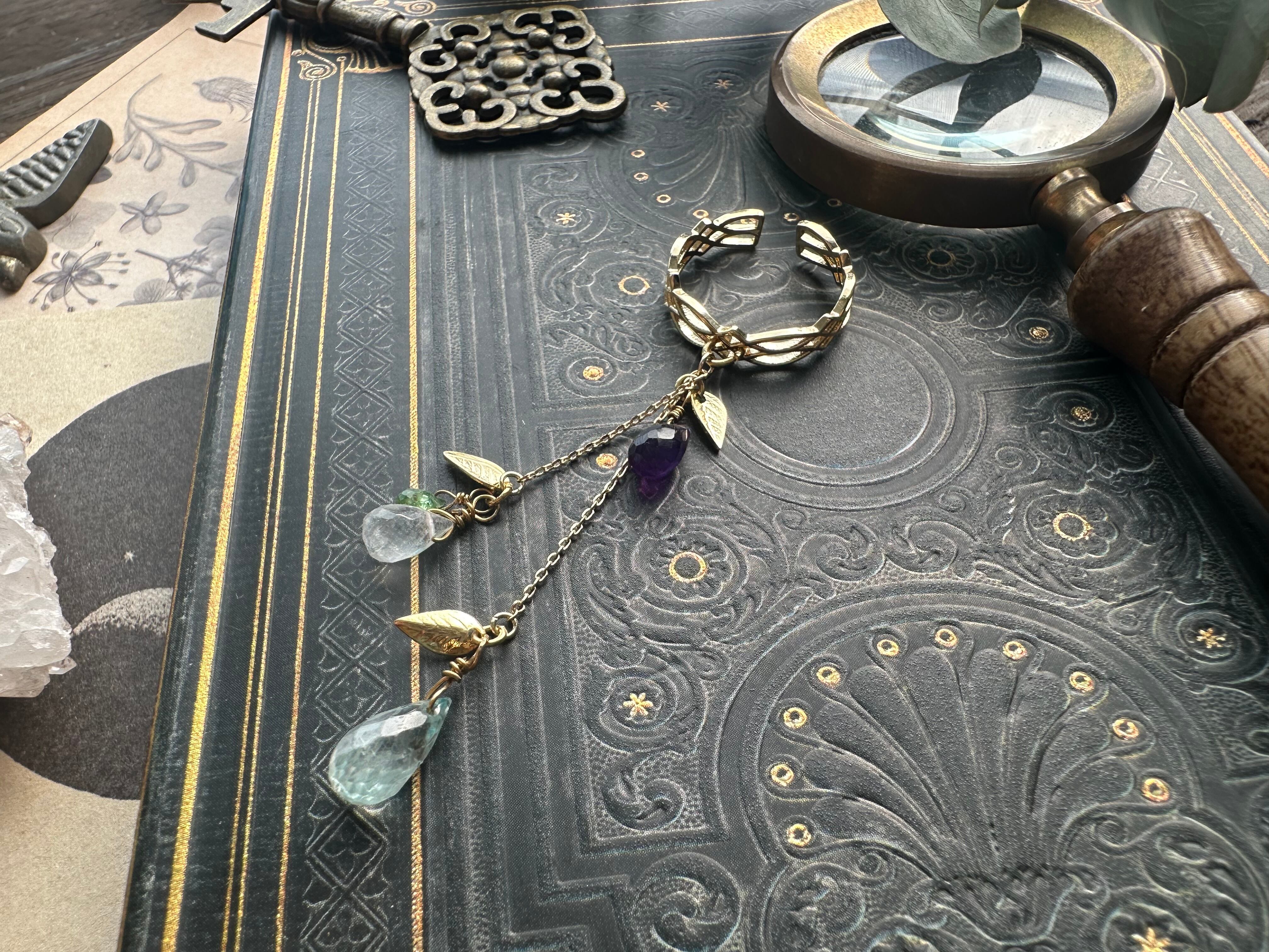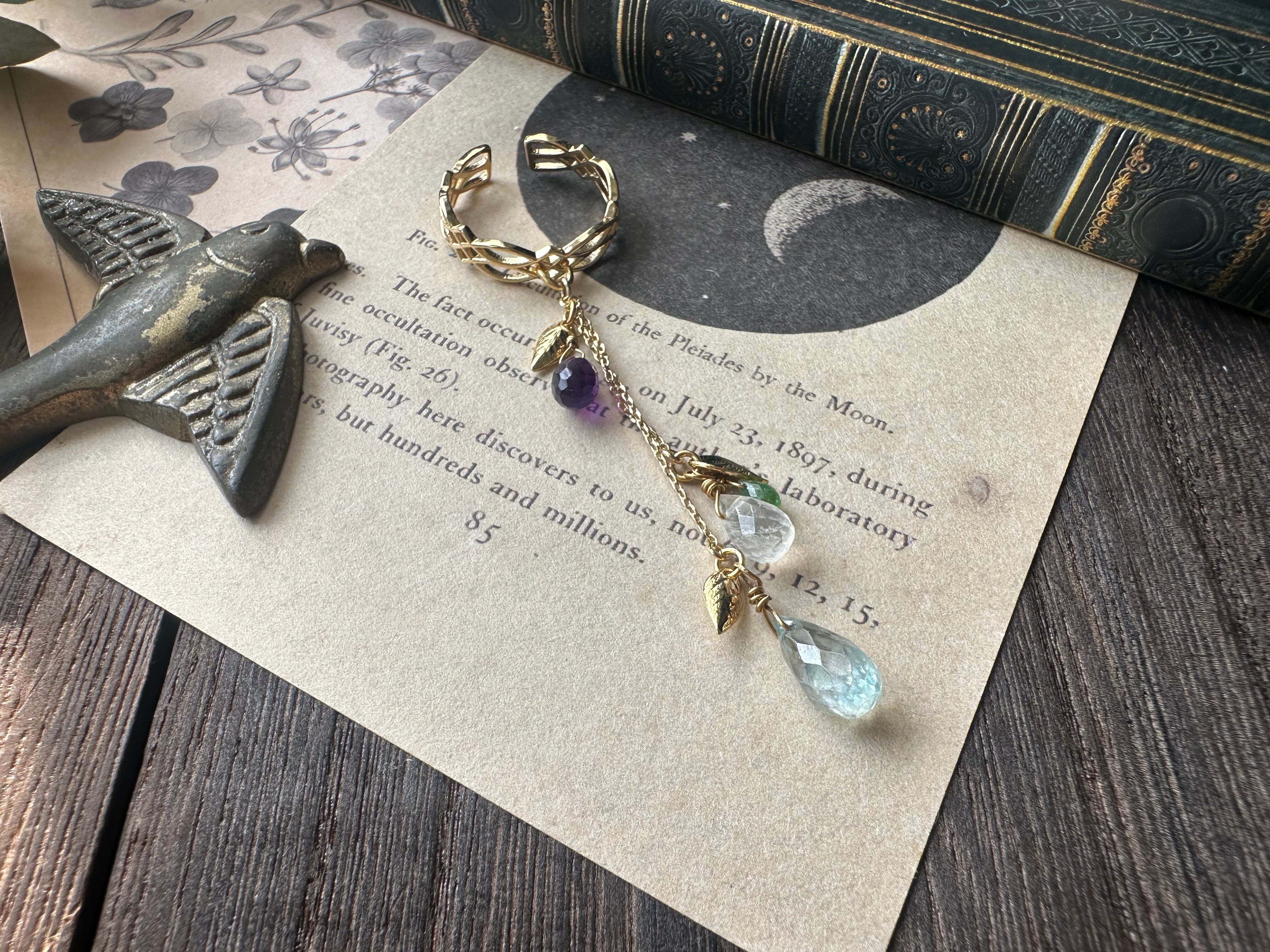 ≪片耳用≫ 黄金の葉と揺れる天然石の雫のイヤーカフ / 宝石質ブルージルコン×ツァボライトガーネット×レインボームーンストーン×アメジスト