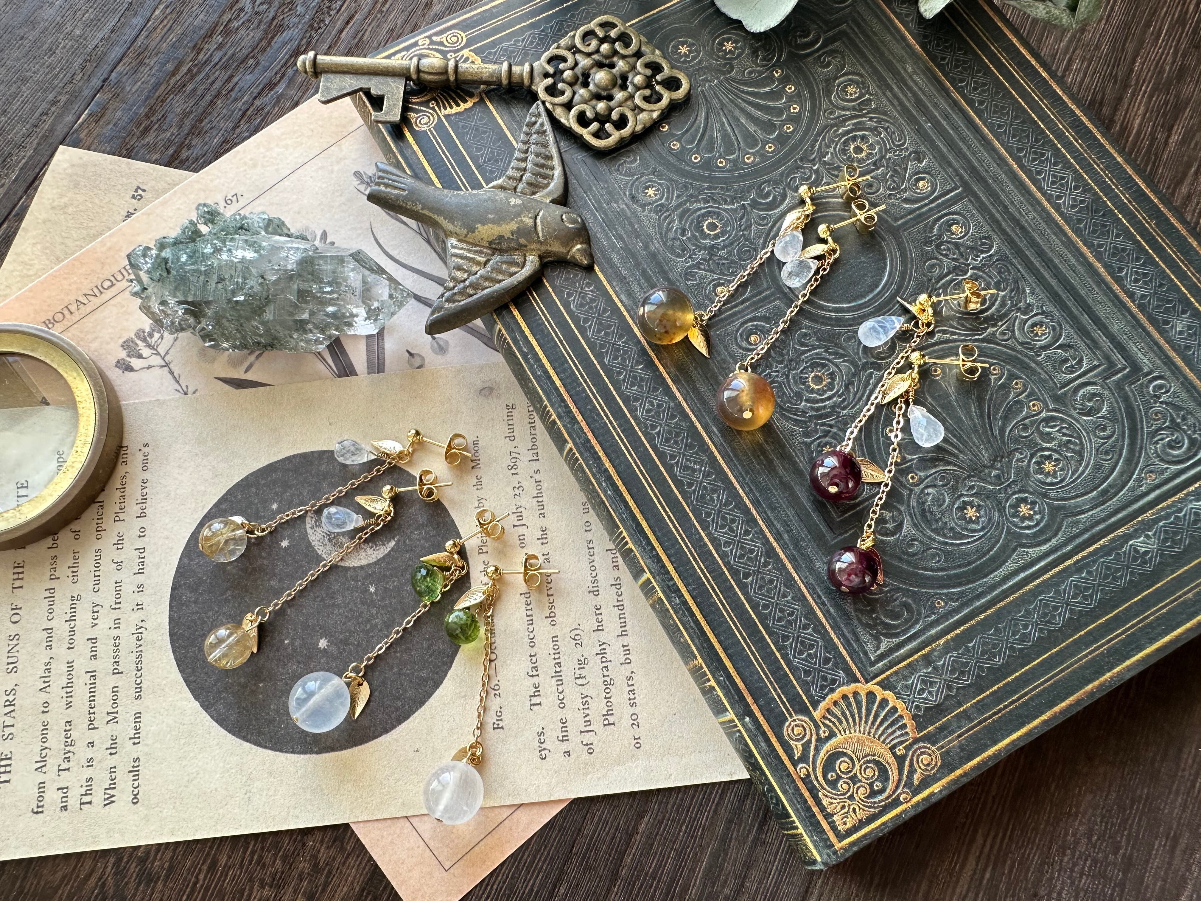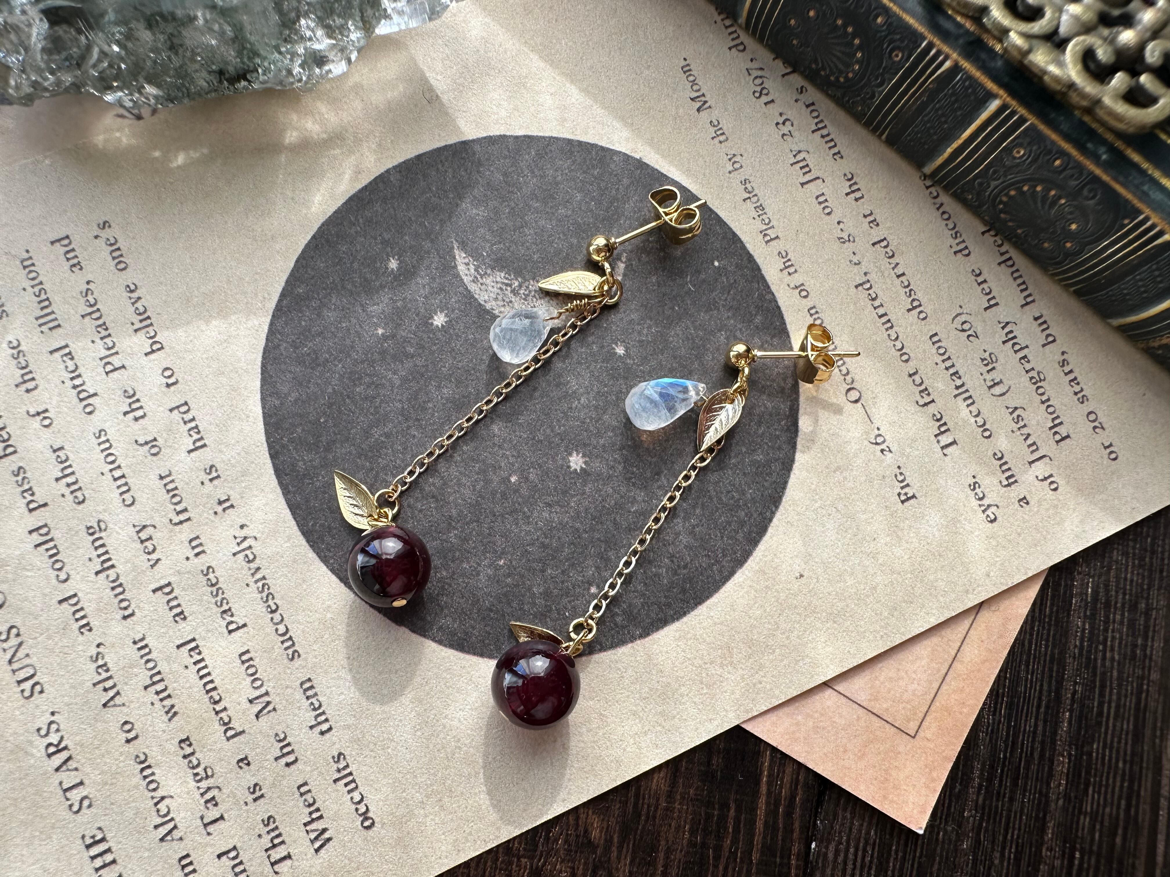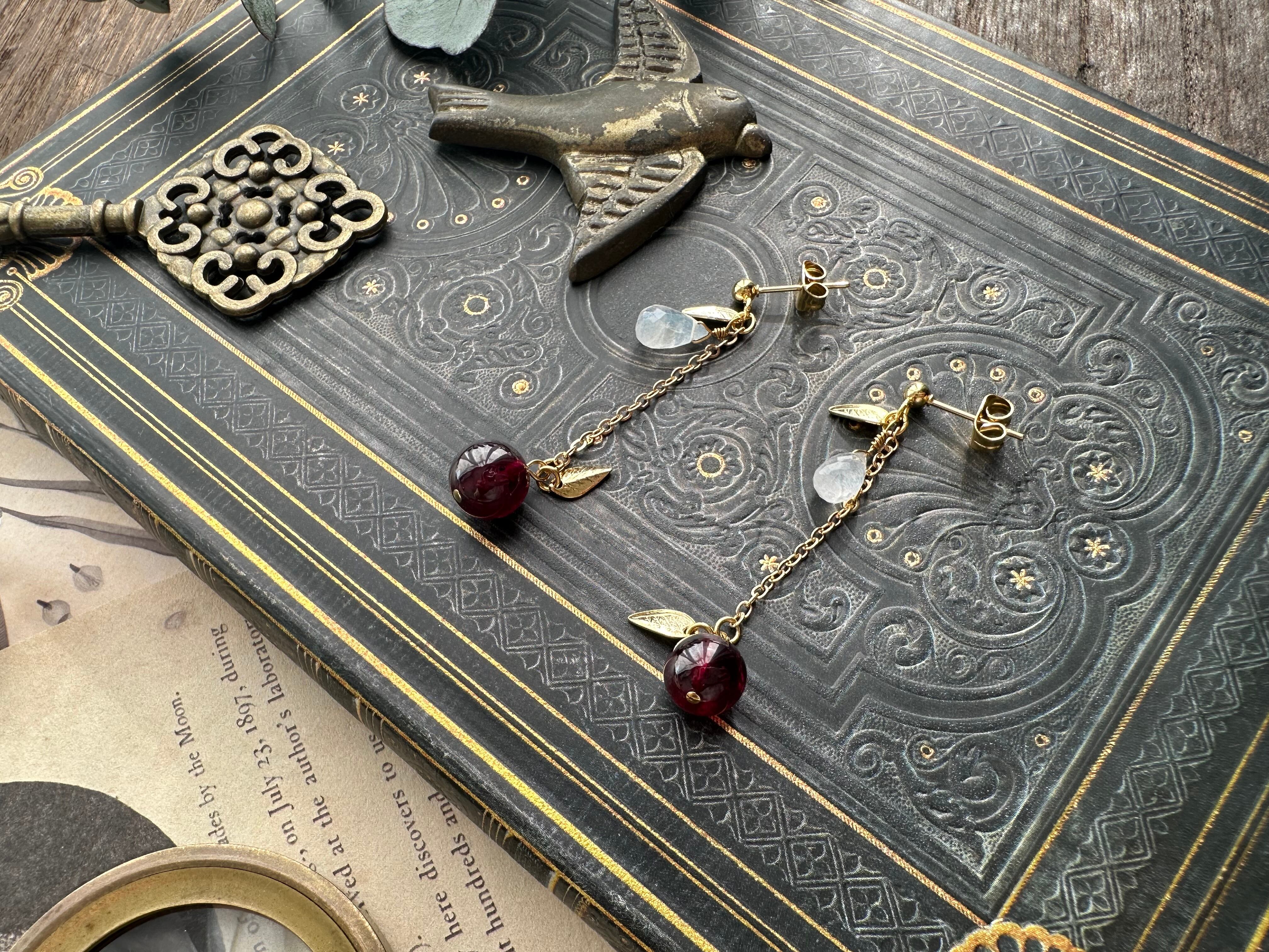 ころんとした粒感の美しいロードライトガーネットと雫のようなレインボームーンストーンを黄金リンゴと銀の雫に見立てて、歩く度にゆらゆら揺れる耳飾りをお仕立ていたしました。