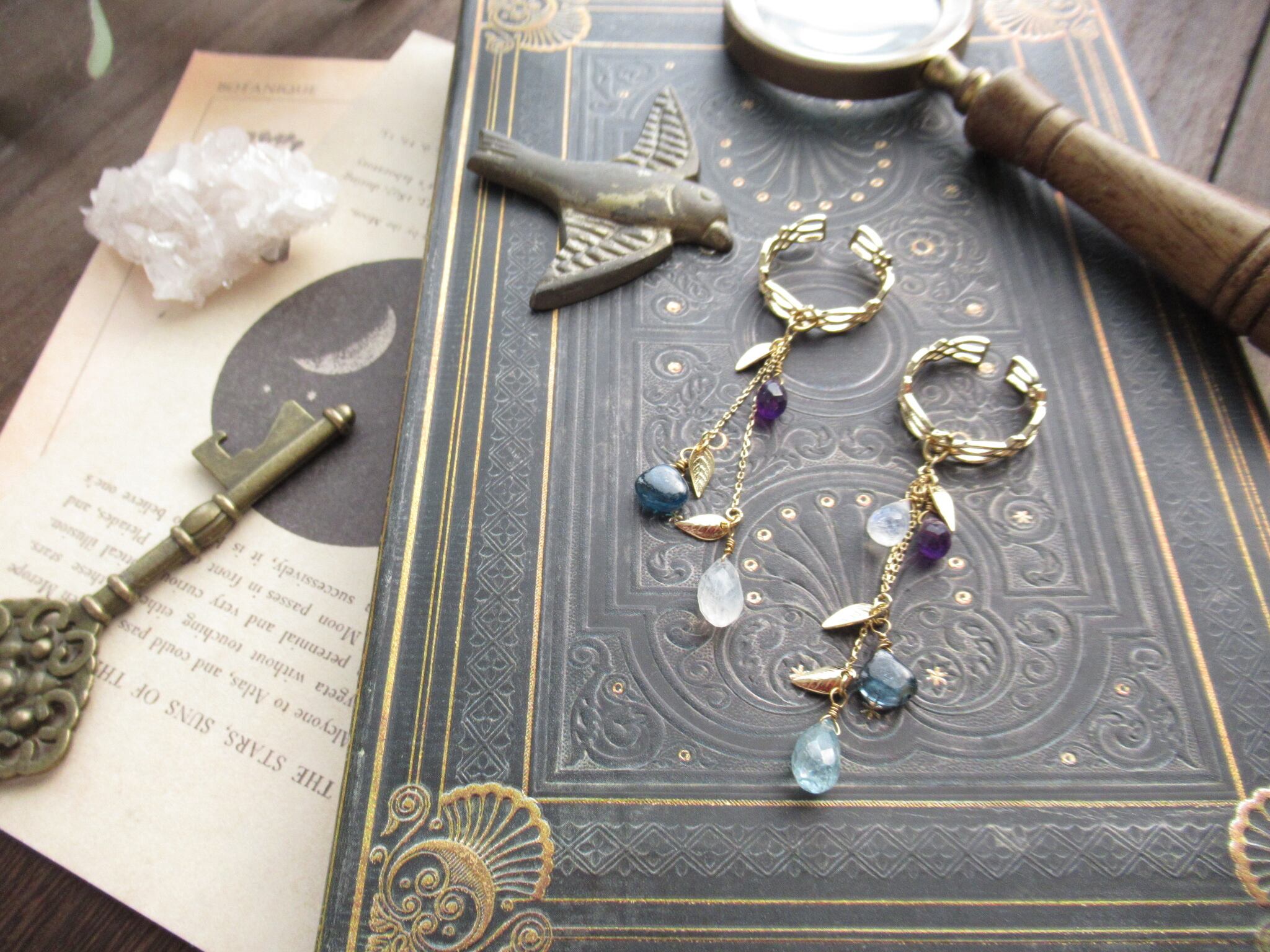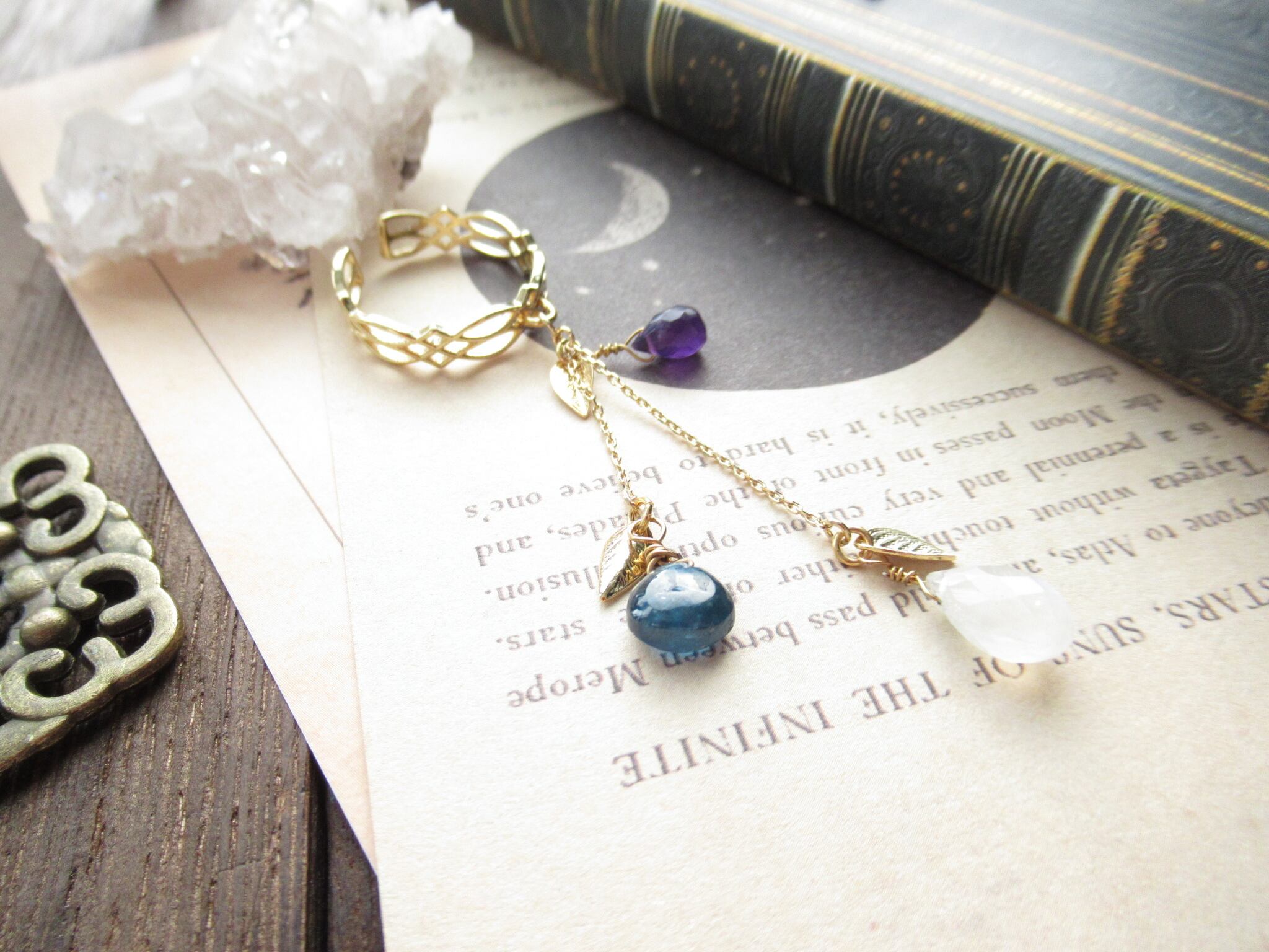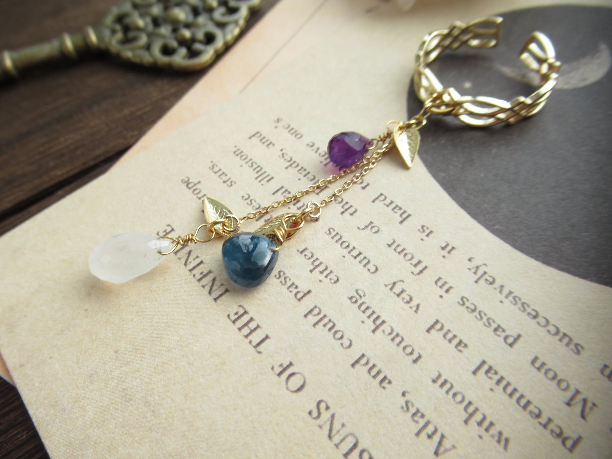 ≪片耳用≫ 黄金の葉と揺れる天然石の雫のイヤーカフ / 宝石質ブルーグリーンカイヤナイト×ホワイトラブラドライト×ブラジル産アメジスト