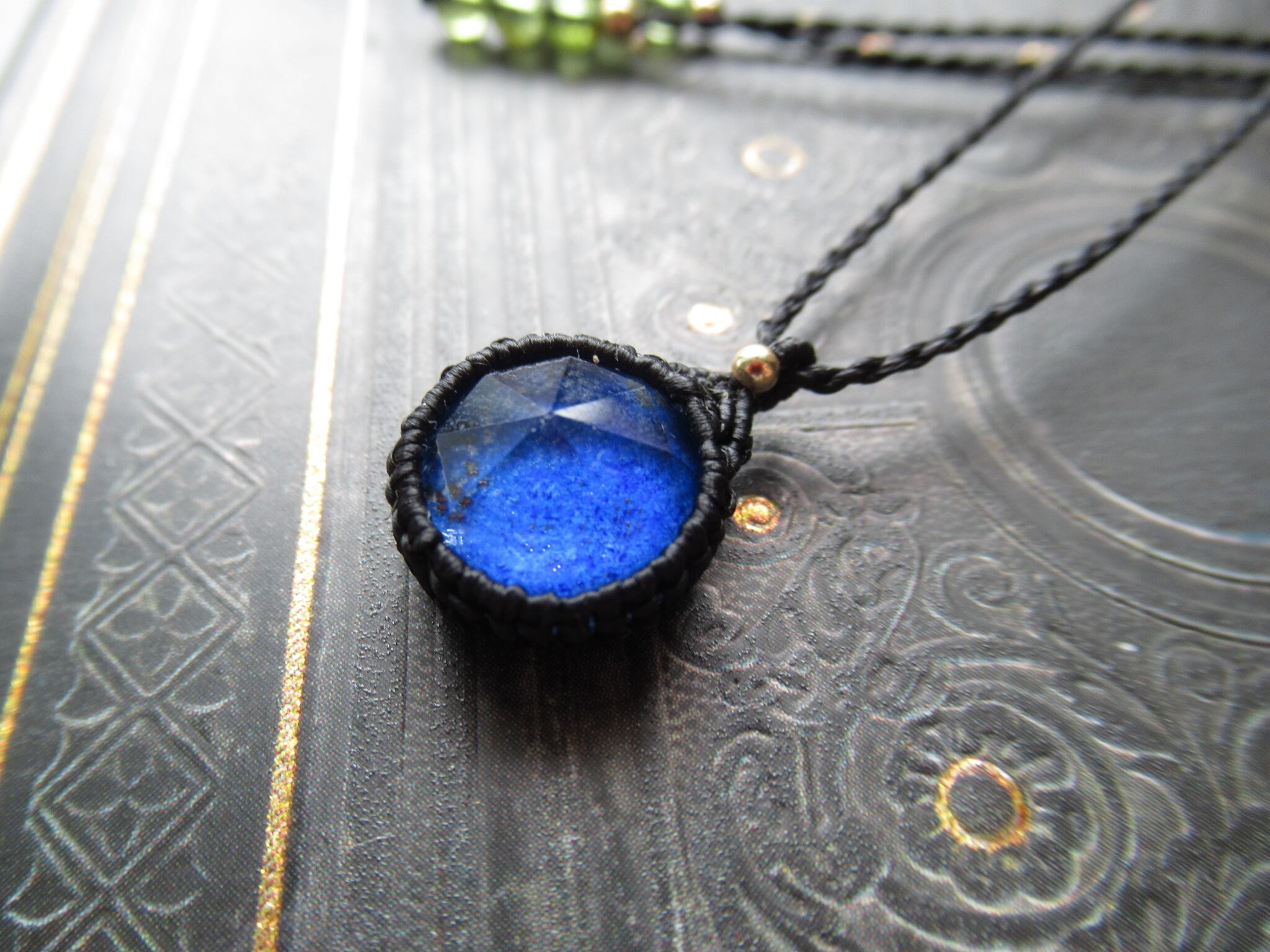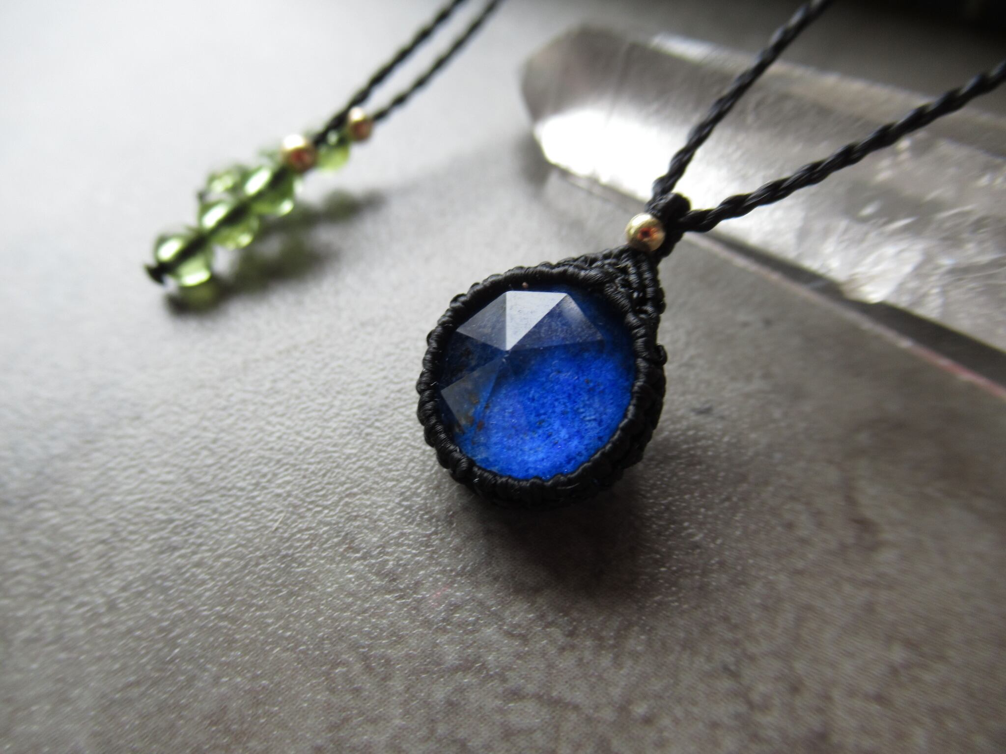 ころん、とした円形が愛らしいラピスラズリ×クリスタルのダブレッドストーンをシンプルなマクラメペンダントにお仕立ていたしました。