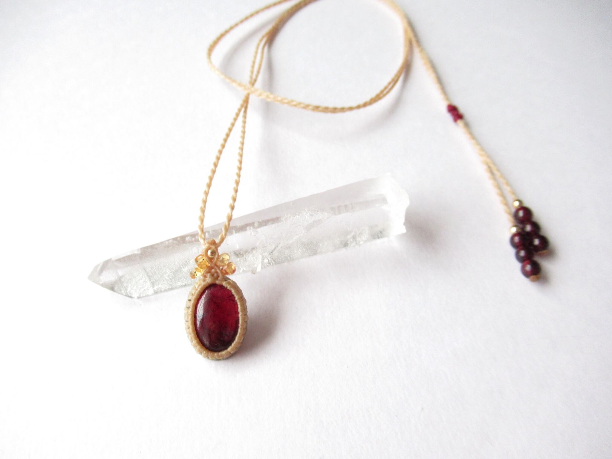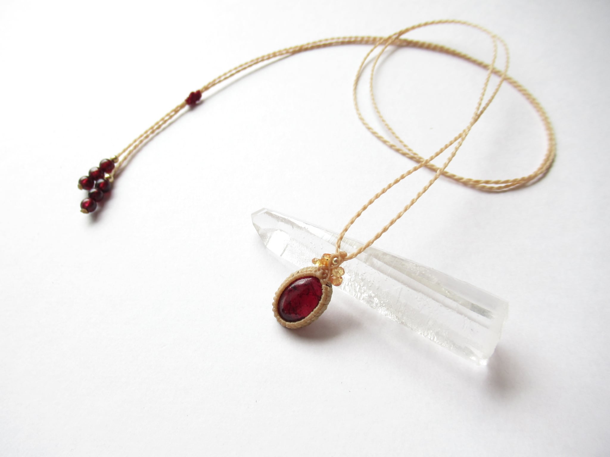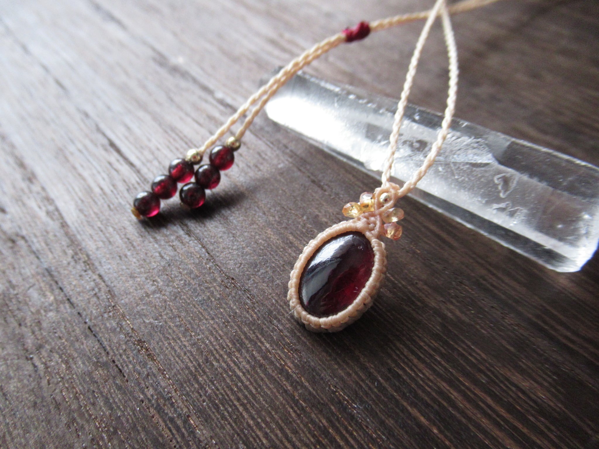 楕円形の濃い目の色合いのガーネットをシンプルなマクラメペンダントにお仕立ていたしました。