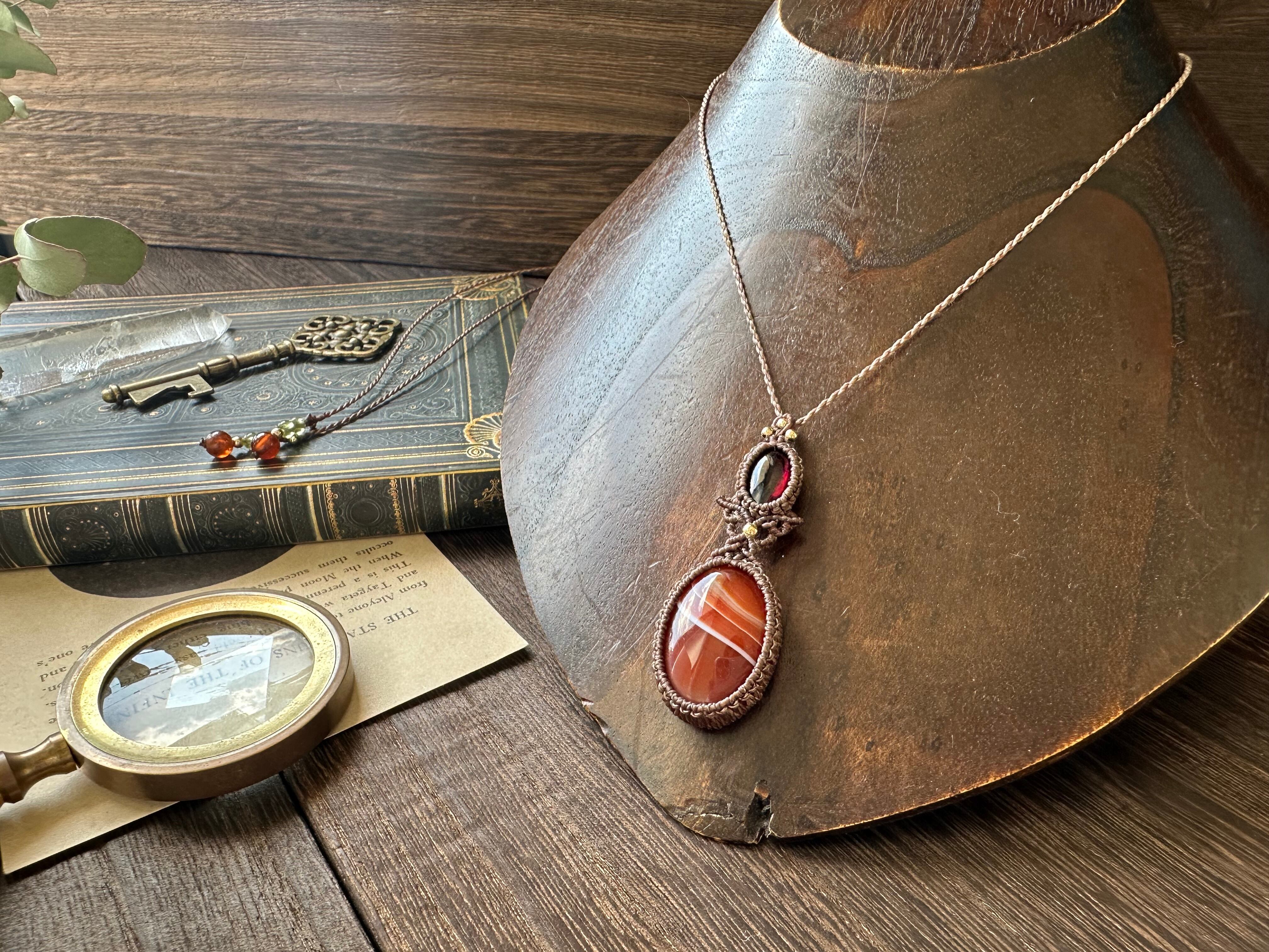 大粒で縞模様が美しいレッドアゲートにロードライトガーネットを組み合わせて、大ぶりで印象的なペンダントを製作致しました。