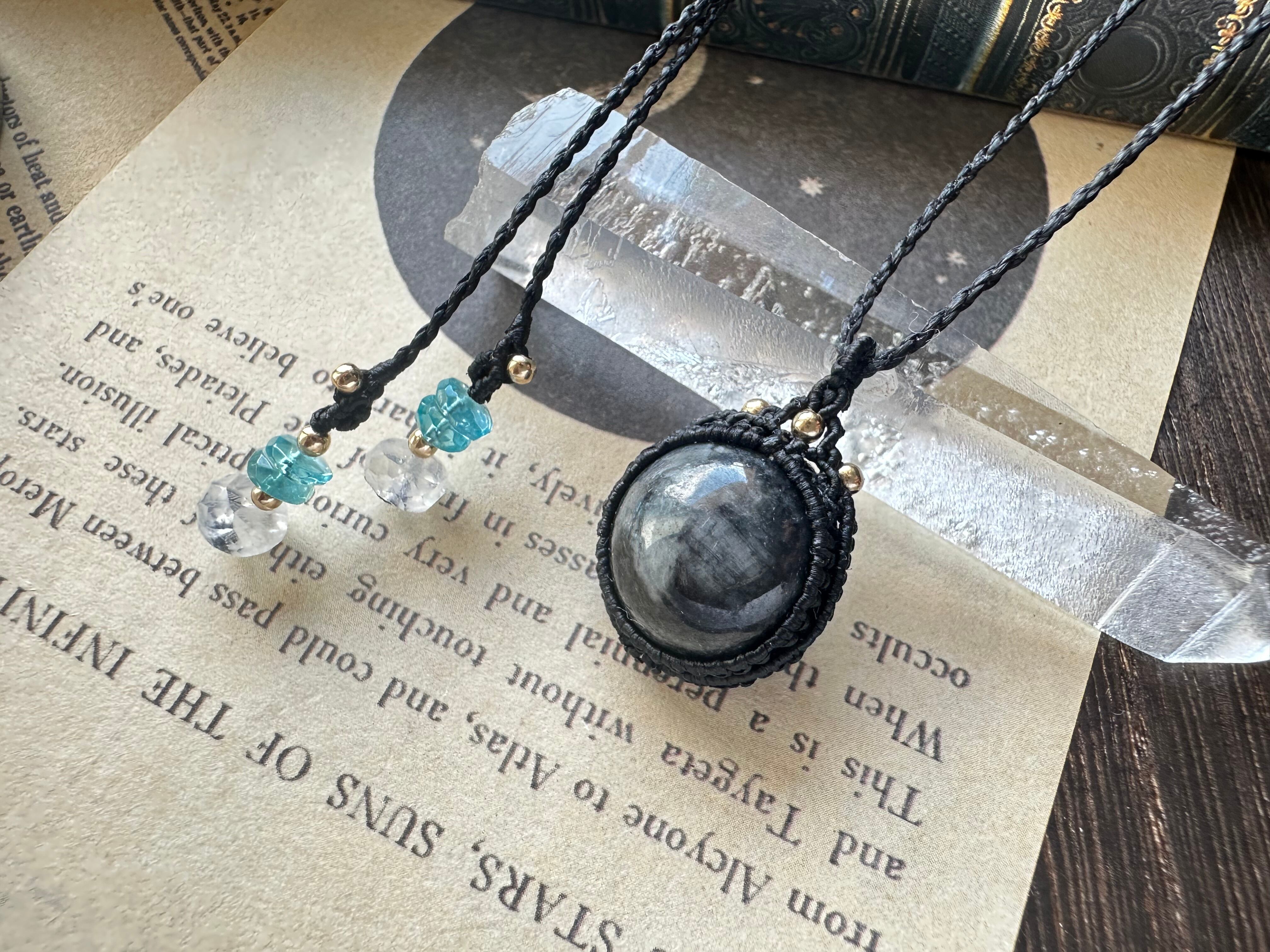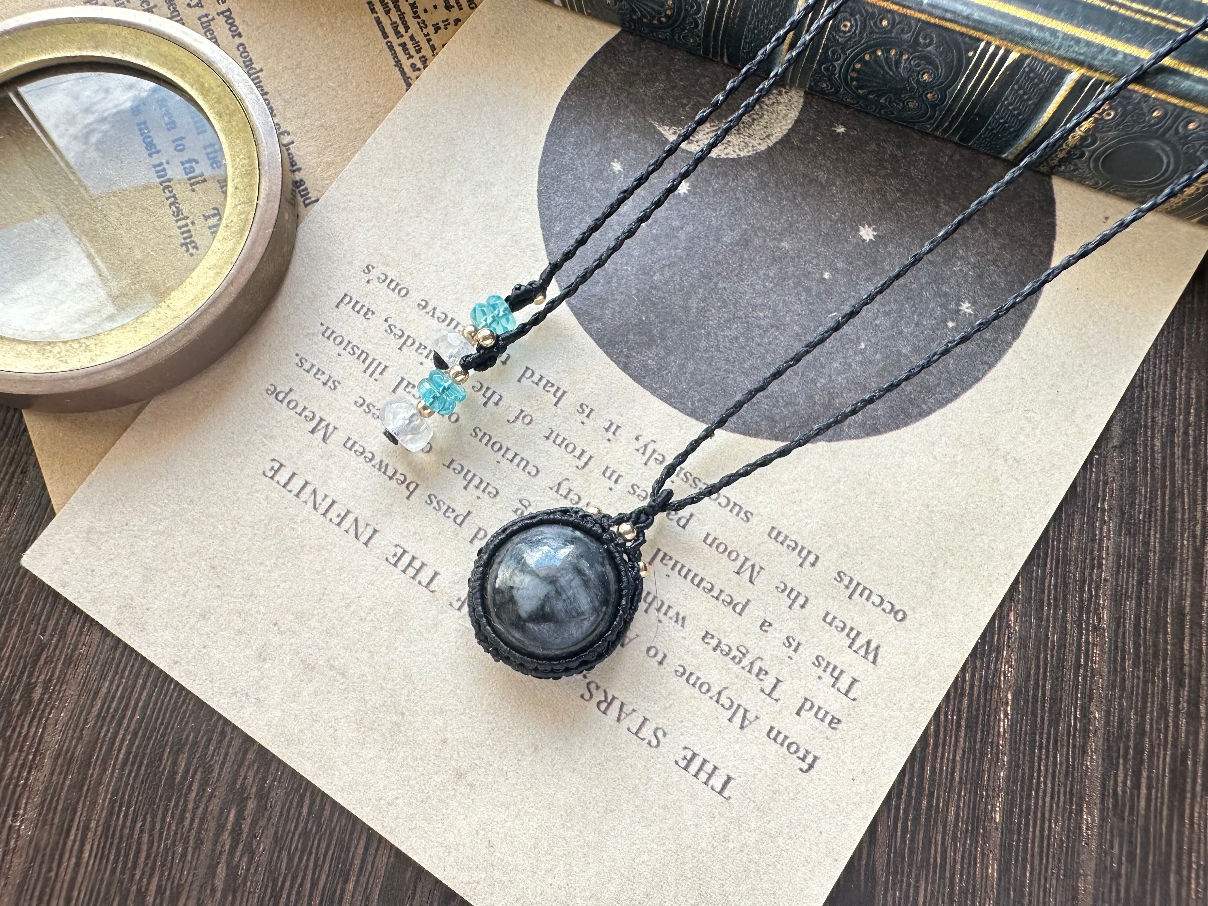 編み糸は0.25mmの極細糸で全体をすっきりしっかりと編み上げています。糸が細いですが強度があり、持ったりとせずすっきりとした印象で天然石の色合いや質感をよりお楽しみいただけます。