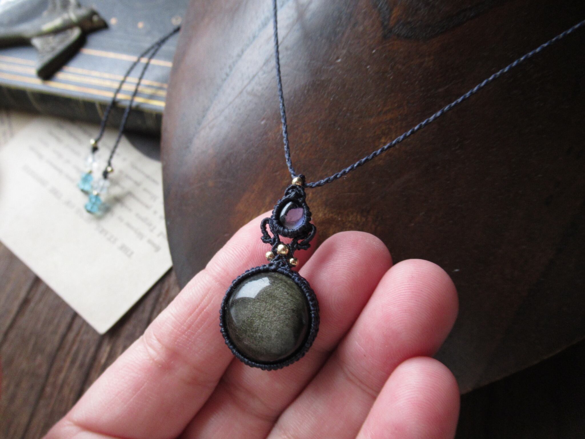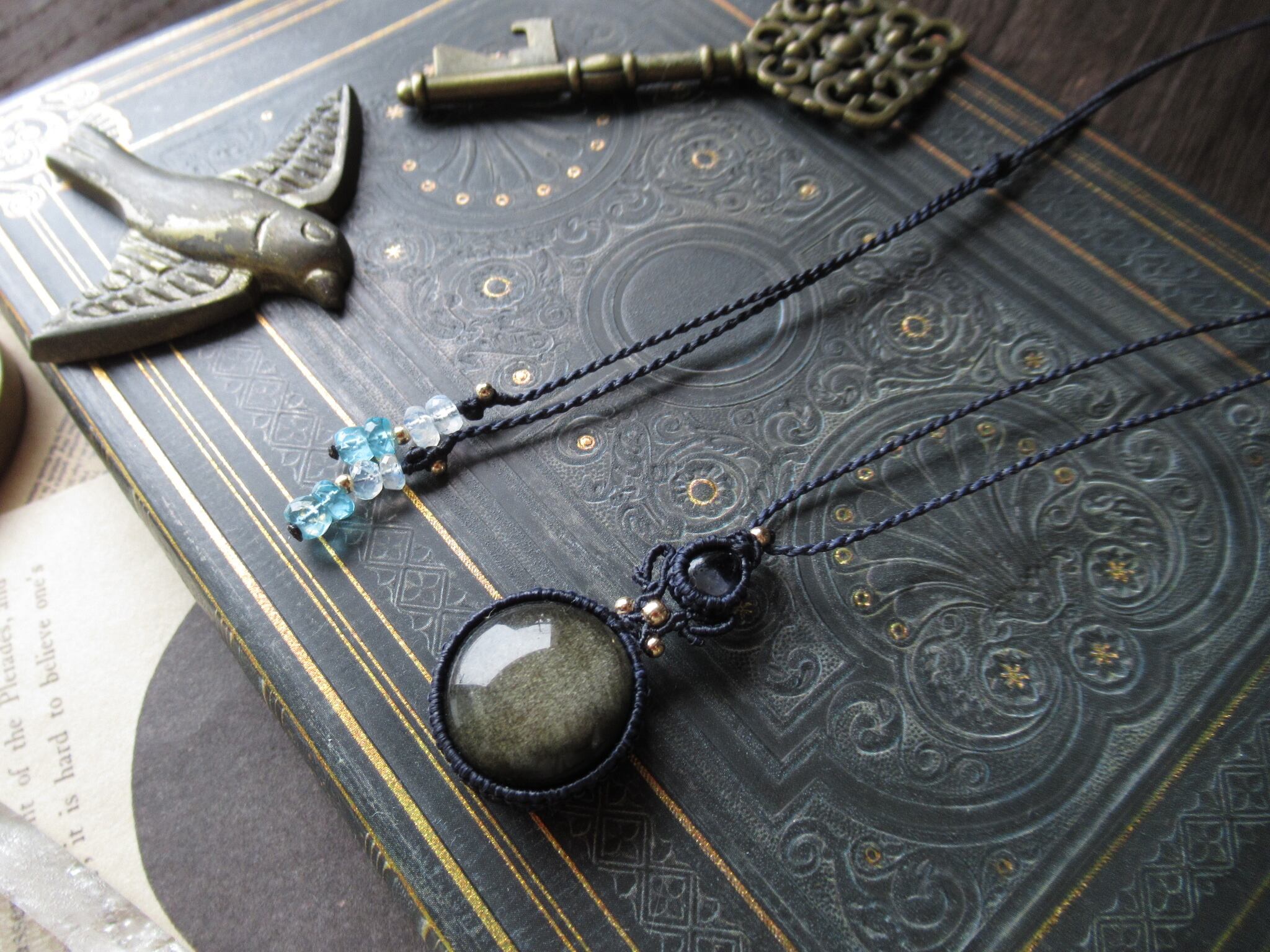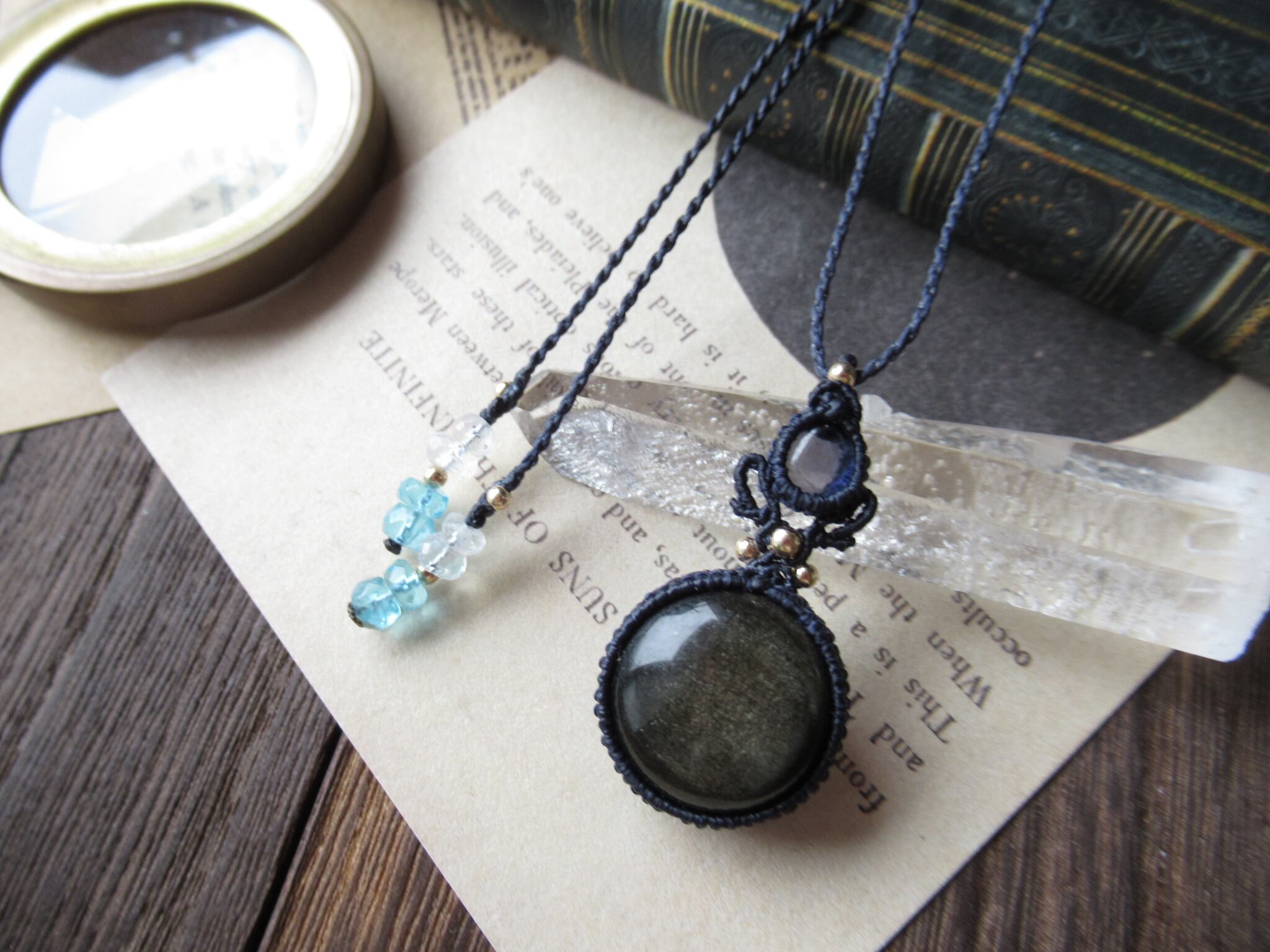 透明度の高い宝石質のアイオライトと表面にシラーが走るゴールドオブシディアンを組み合わせて、やや大ぶりで印象的なペンダントを製作致しました。