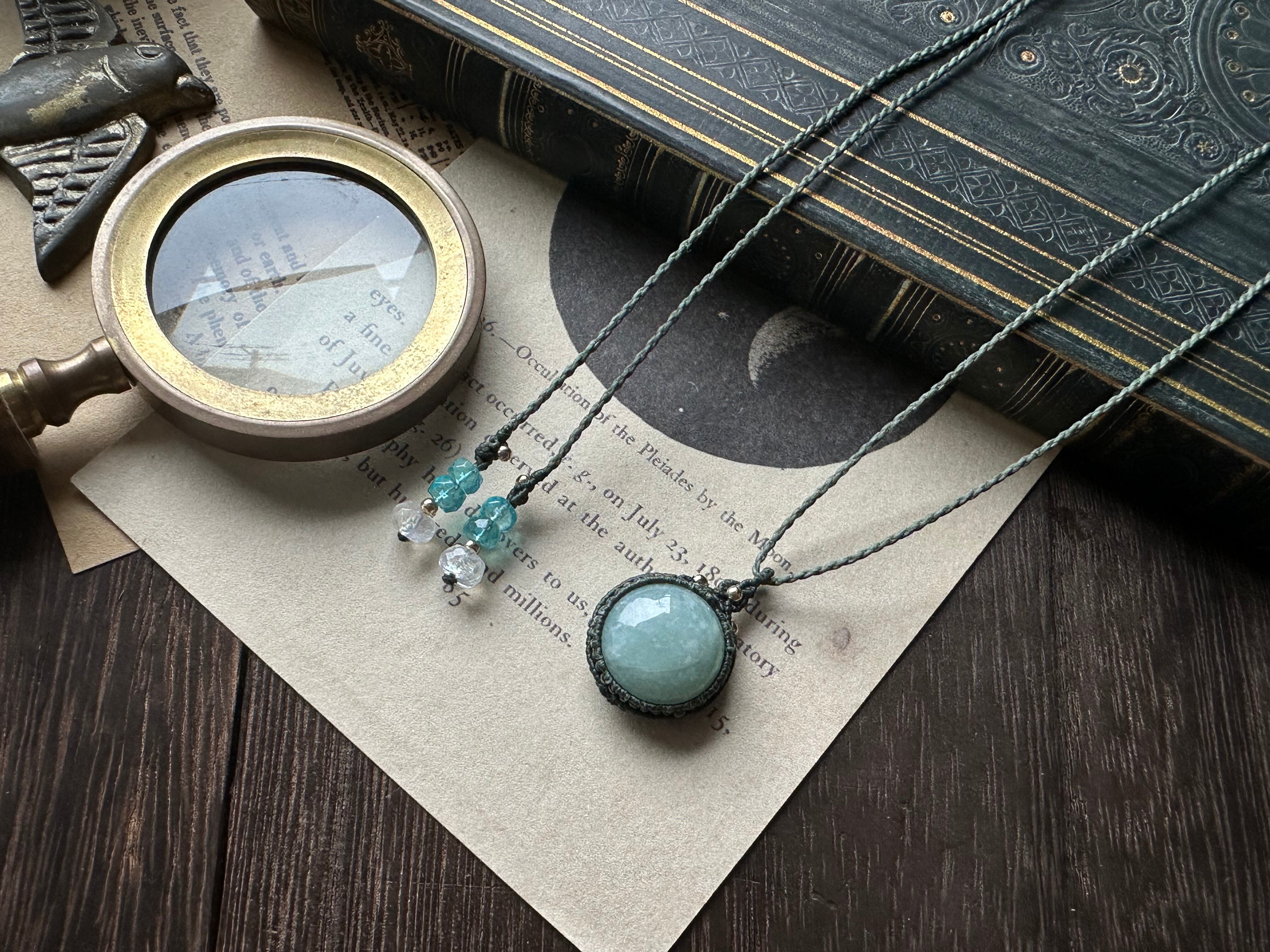 編み糸は0.25mmの極細糸で全体をすっきりしっかりと編み上げています。糸が細いですが強度があり、持ったりとせずすっきりとした印象で天然石の色合いや質感をよりお楽しみいただけます。
