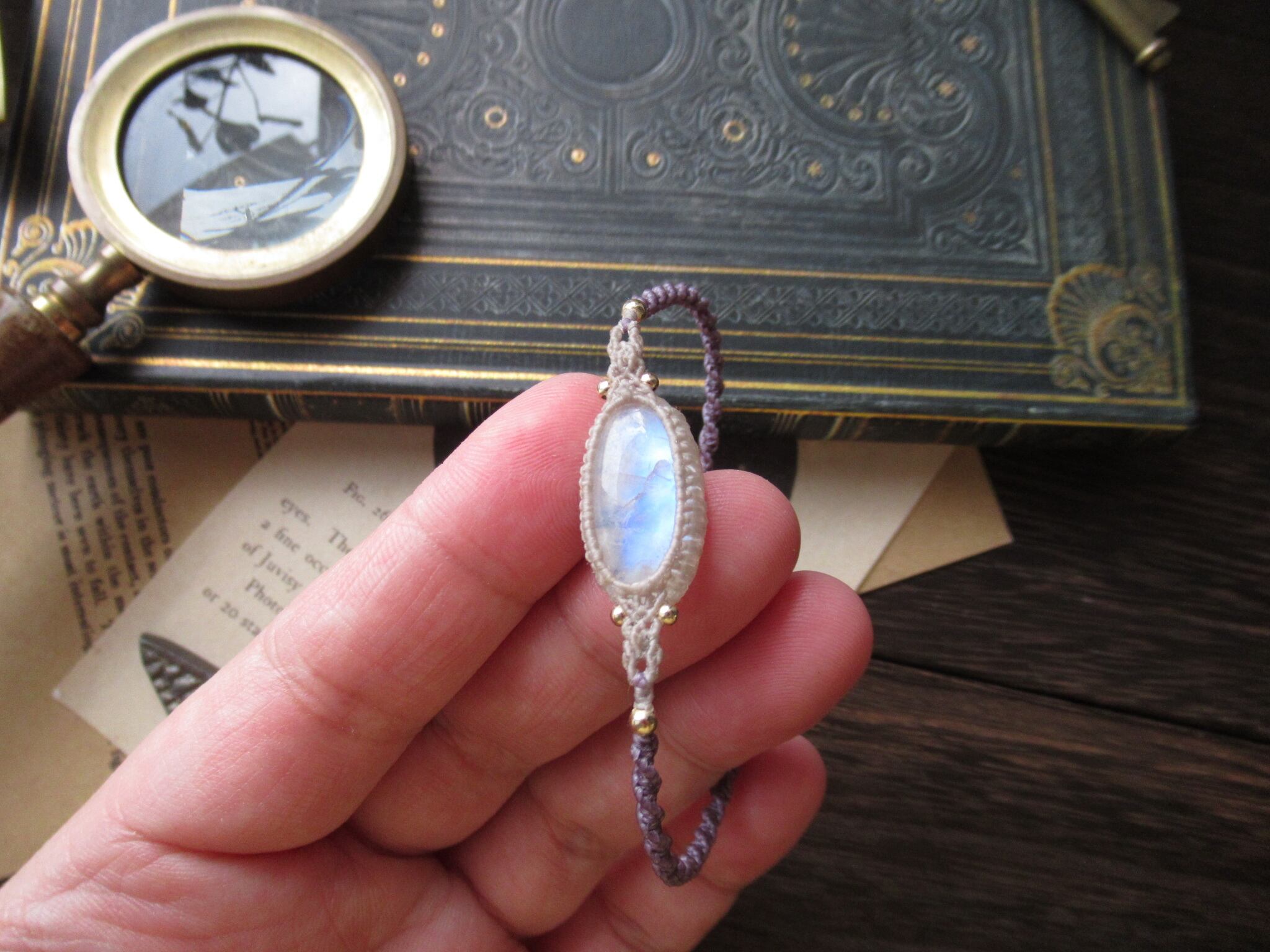 レインボームーンストーンの縁取りをホワイトブラウンの明るい糸色で、ブレスレットのリスト部分を落ち着いた葡萄酒色で編み込んでいます。