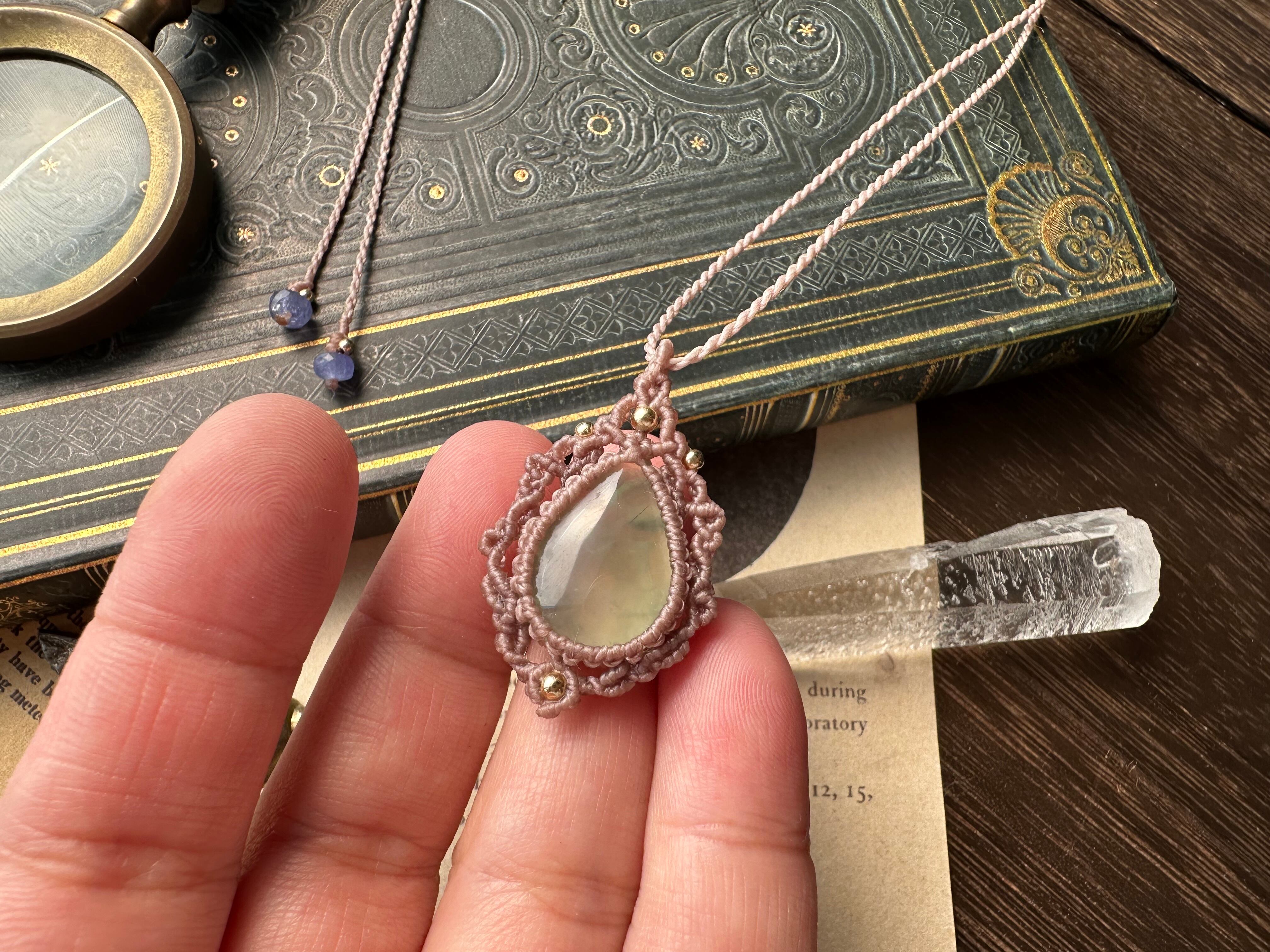 雫形プレナイトのマクラメフレーム編みペンダント /0.5mm仕上げ