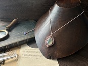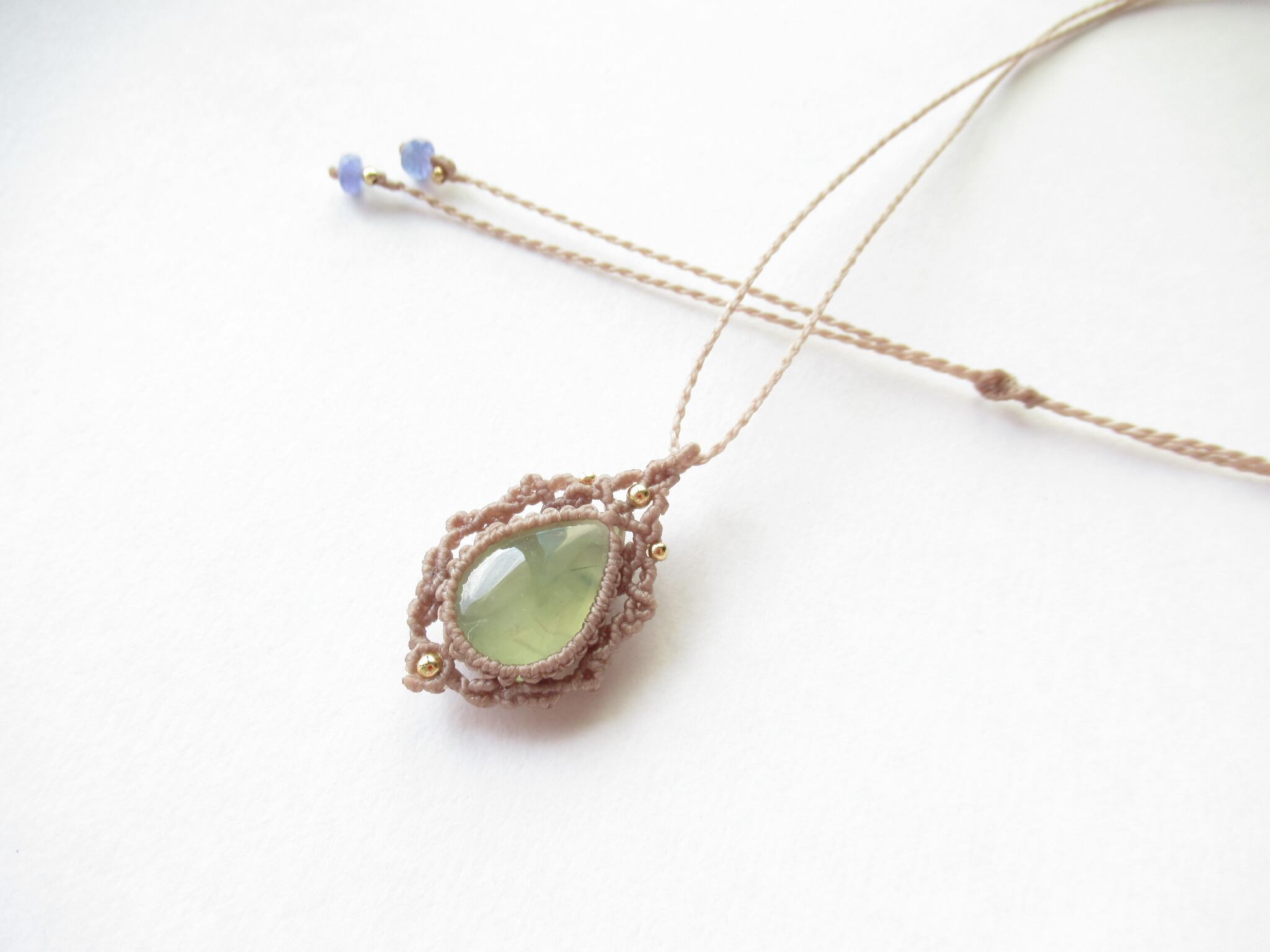 雫形のプレナイトを使い、フレームにマクラメらしい編み込みを施してペンダントに仕立てました。