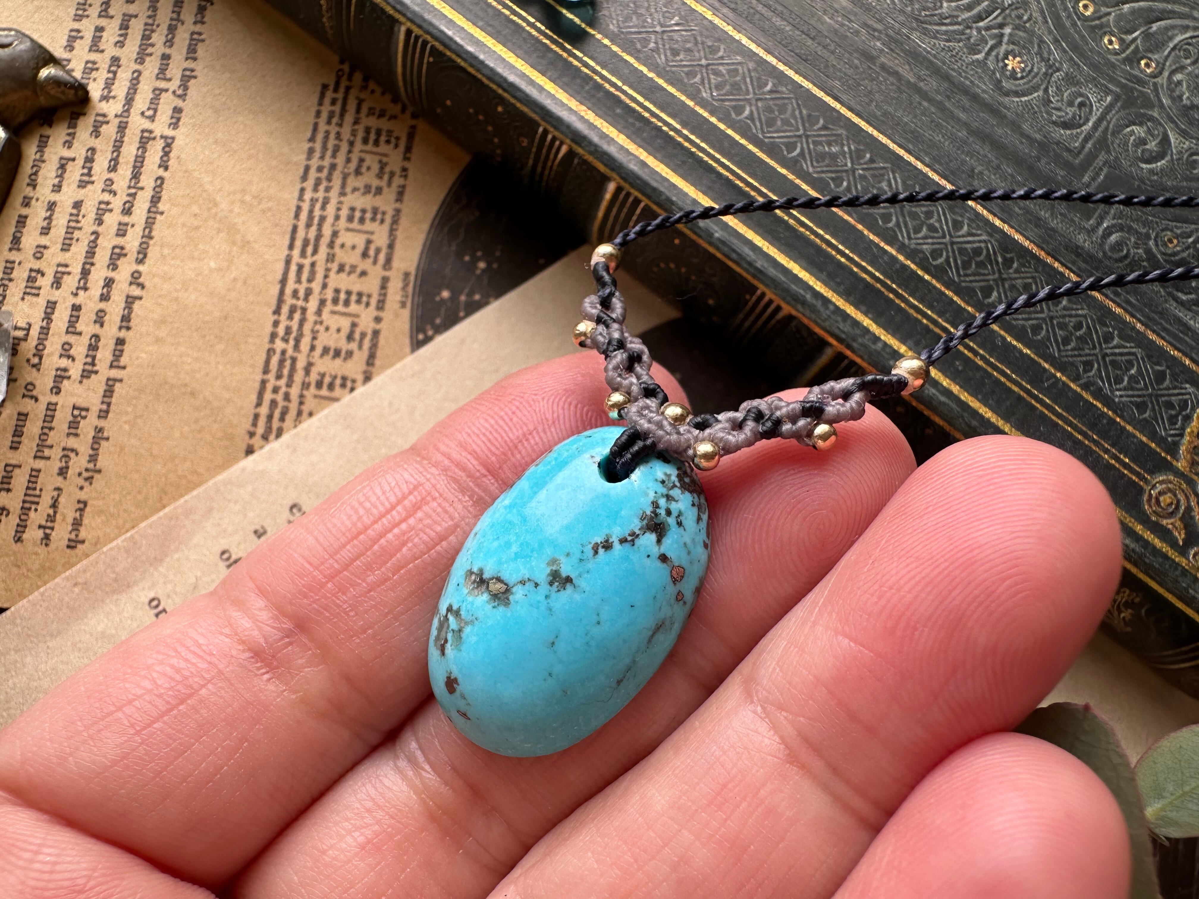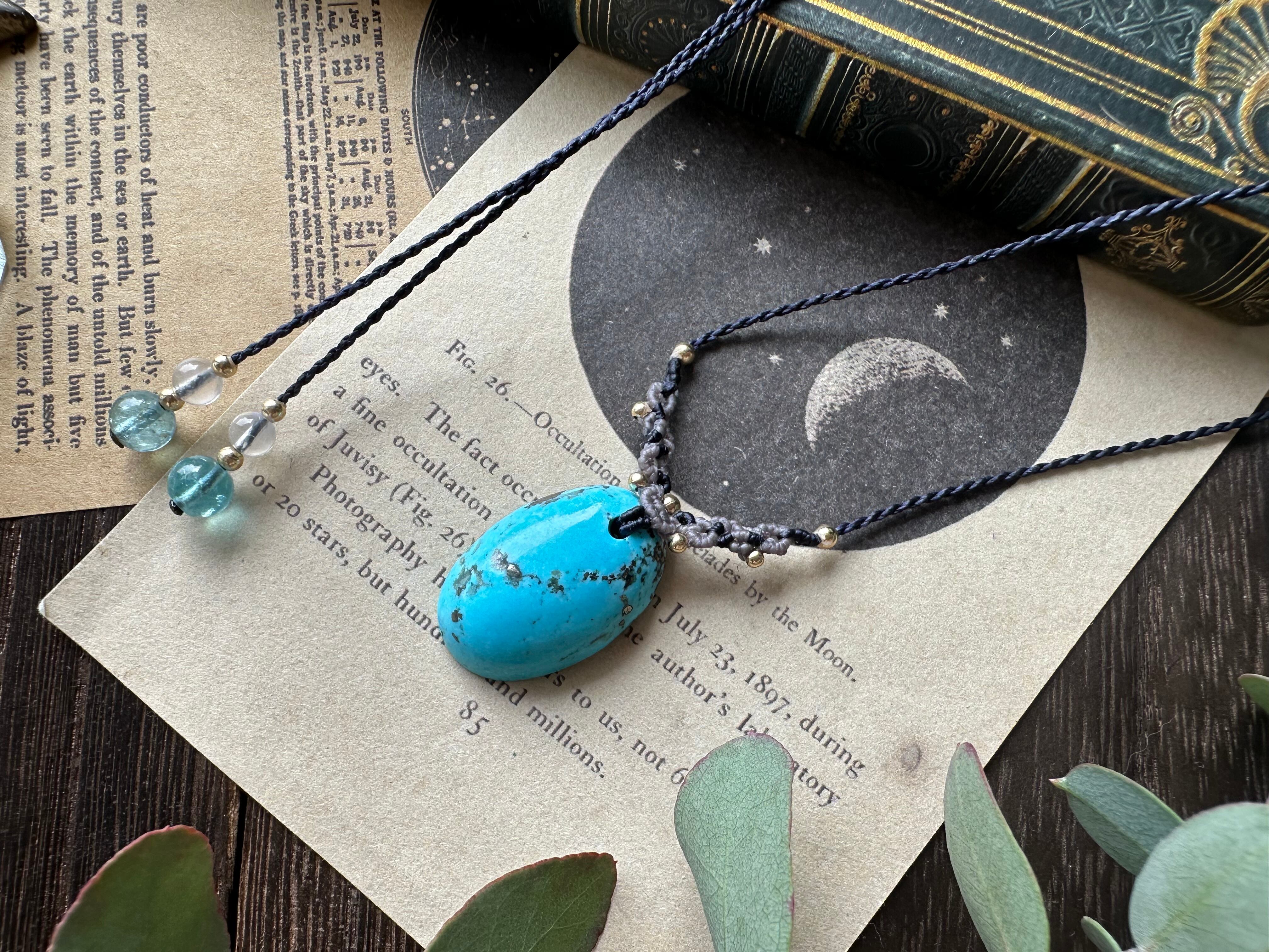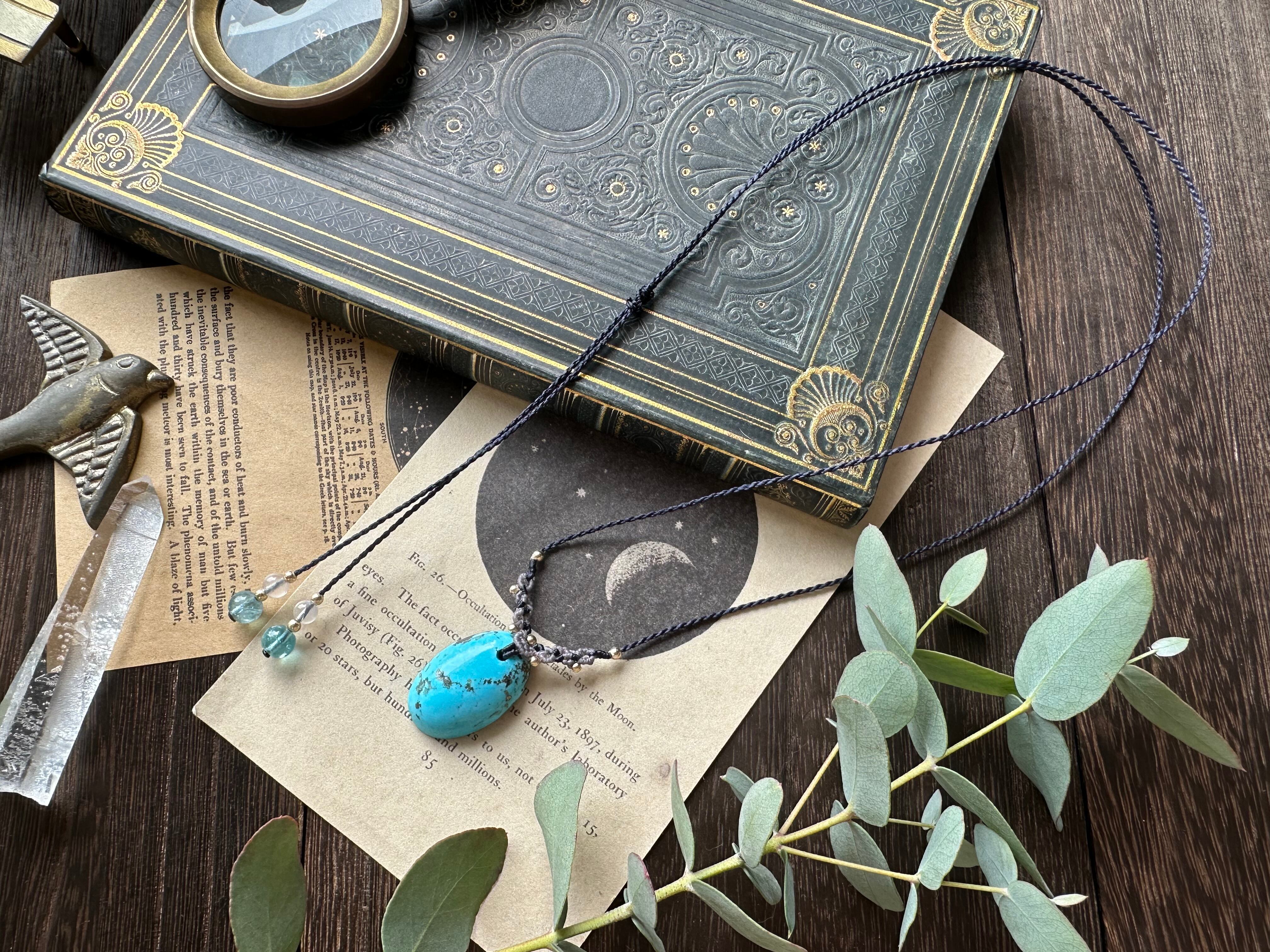 大粒で春の空色のような優しいスカイブルーのペルシャンターコイズでマクラメネックレスをお仕立ていたしました。