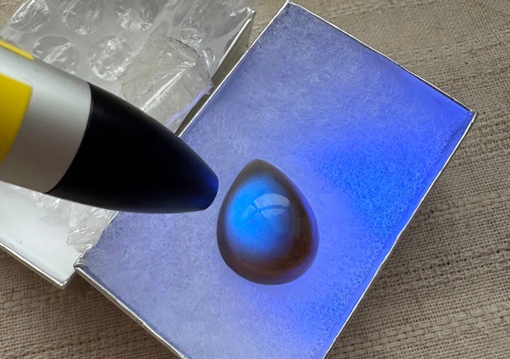 UVライトなどを当てていただくと、青色に蛍光する青琥珀です。