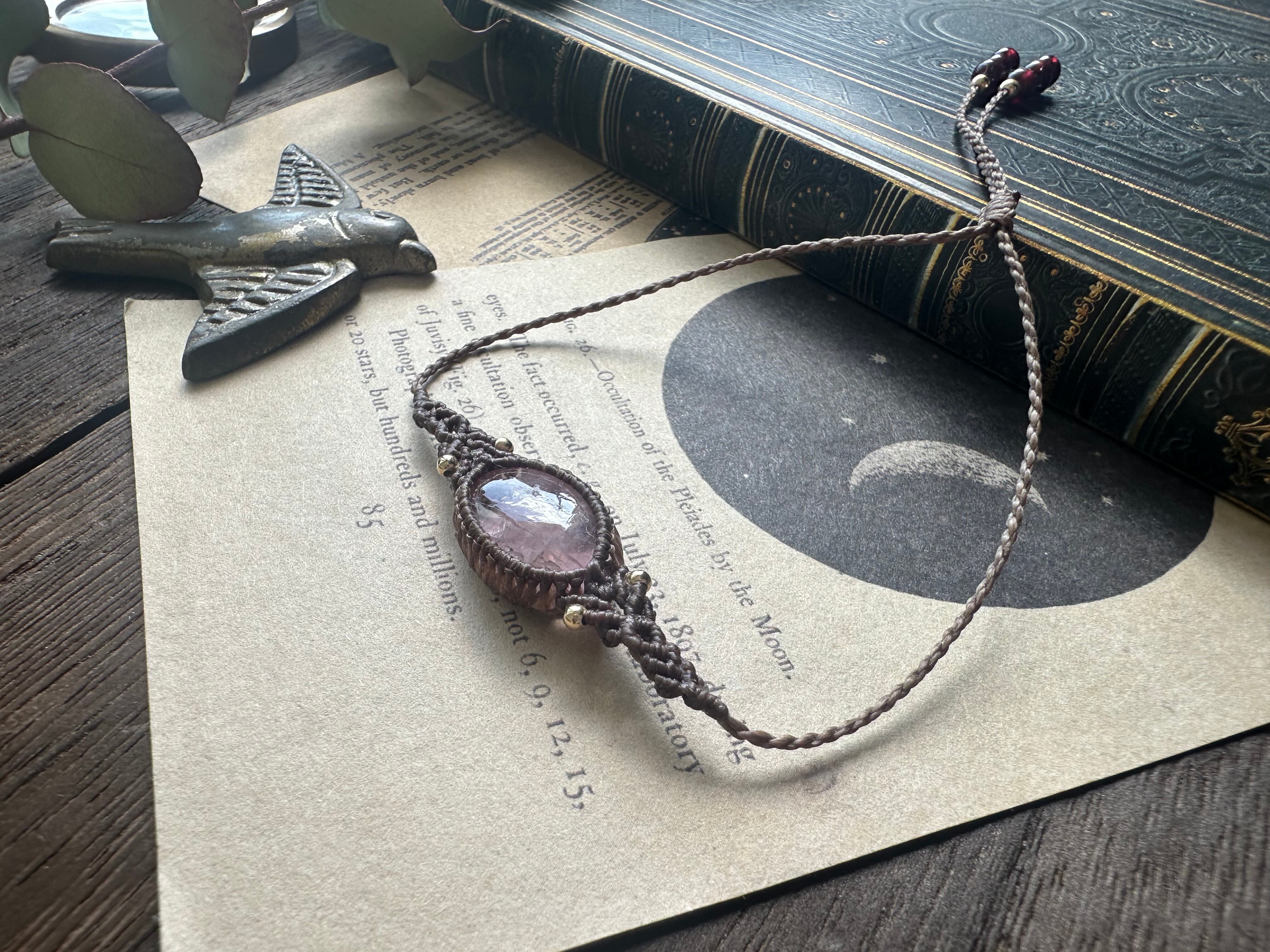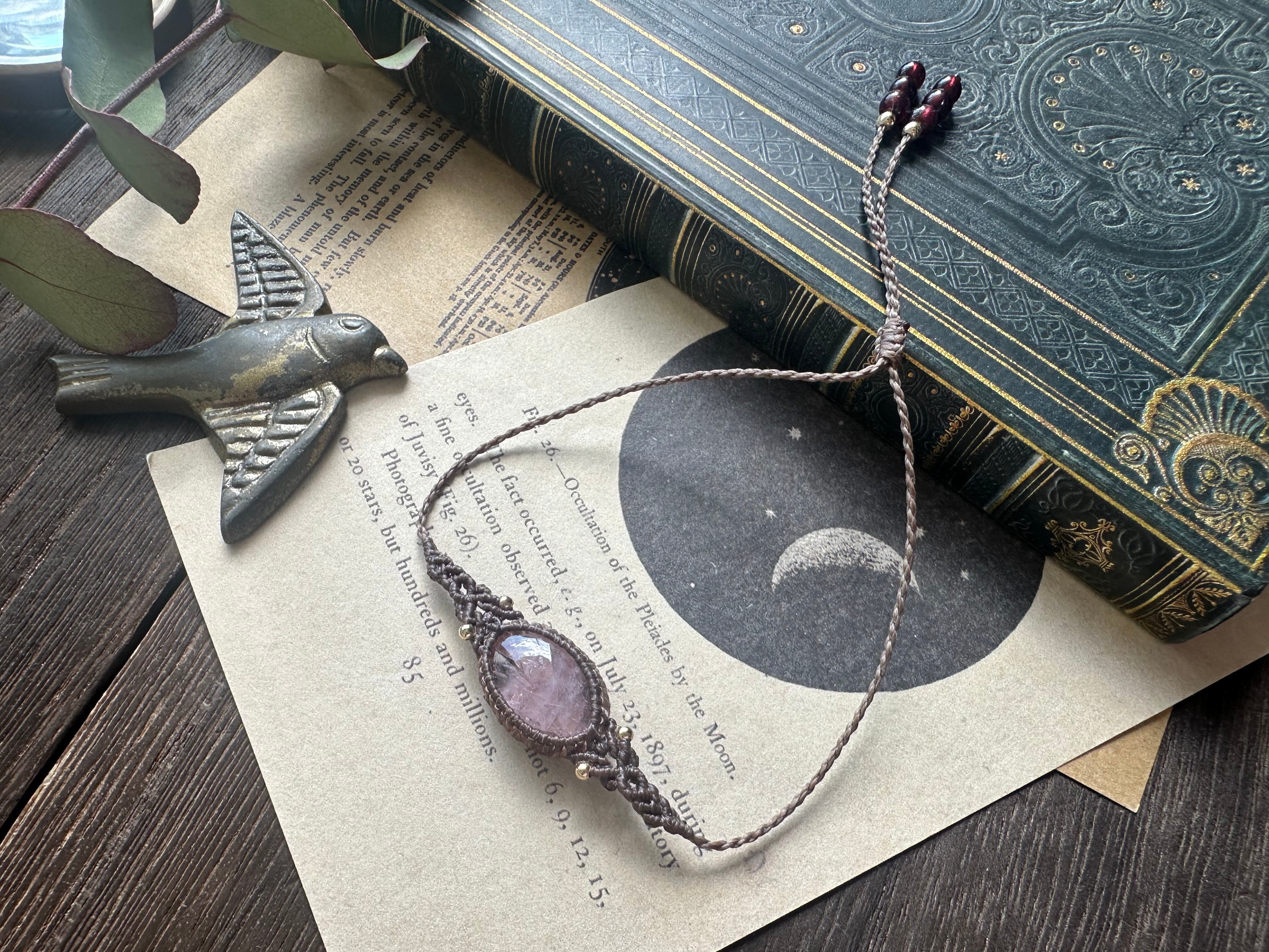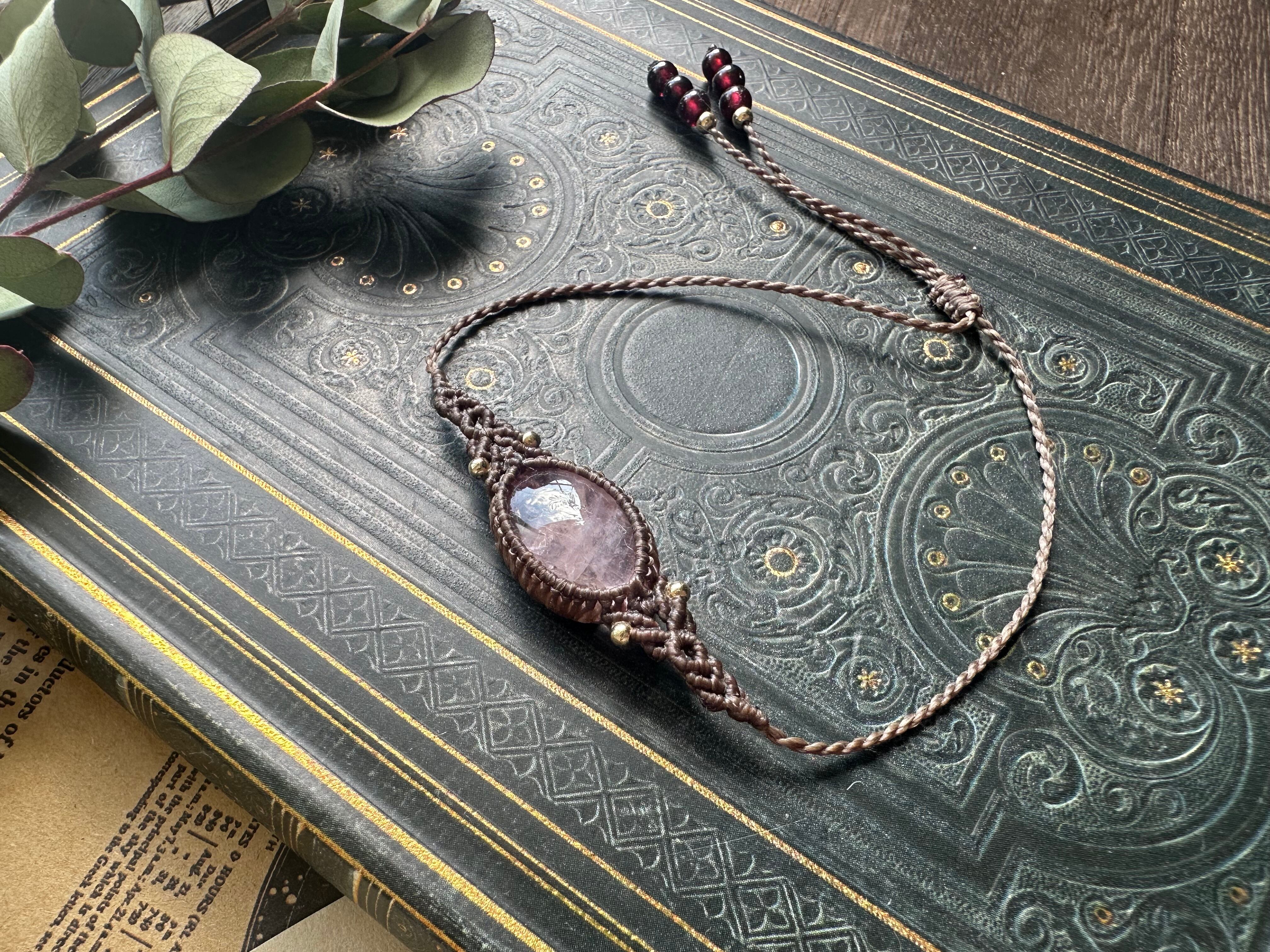 モルガナイトは透明感が感じられる桜色の優しいお色です。フレームを0.25mmの糸で縁取り軽さを出しながら、左右の編み込みはしっかりと0.5mmの糸で編み上げています。