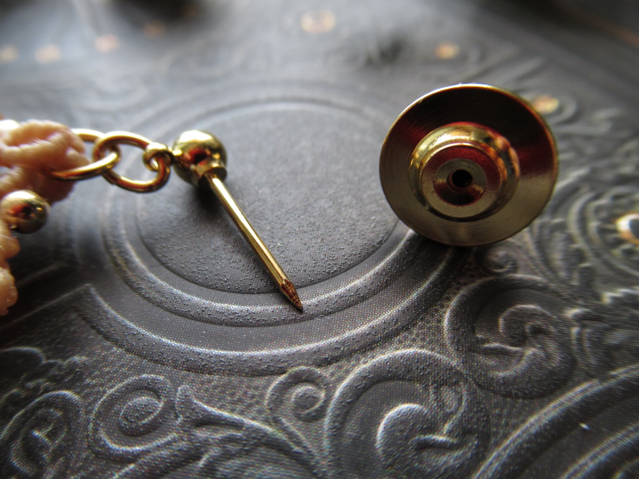 一つ穴タイプのピンブローチです。金具部分の結合でゆらゆらと振動が伝わる度に揺れます。