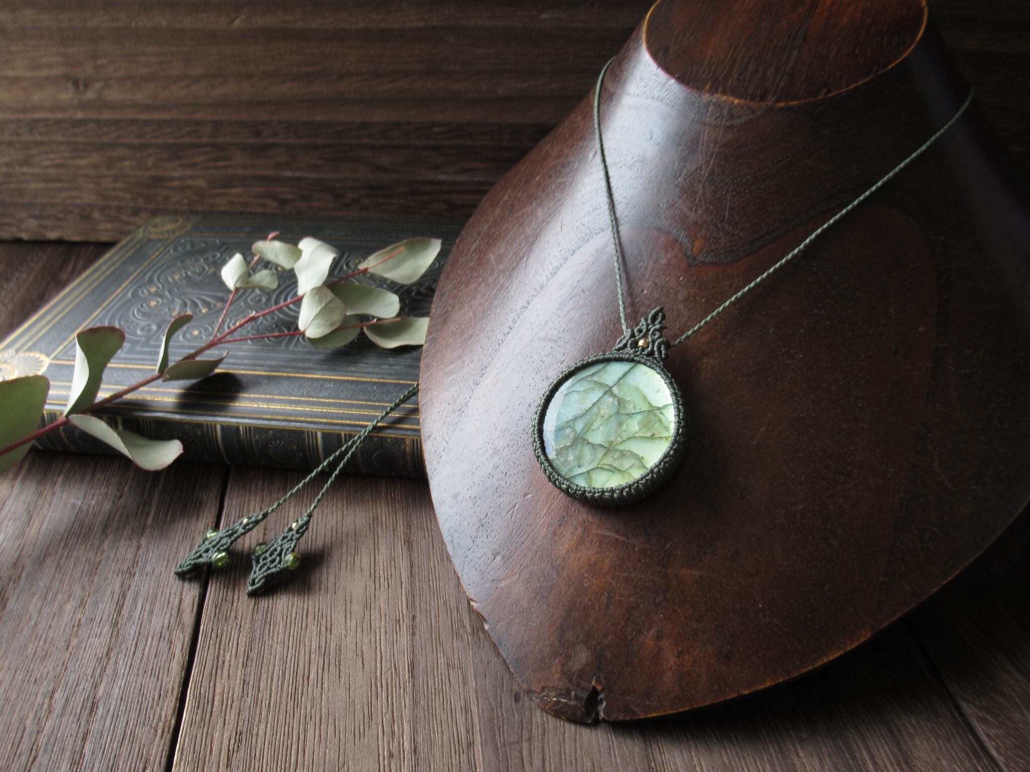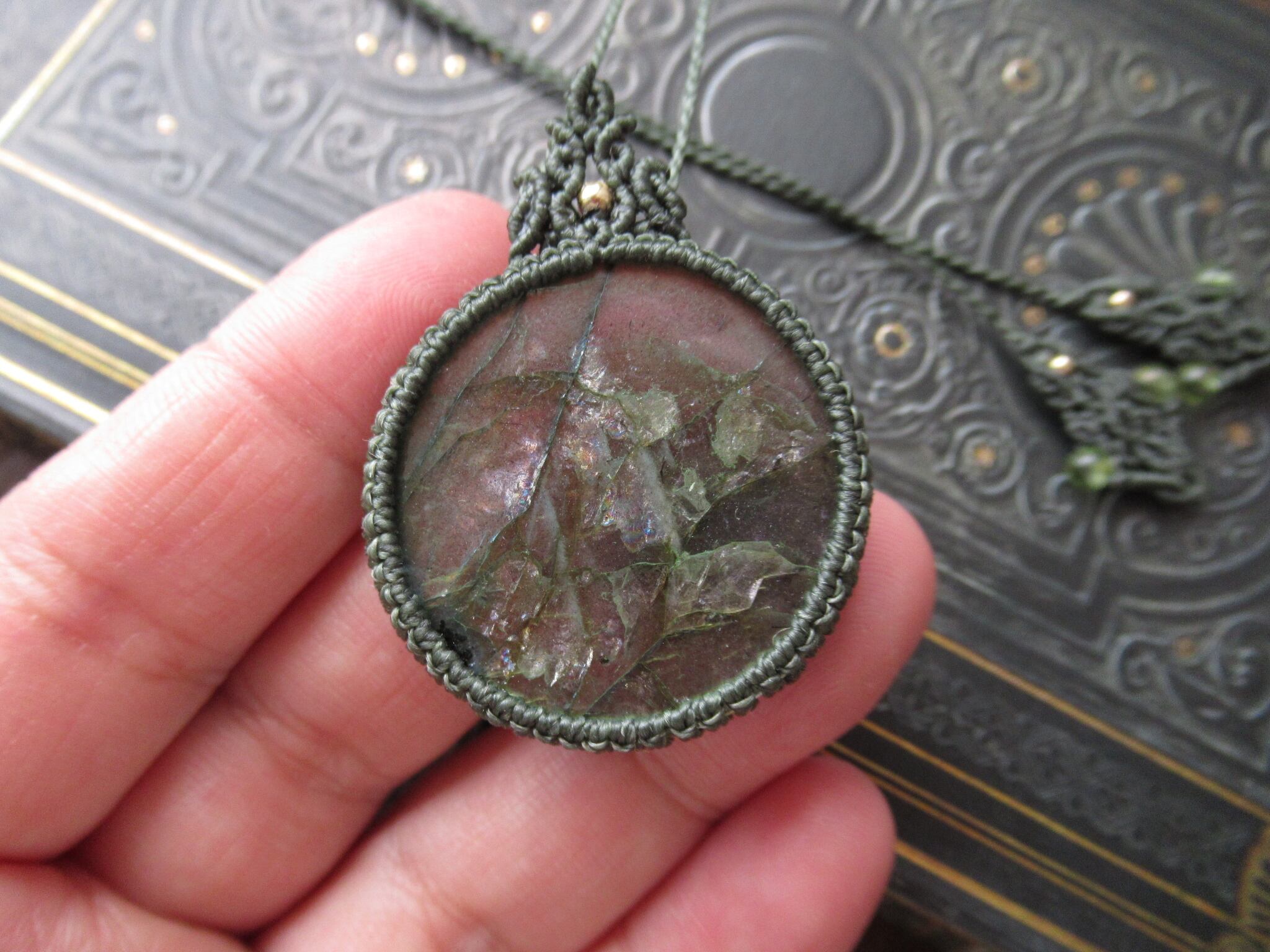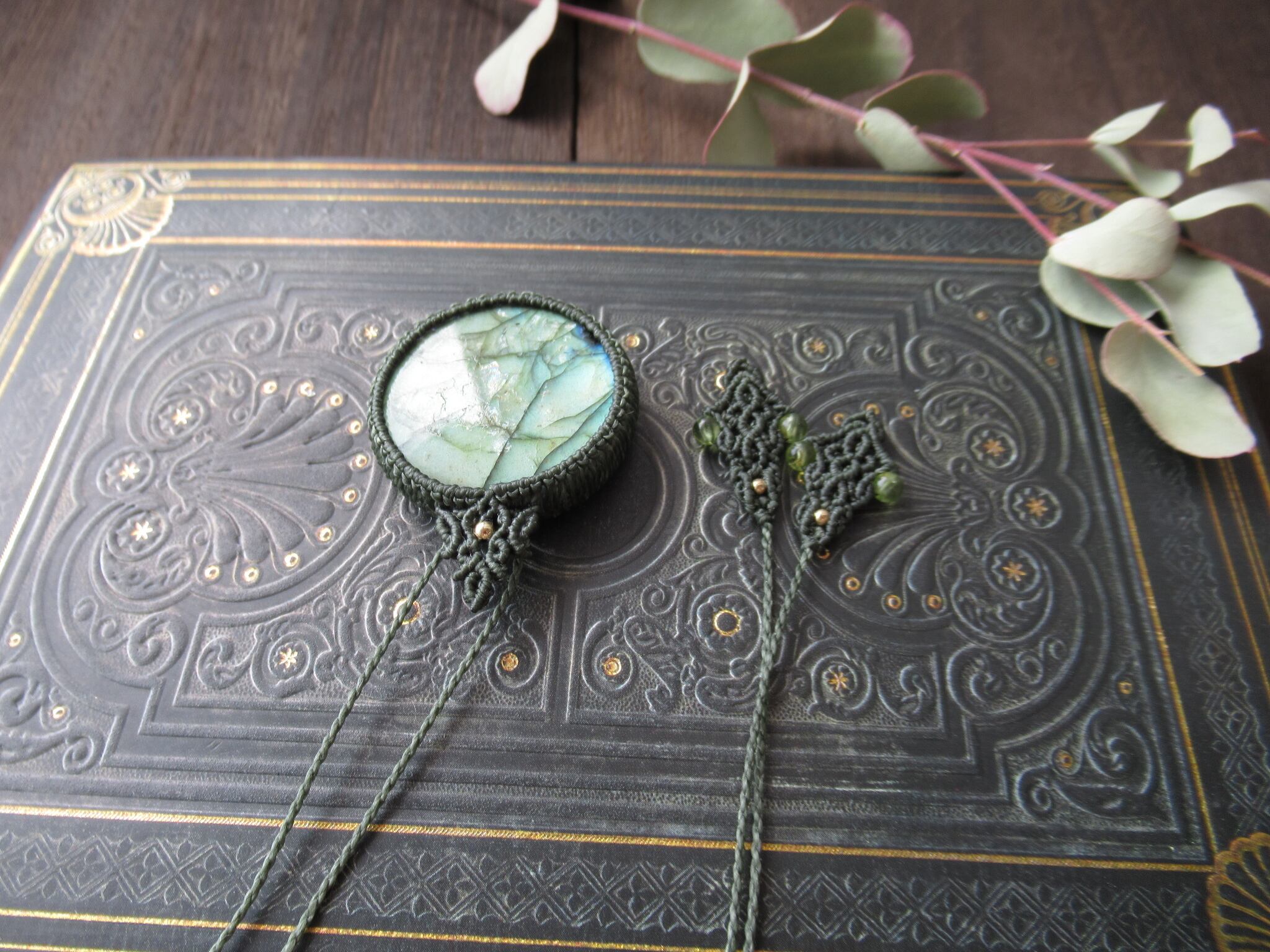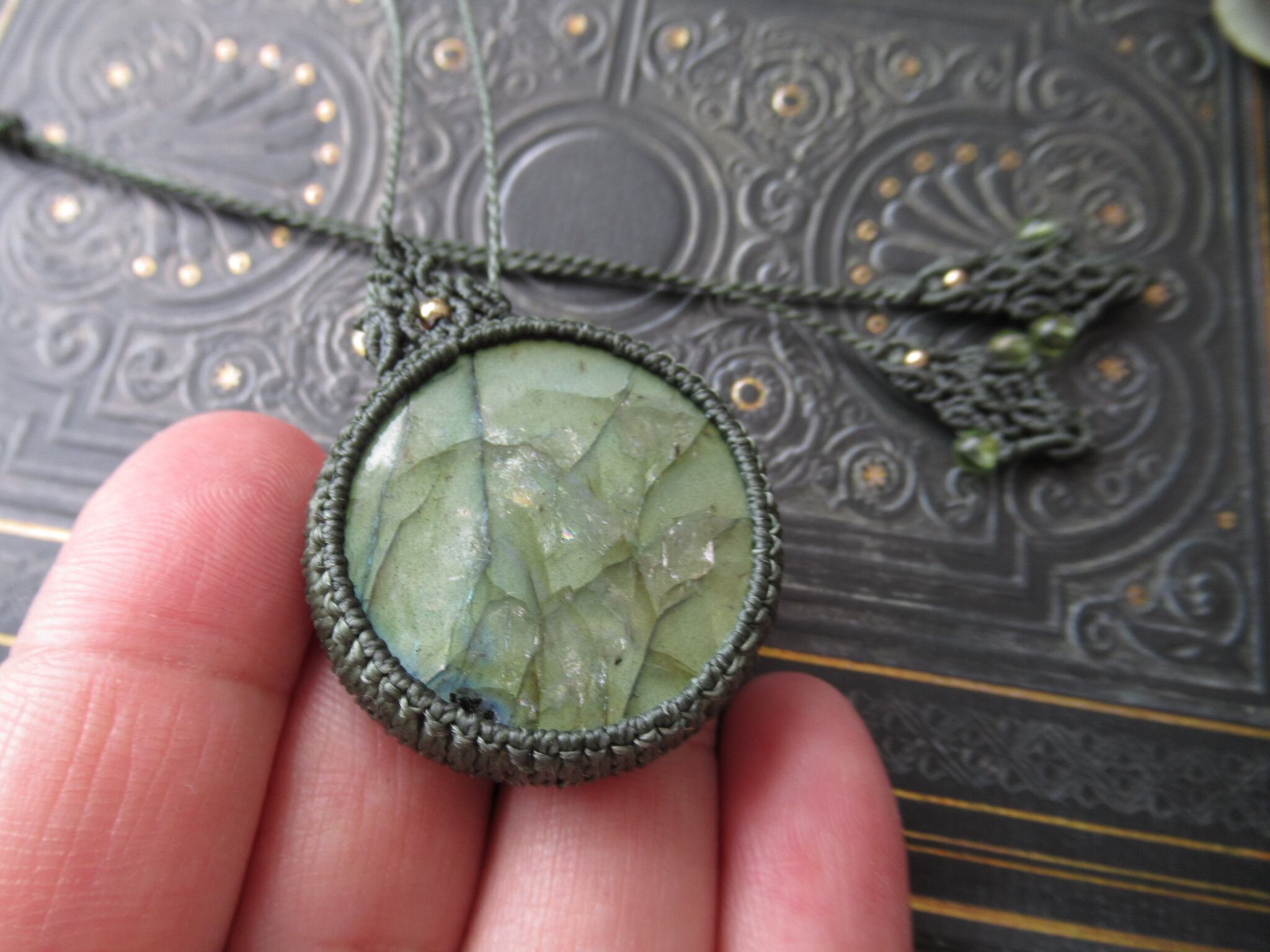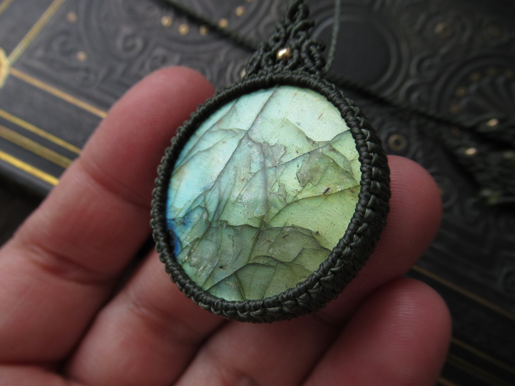 大粒の満月のようなラブラドライトをマクラメペンダントに仕立てました。