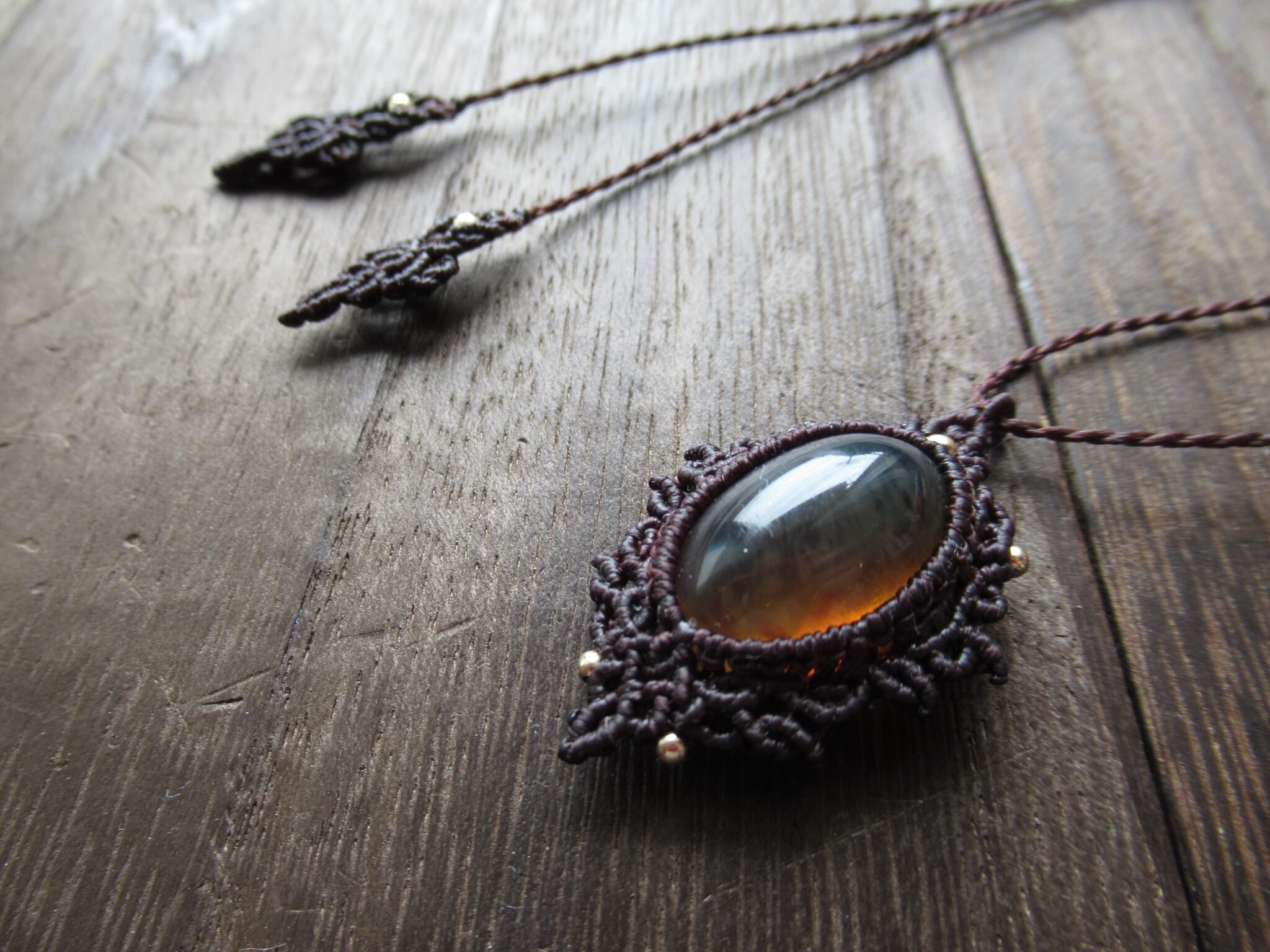 0.5mmの糸でマクラメらしい流線形の編み込みを丁寧に編み込んでいます。琥珀のルース自体が天然石と比べてとても軽いので、重いペンダントだと肩こりが心配という方におすすめです。