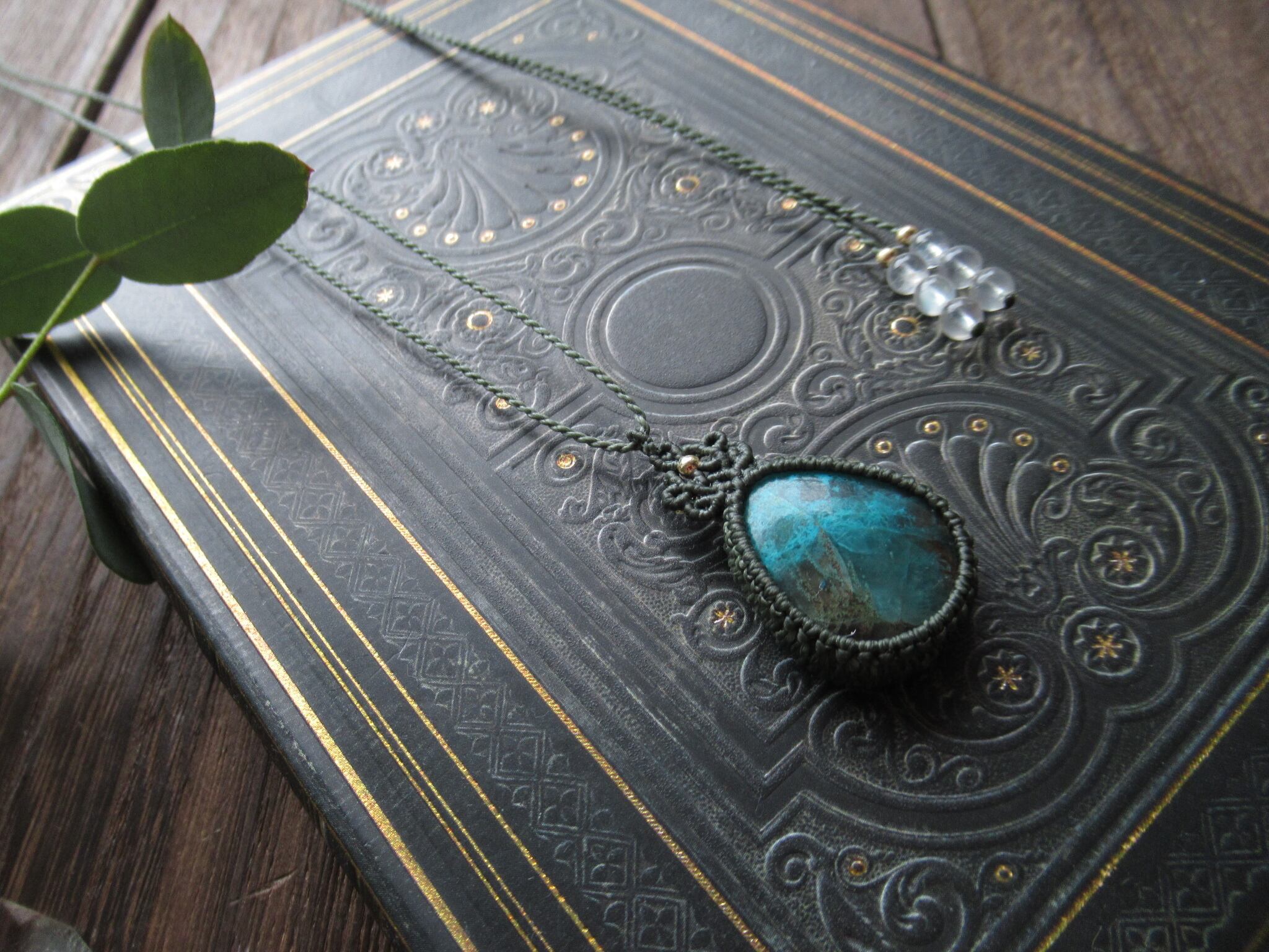 デザインはごくシンプルに編み込んでおり、ペンダントトップにマクラメらしいもy法を少し編み込んでワンポイントにしております。結び石は水滴のようなペリステライトをあしらっております。