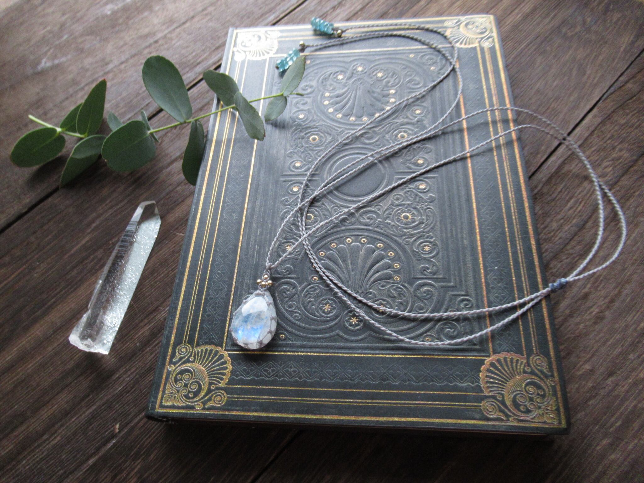 透明感がある石質に角度によって美しいシラーがパッと浮かび上がります。雫型の形状と相まって、神秘的な光を放つ雫のような佇まいのペンダントです。