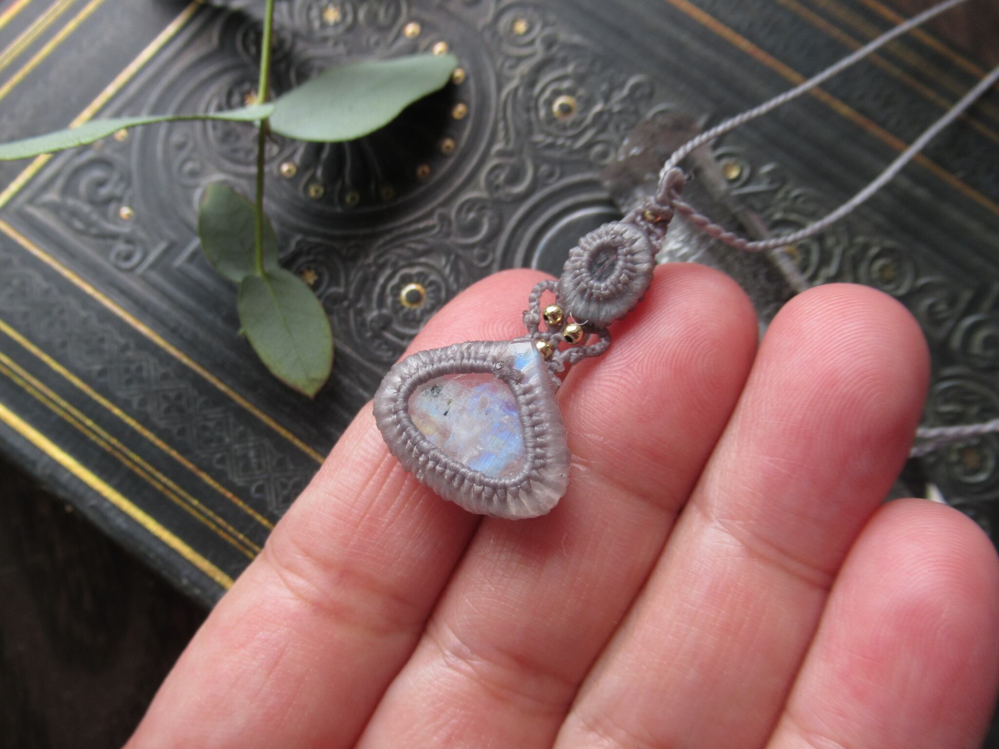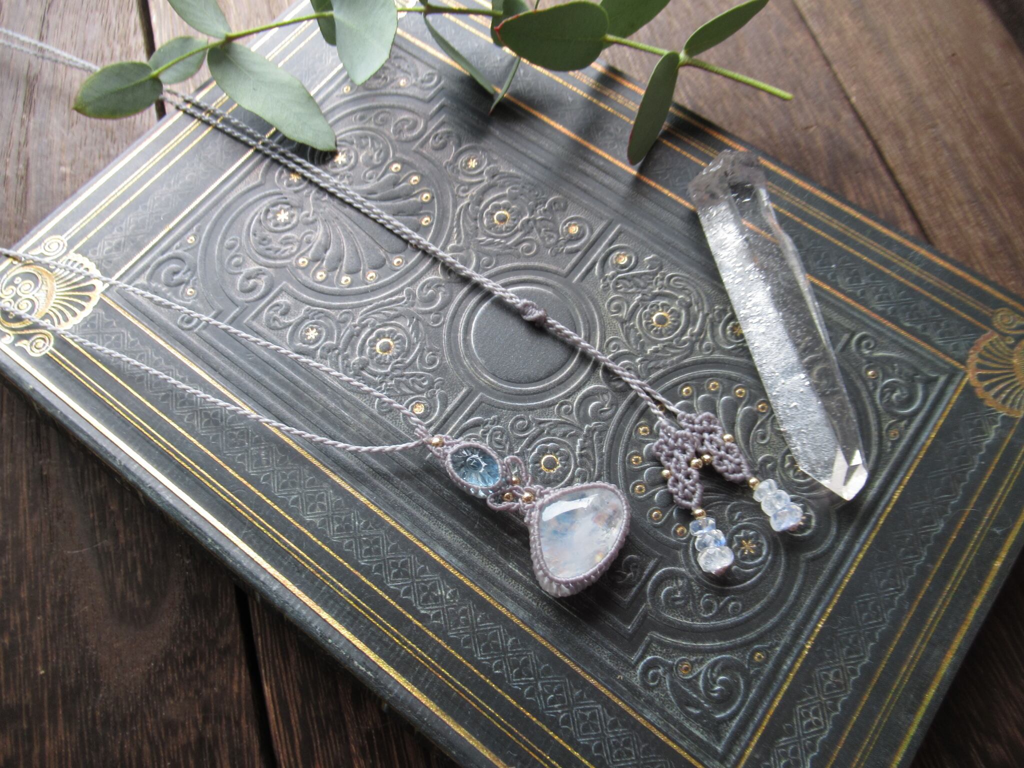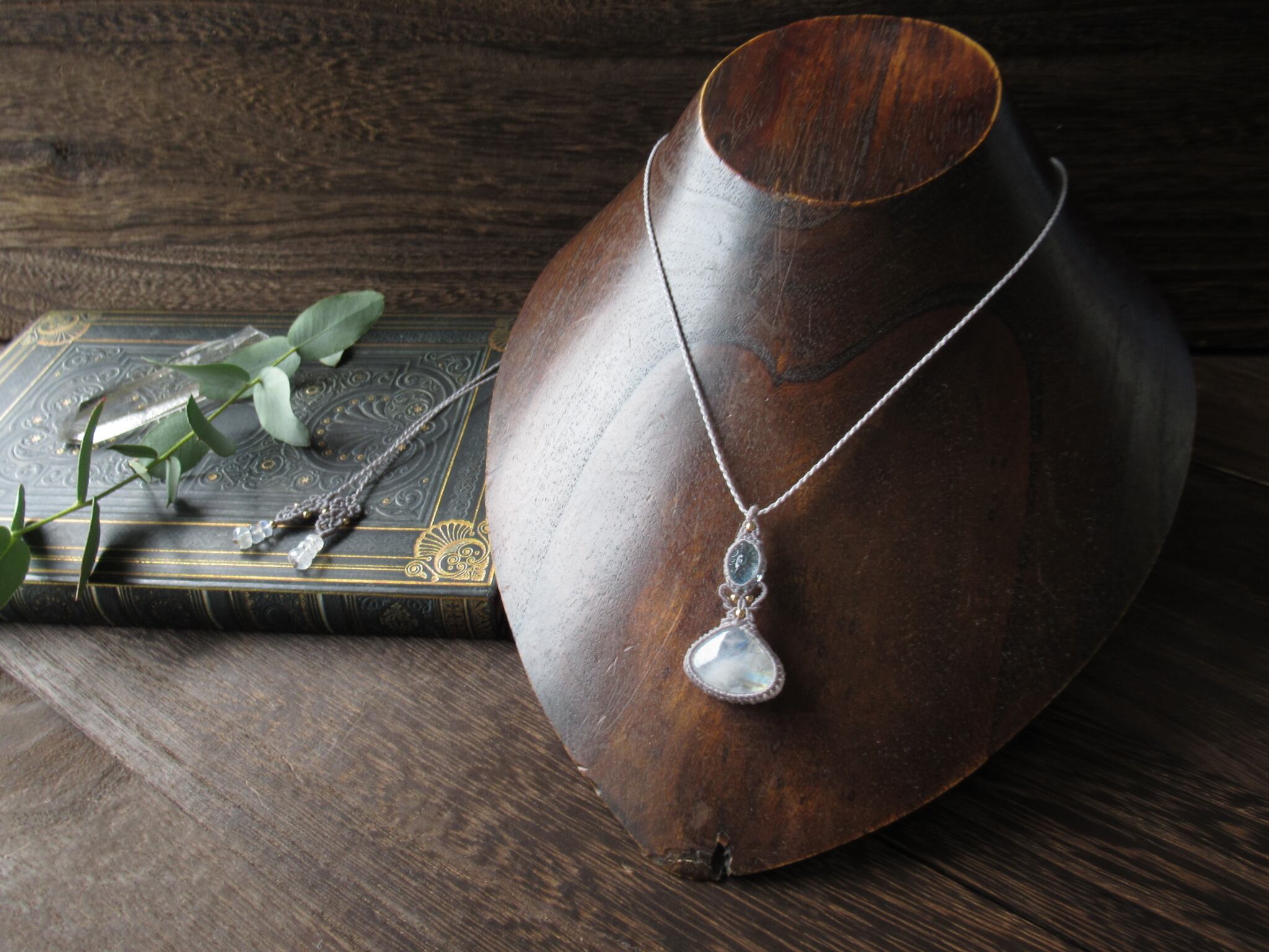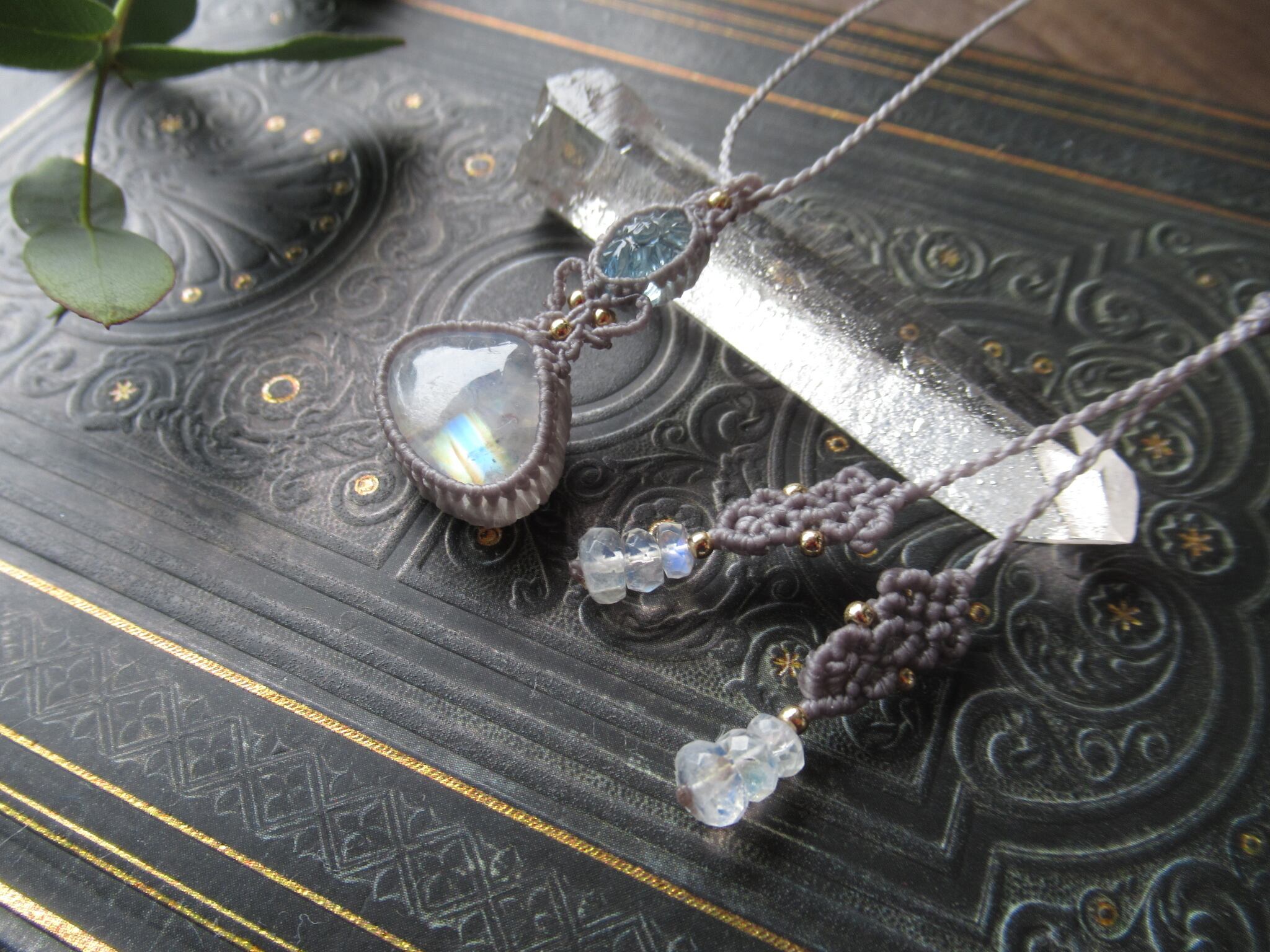 お花模様のアクアマリンとぷっくりレインボームーンストーンのマクラメペンダント