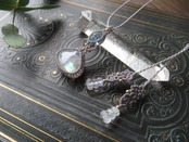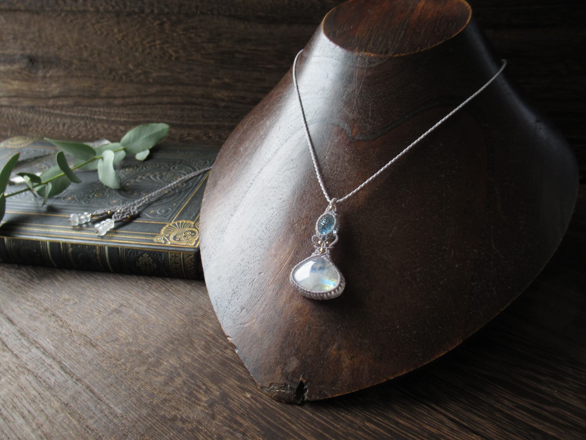 お花模様のアクアマリンとシラーがとても美しいレインボームーンストーンでペンダントを仕立てました。