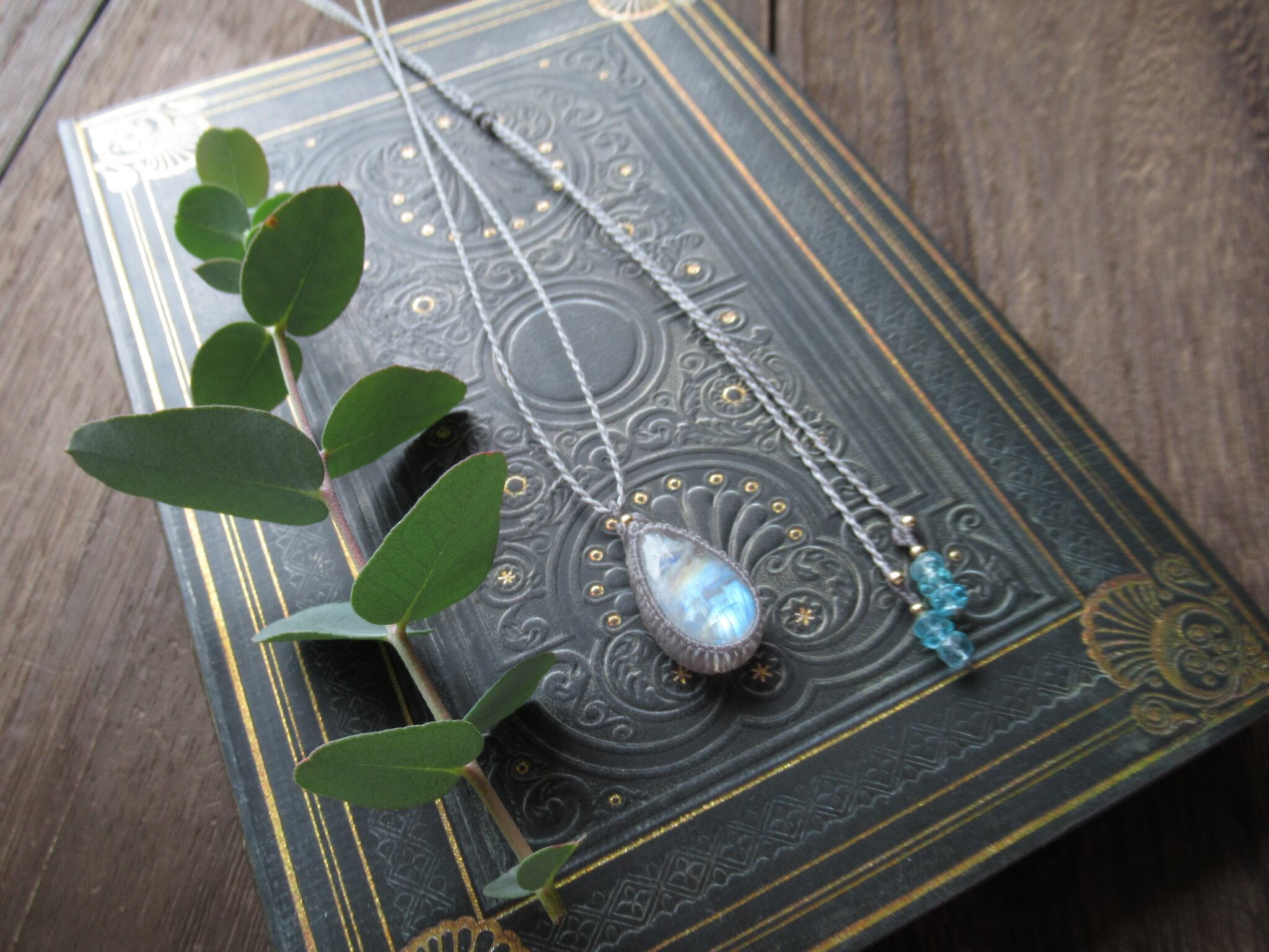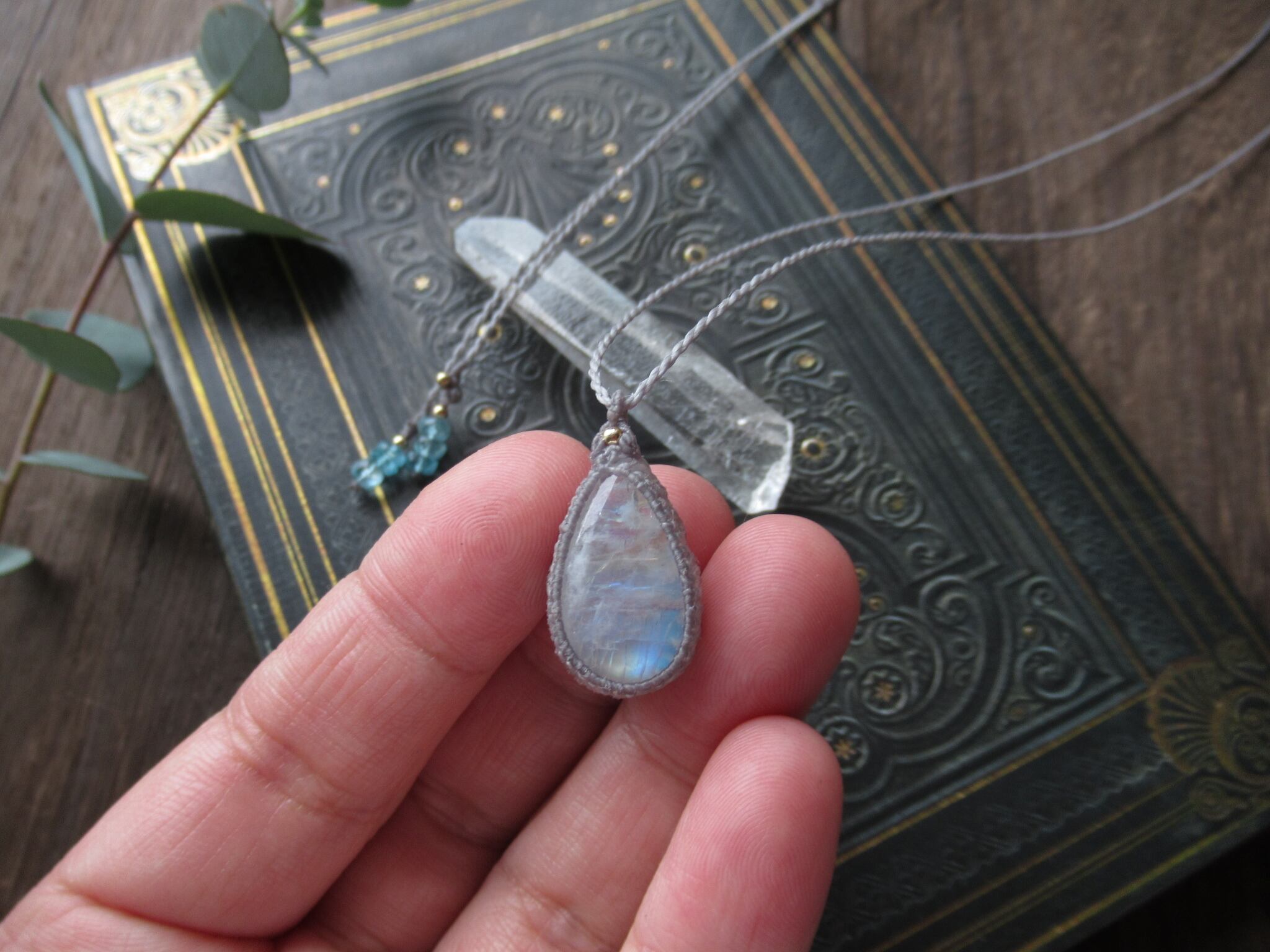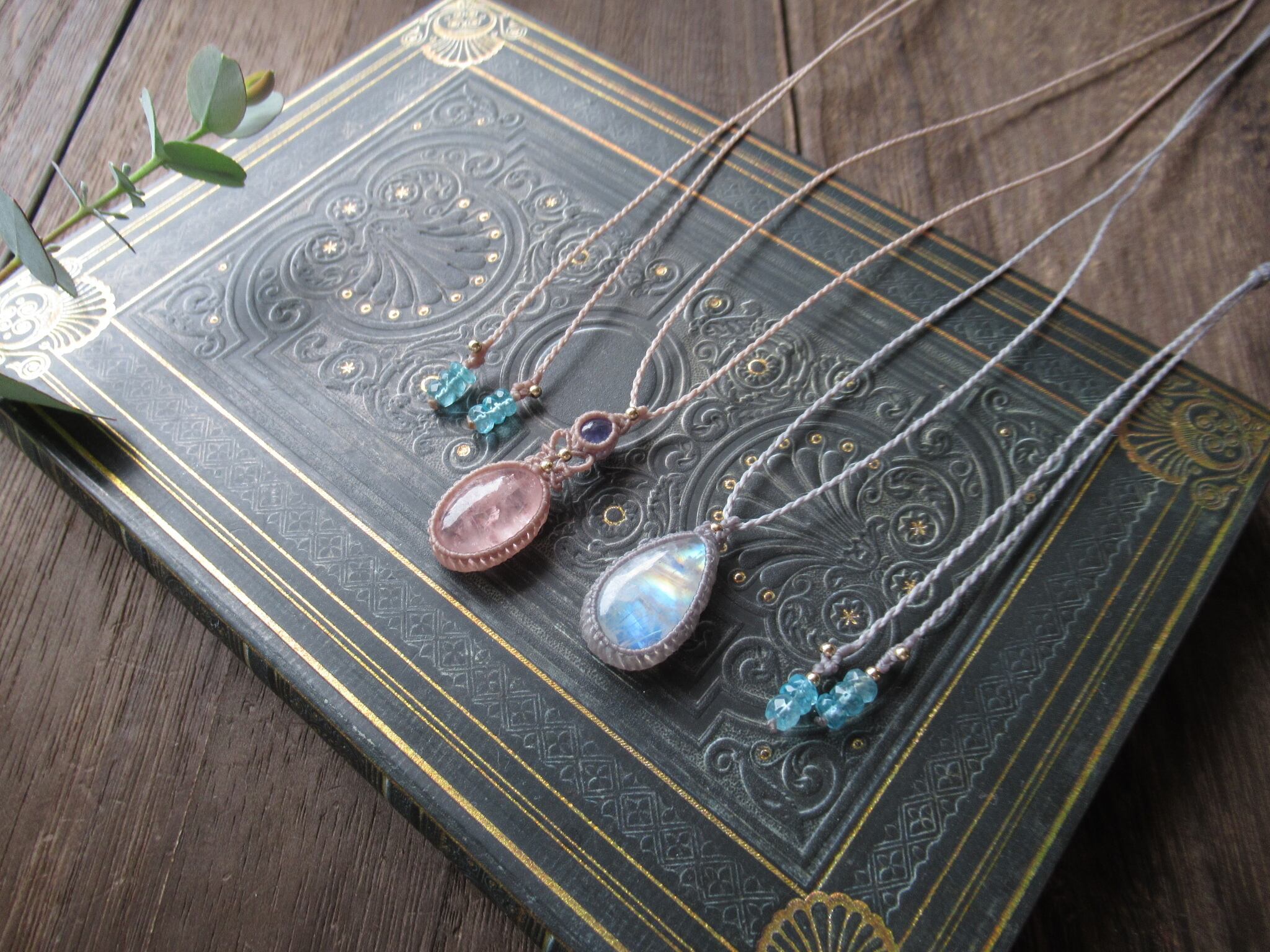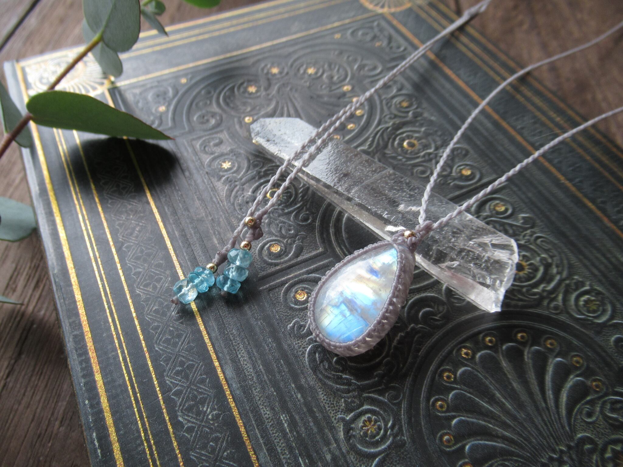 透明感がある石質に角度によって美しいシラーがパッと浮かび上がります。雫型の形状と相まって、神秘的な光を放つ雫のような佇まいのペンダントです。強めのシラーが全体に見られ、夕方の雲間から様々な光の梯子が出ているような幻想的な輝きです。