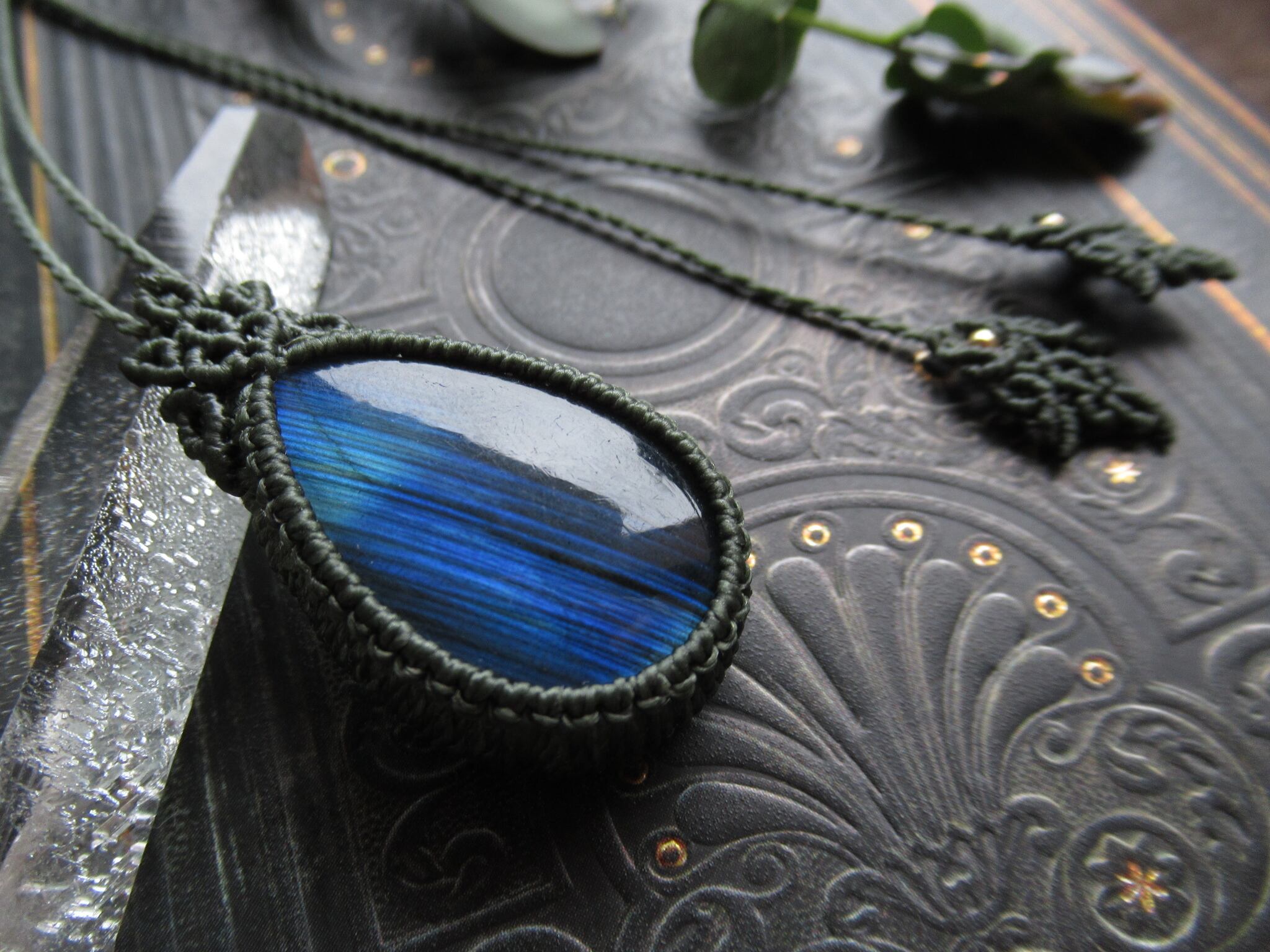 流星のような美しいシラーが見られるしずく型のラブラドライトをマクラメペンダントに仕立てました。