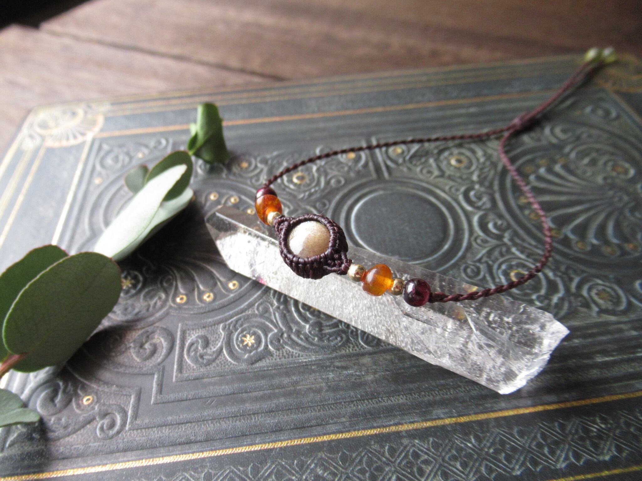 左右にバルティックアンバーとガーネットをあしらい、結び石にペリドットを組み合わせております。落ち着いた色合いとデザインですので、明るめの糸が肌浮きして苦手という方でも使いやすいシルエットとカラーです。