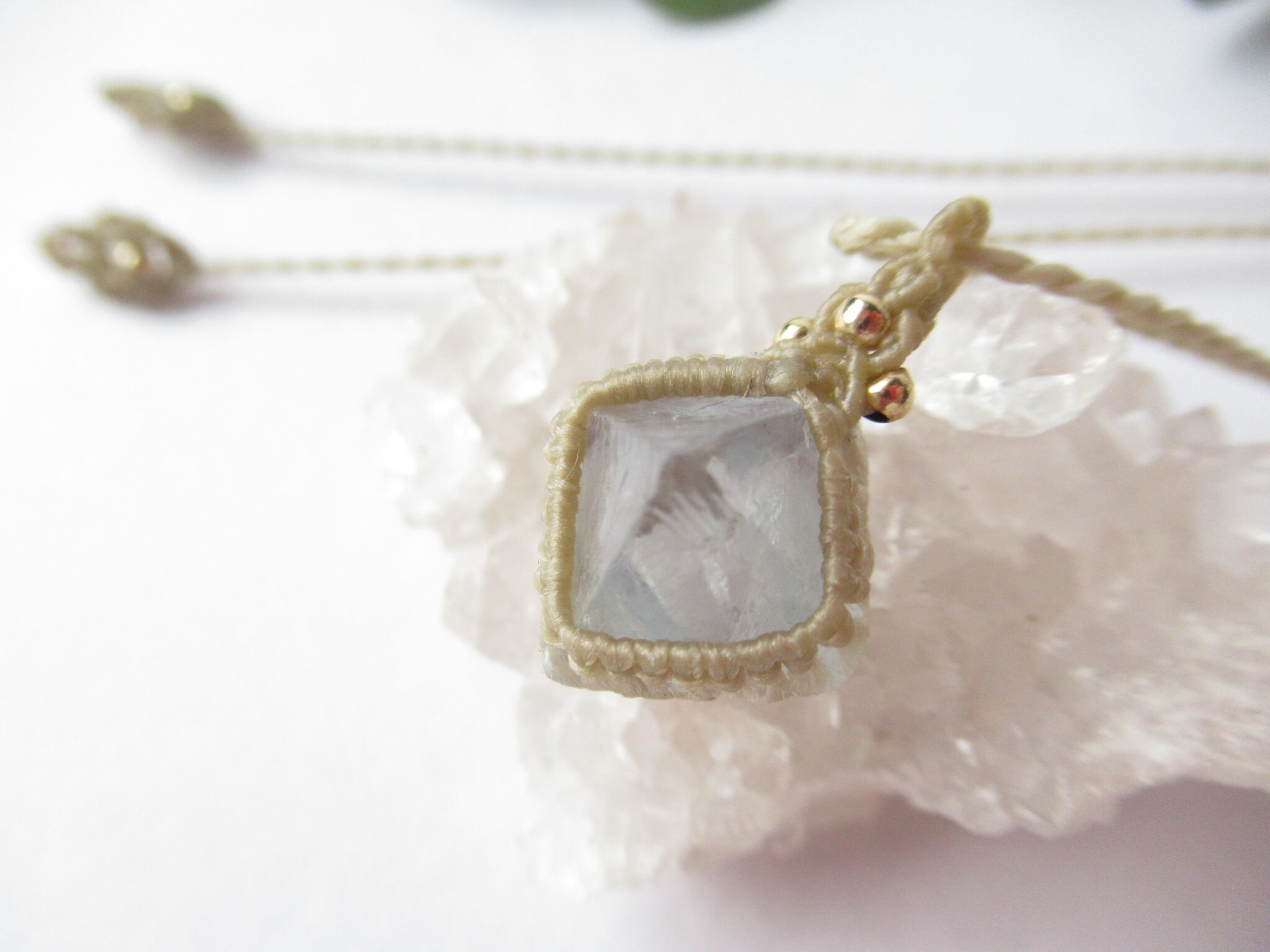 ミントブルーのフローライトの原石のマクラメペンダント / 0.25㎜仕上げ