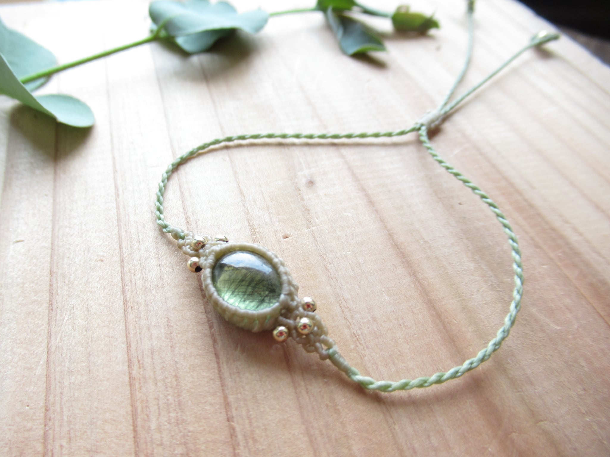左右をシンメトリーデザインで丁寧に編み上げ、ブレスレット紐をフォレストグリーンの糸にしております。
