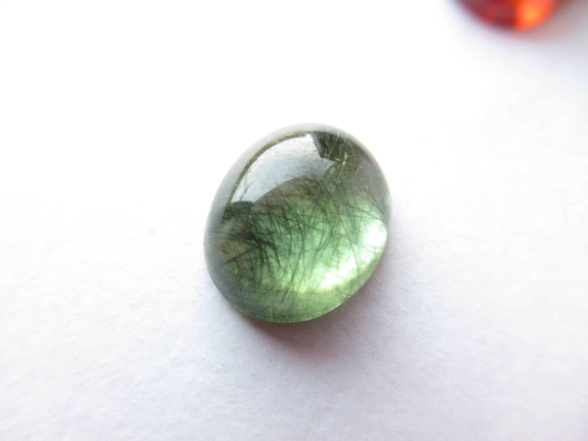 こちらはパキスタン産となります。小さめのルースとなるのですが、濃い目の深みのあるグリーンの中に針のようなルチルが内包されています。色合いも通常ペリドットというと若草色というイメージが強いのですが、こちらはダークグリーンを帯びたような落ち着いたお色です。