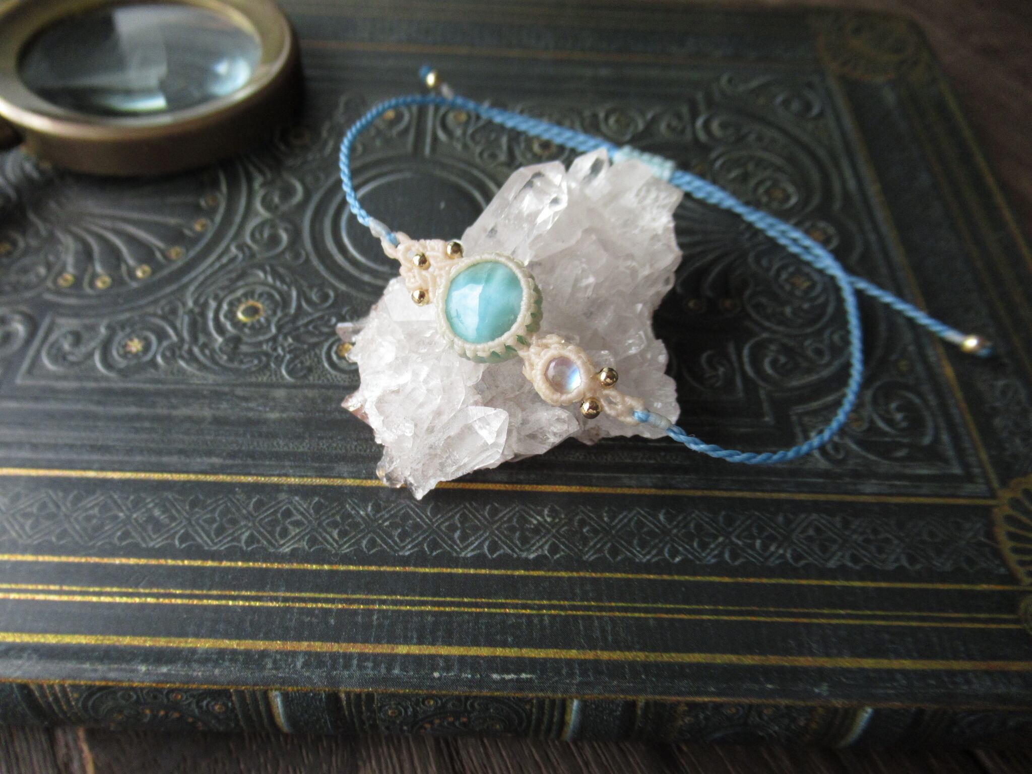 ころんとまあるい形のラリマーに、ブルーのシラーが見られるホワイトラブラドライトを組み合わせ、ブレスレットを仕立てました。