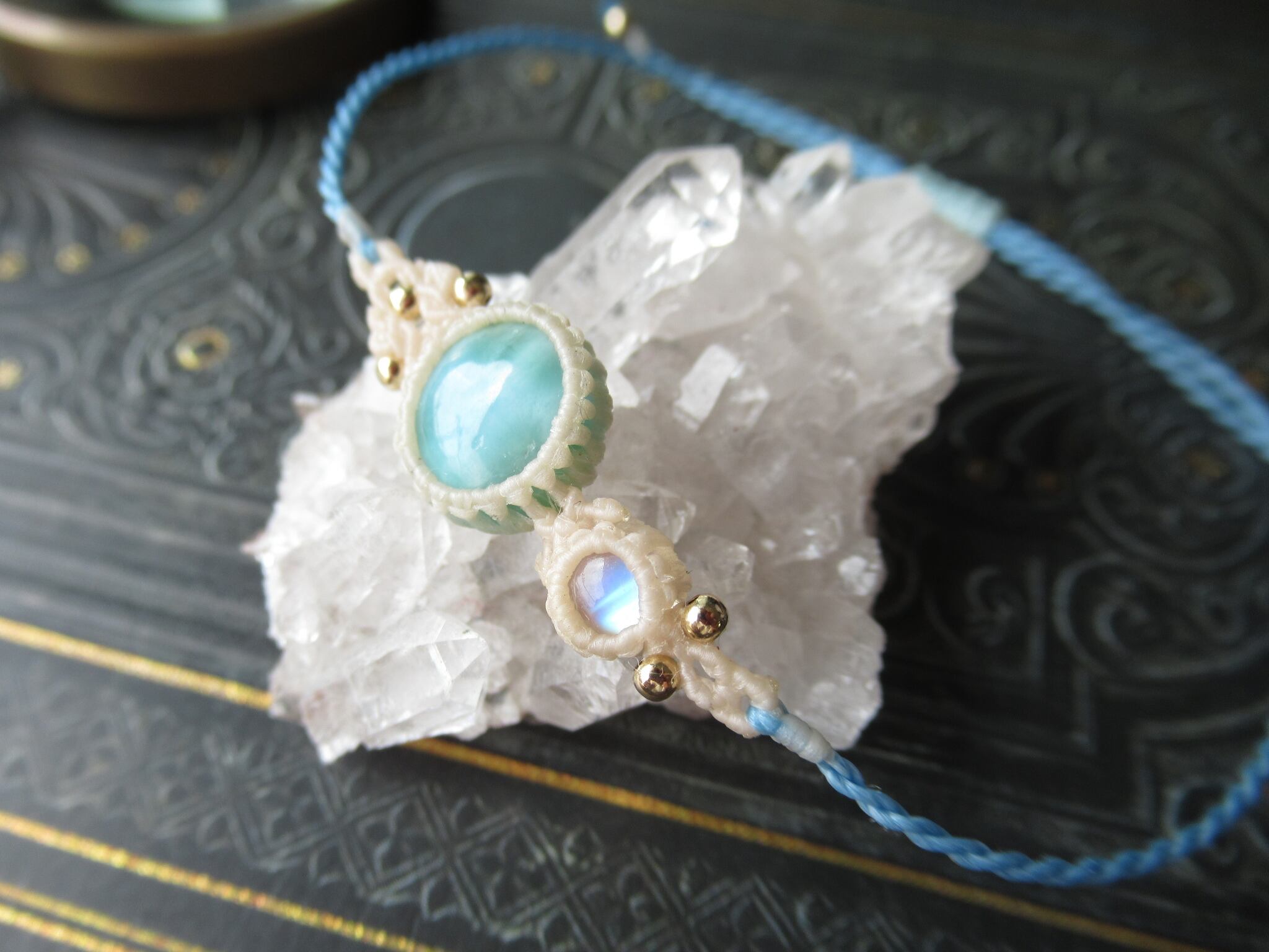 ブレスレットのリスト部分の紐をベビーブルーにしています。アシンメトリーのデザインや色合いのコントラストをお楽しみいただけましたら幸いです。