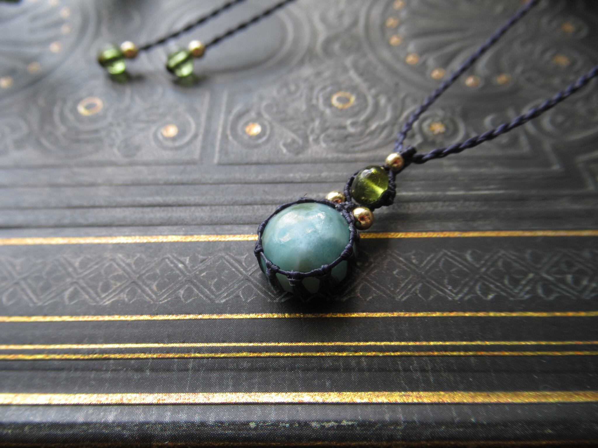 縁取りを透かし編みでしっかりと編み込み、ペンダントトップの部分に宝石質のグリーントルマリンをアクセントに致しました。ぷっくり感のある、渋めカラーのトルマリンもお楽しみいただけましたら幸いです。