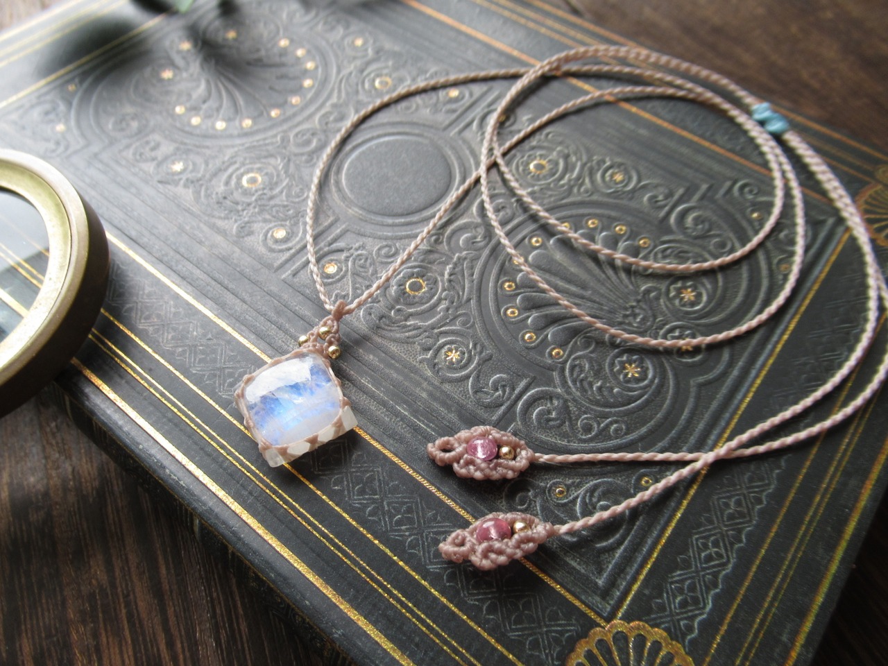 縁取りにかける糸の本数が少ない分、石をしっかりとホールドさせるのがとても難しいこの編み方ではありますが、光が石の中に通りやすいので、それぞれの天然石の固有の輝きや透明感をたっぷりお楽しみいただけるデザインになっています。