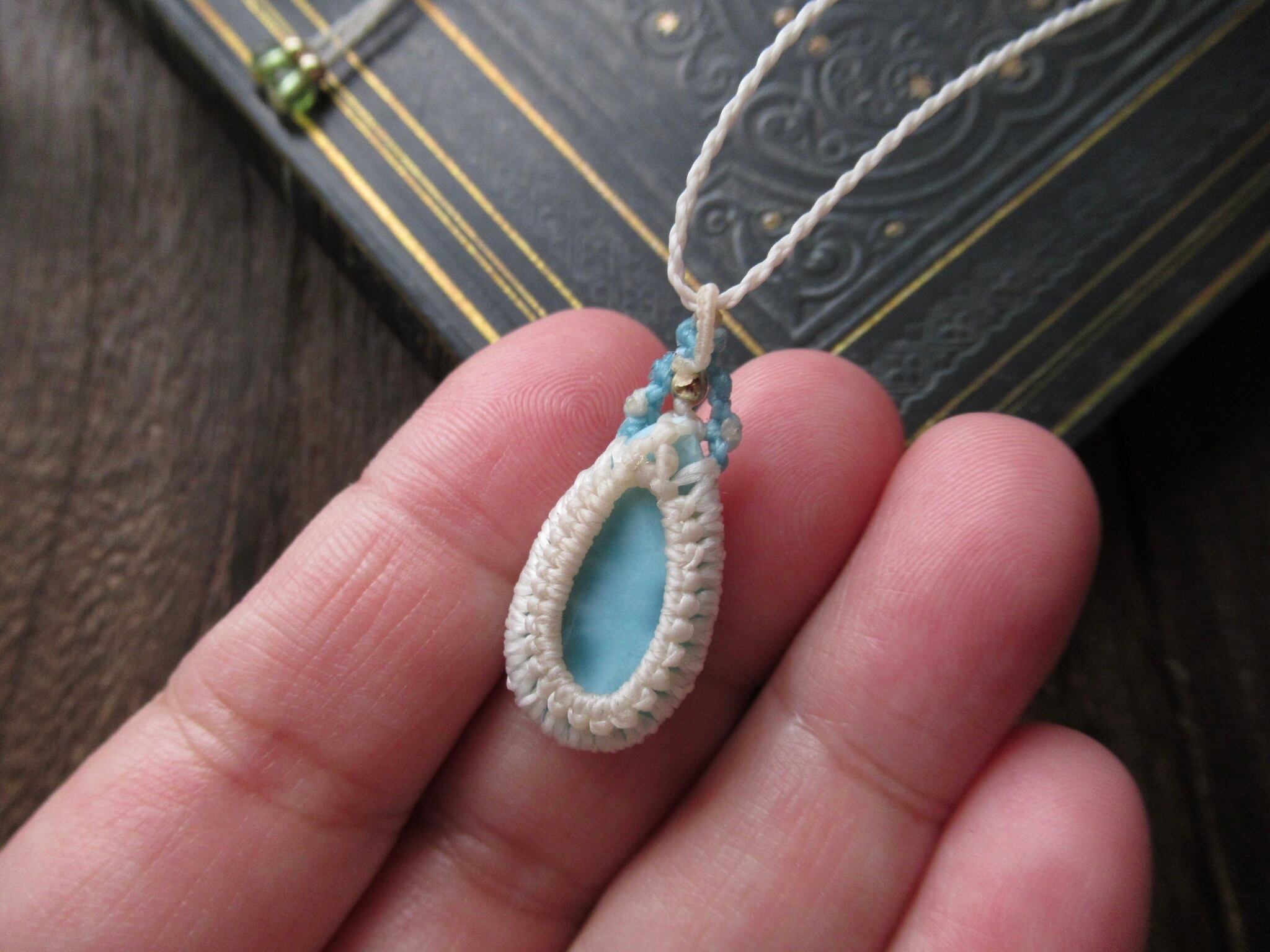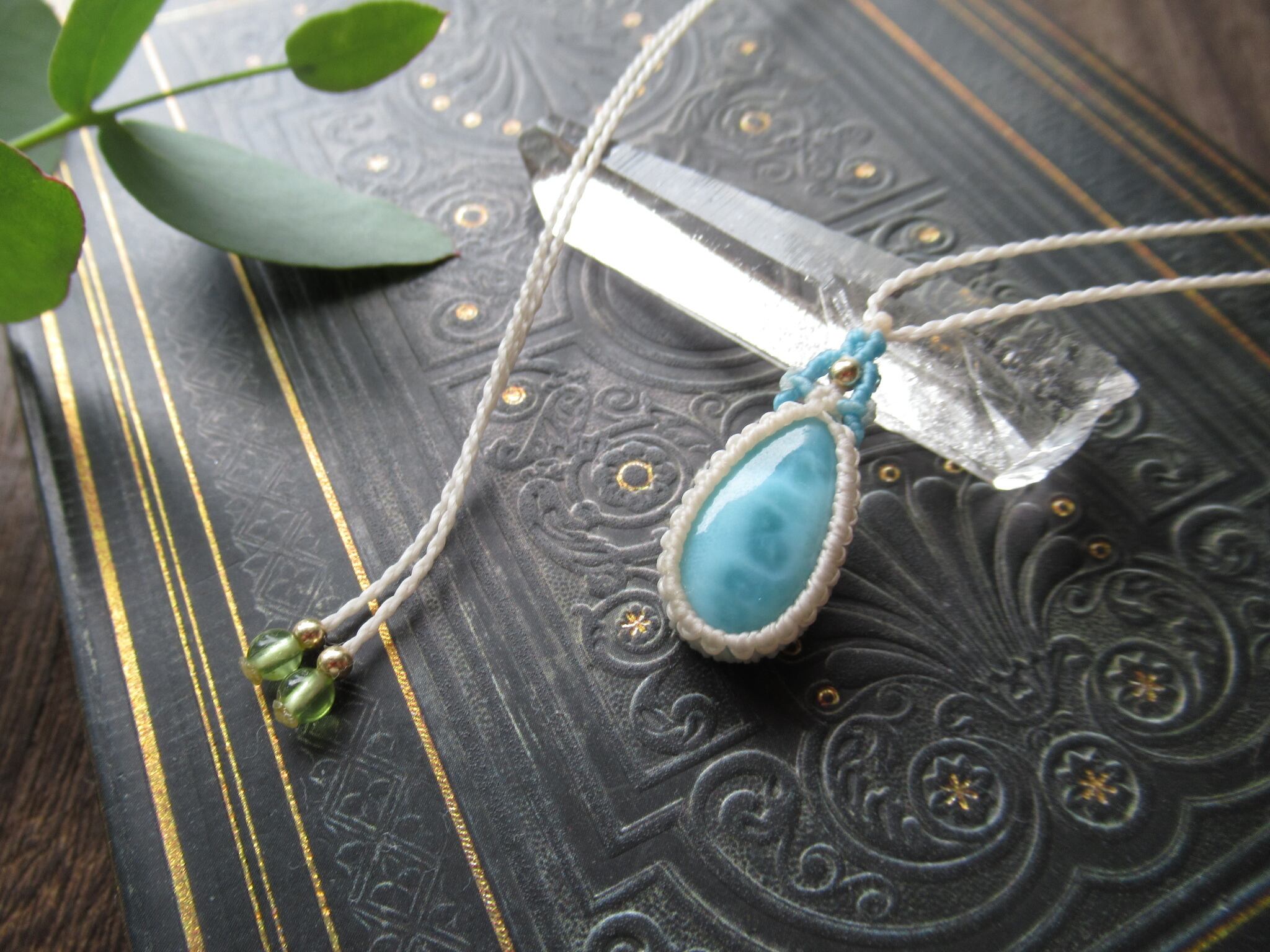 こちらの糸色は白ではなく、ややごく淡いイエローを引いているクリームバニラというお色になります。白色ですと汚れが目立ちやすかったりするのですが、こちらは真っ白に比べてややナチュラルなお色味なので、お顔周りに合いやすく肌色に合いやすいお色をしています。アクセントにラリマーと同じベビーブルーという名前の糸を編み込んでいます。また、ペンダントトップの編み込みにアクセントを編み込んで14kgfビーズで仕上げています。