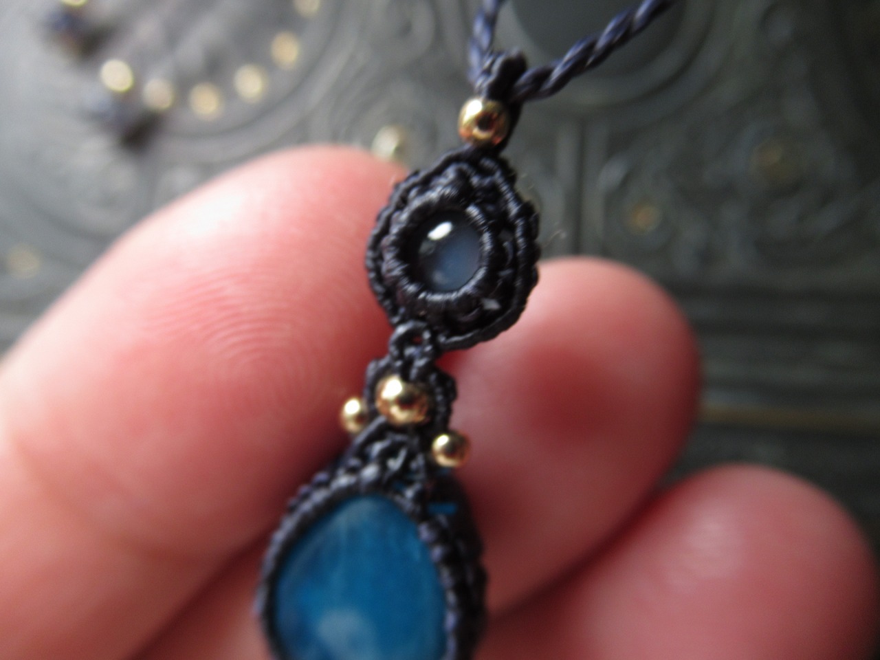 小粒ですが宝石質のムーンストーンとアパタイトを組み合わせ、縦長シルエットのペンダントに仕立てました。