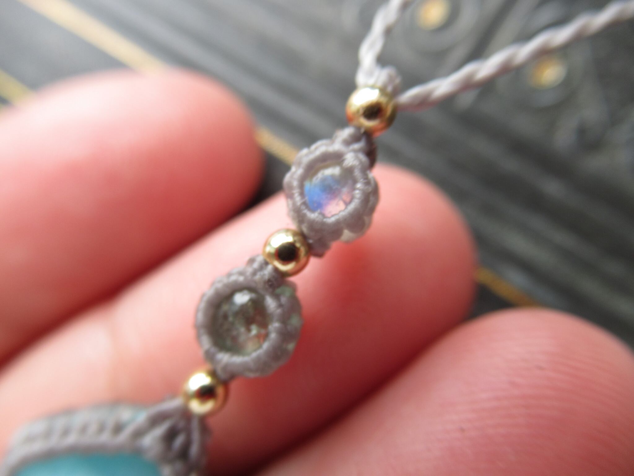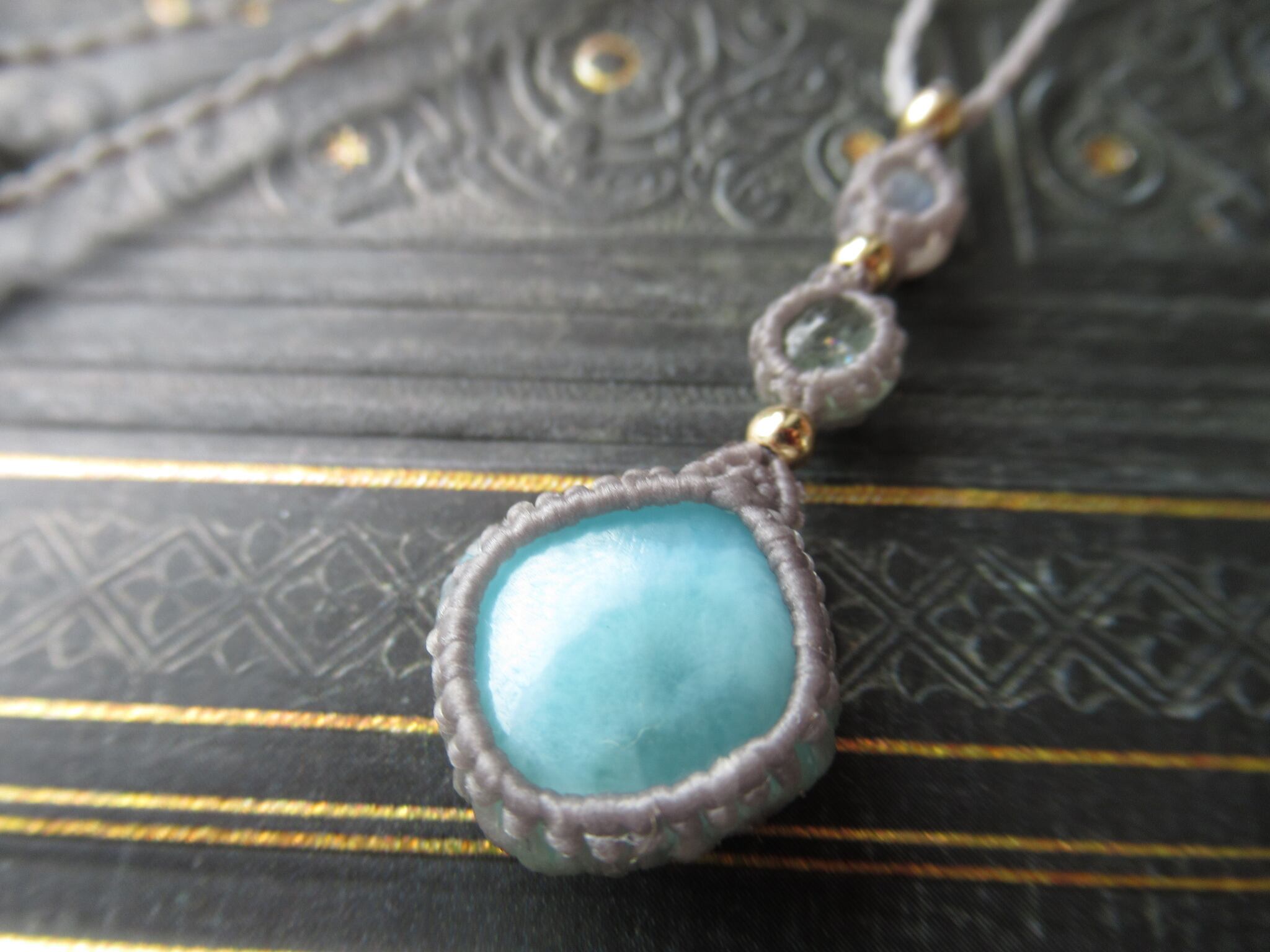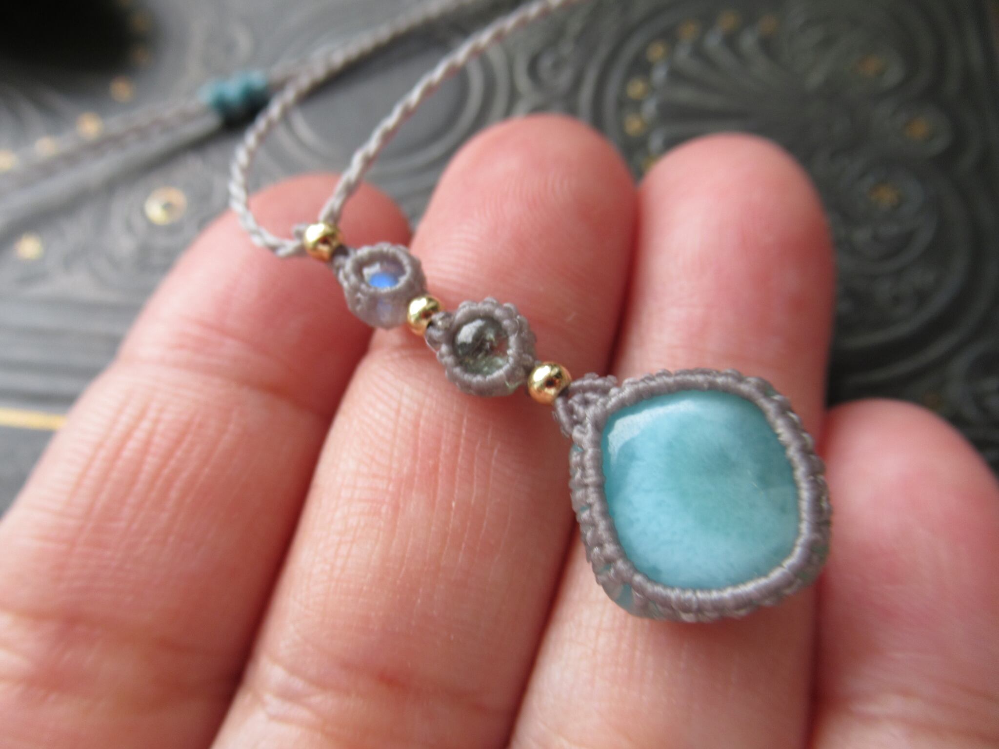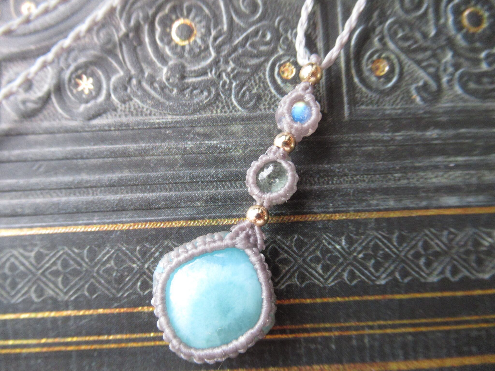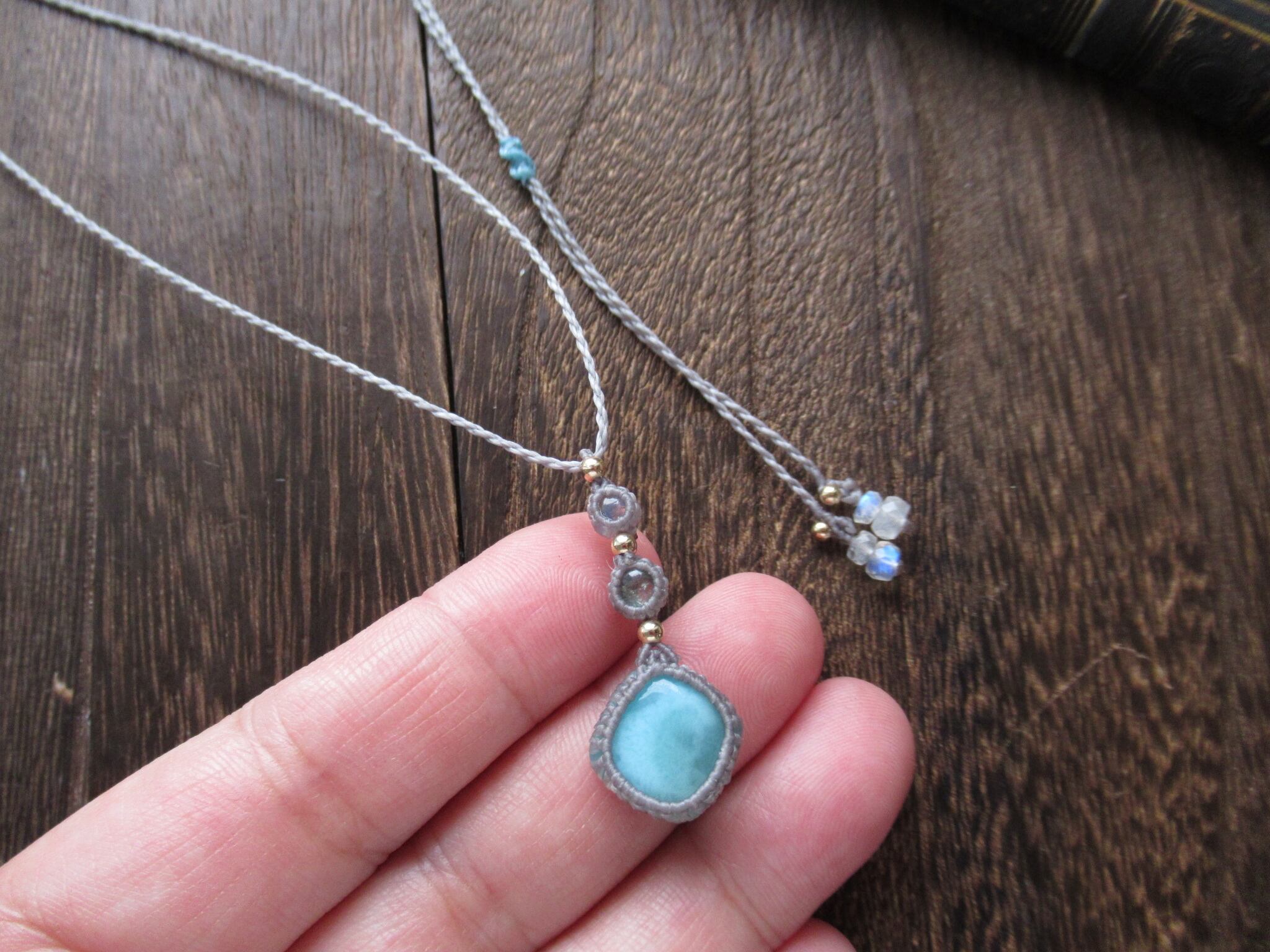 小さな石のペンダント/ ラリマー×ミントグリーントルマリン×ホワイトラブラドライトのマクラメペンダント