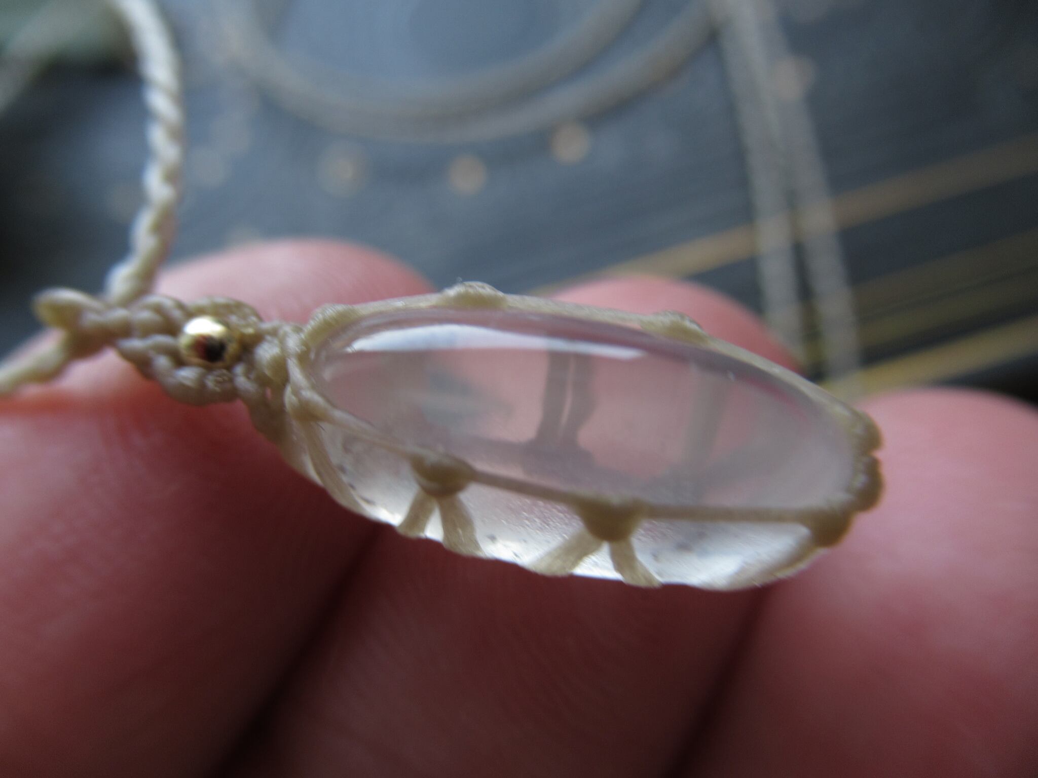 優しい光を纏ったとても美しいルースです。透明、というより薄っすら乳白色を帯びた上品な光沢感があります。ペンダント紐は背守りを編み込み、宝石質のオレンジサファイアを編み込んでいます。